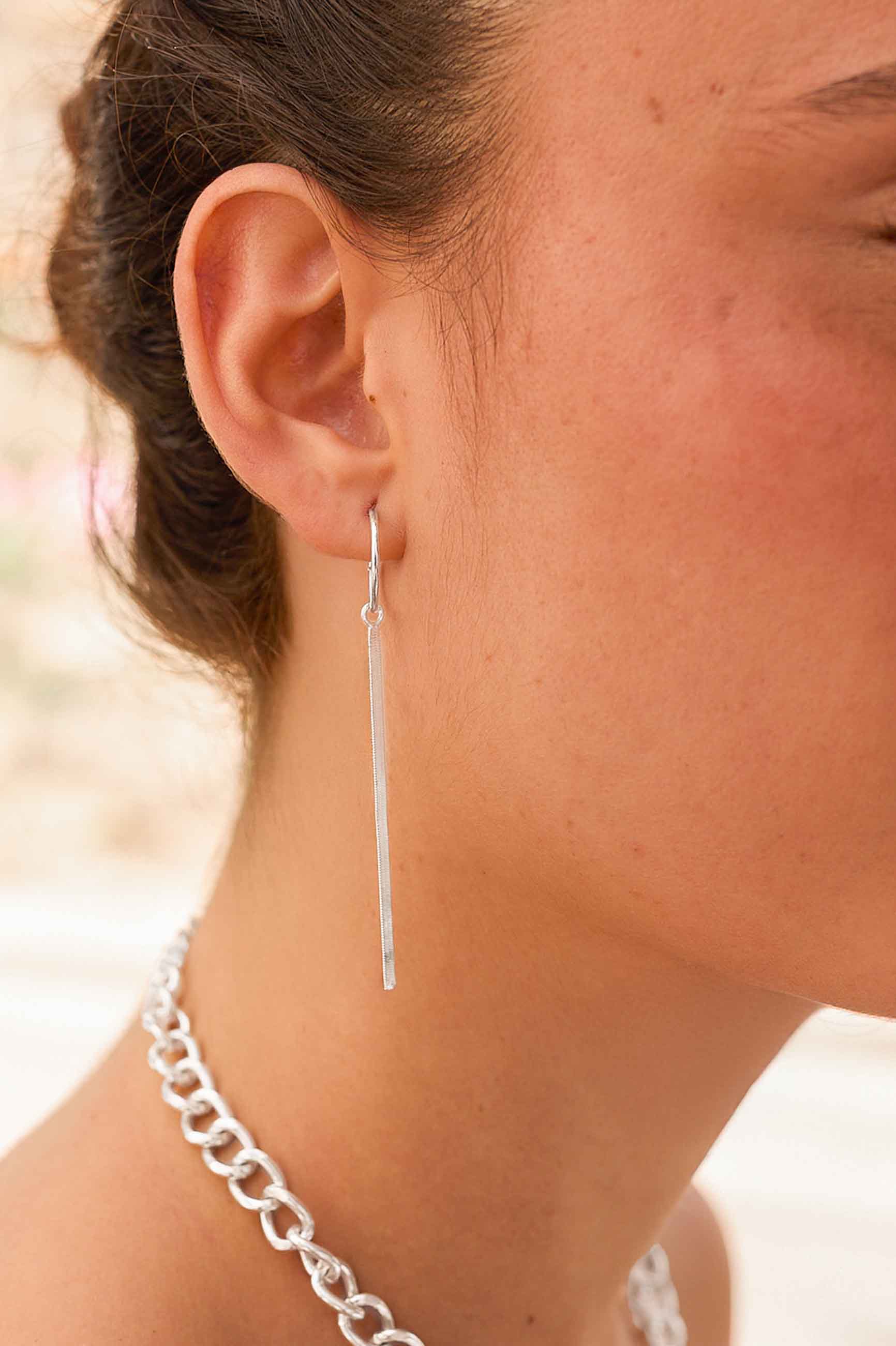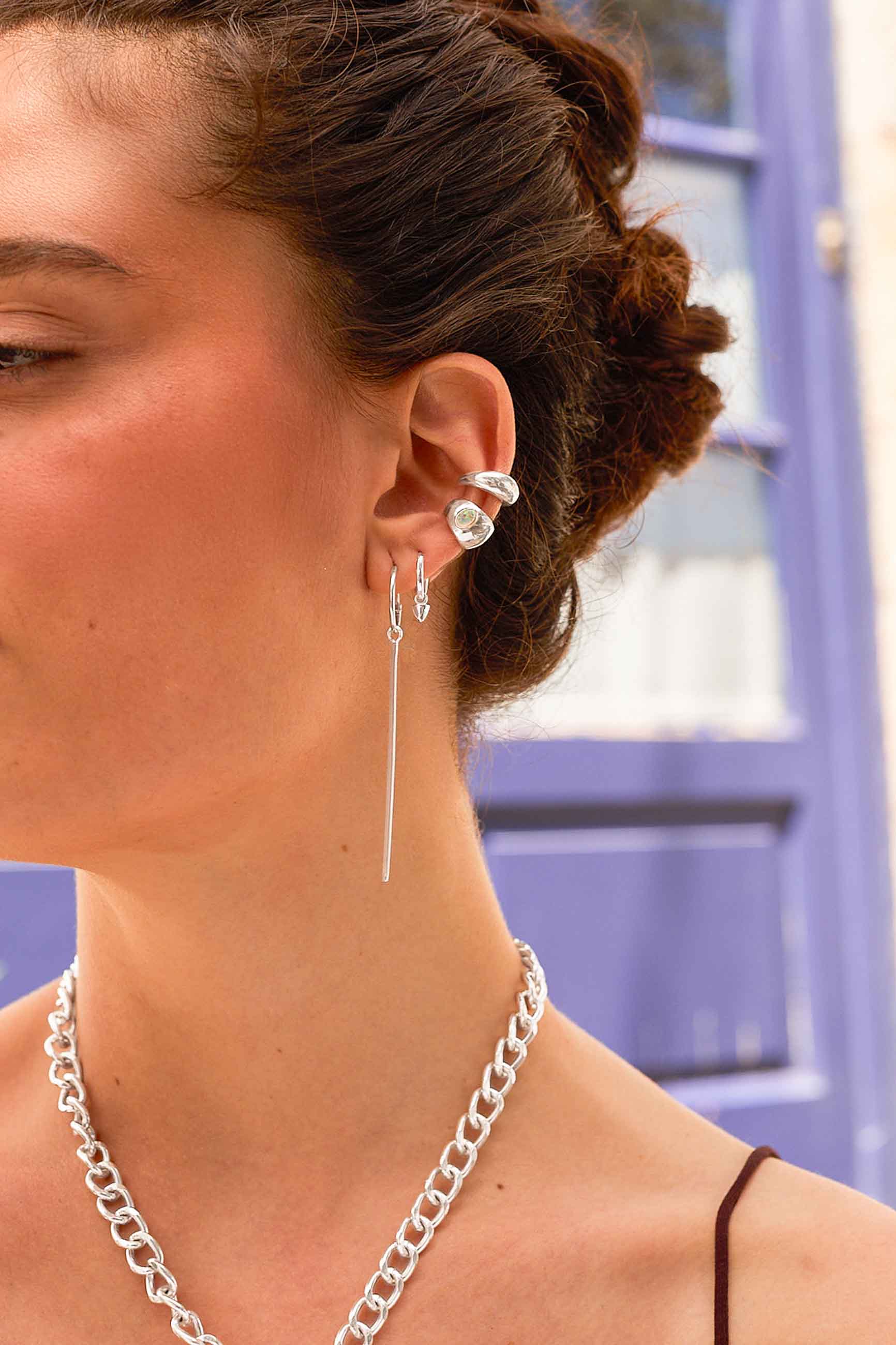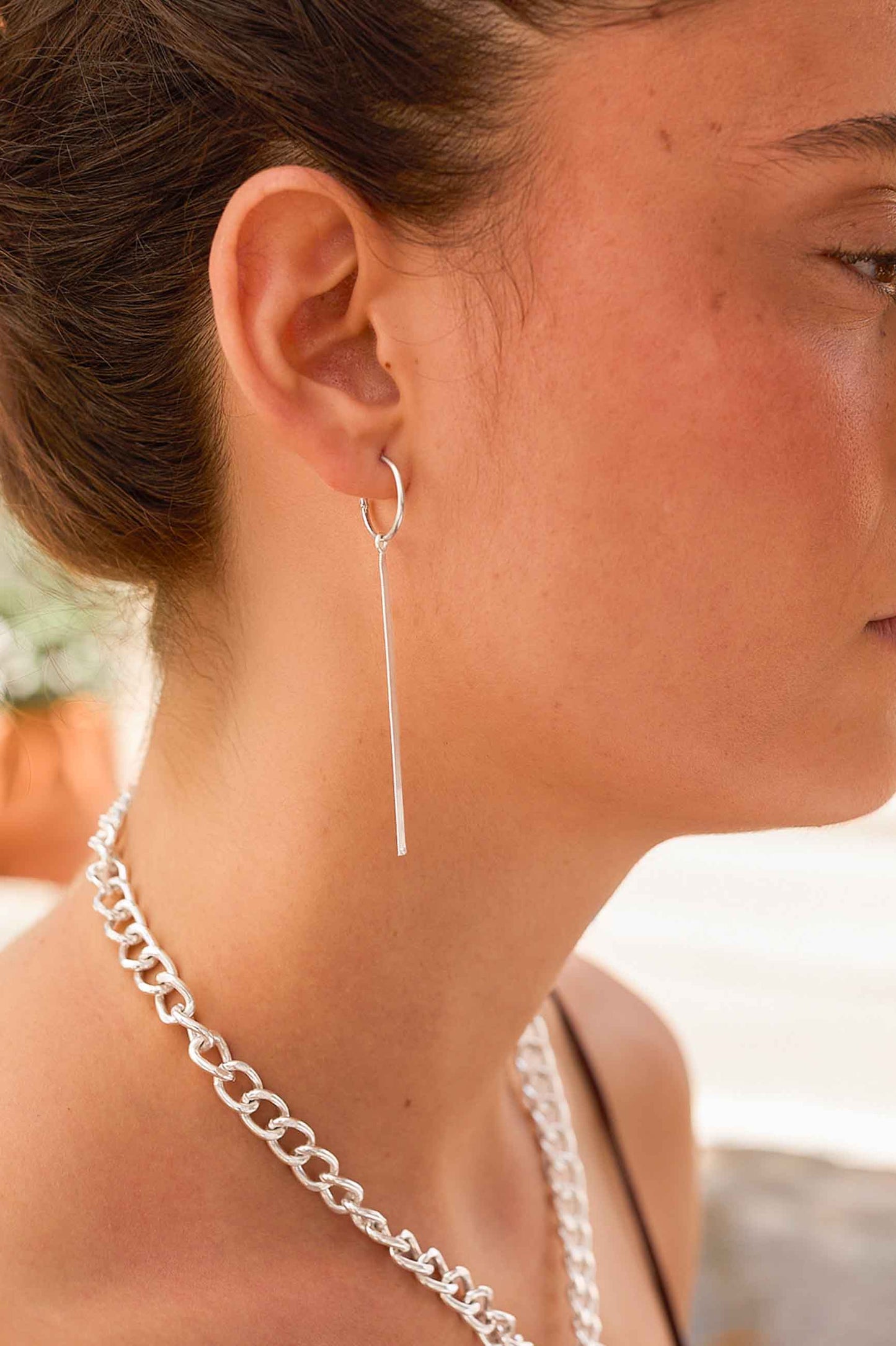 The BAHUT earring is an accessory designed to transform basic hoops into a more sophisticated and festive piece. It is made from 925 Sterling Silver and features a fine rolo chain that subtly hangs from the hoop, adding movement and shine.