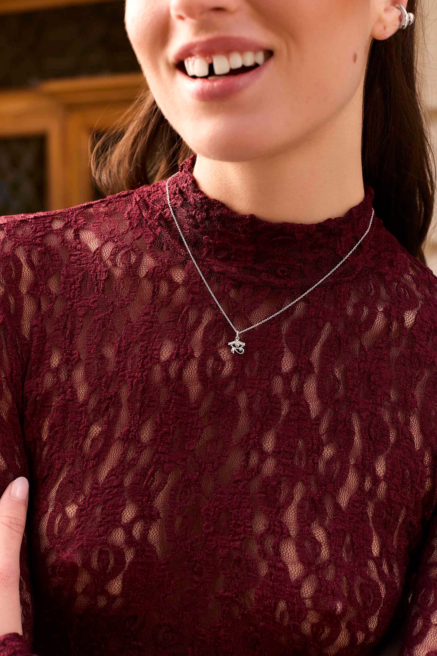 The GRANTHI necklace is made of a fine, thin chain and a pendant shaped like an Horus Eye. It is hand-finished with 925 Sterling Silver.