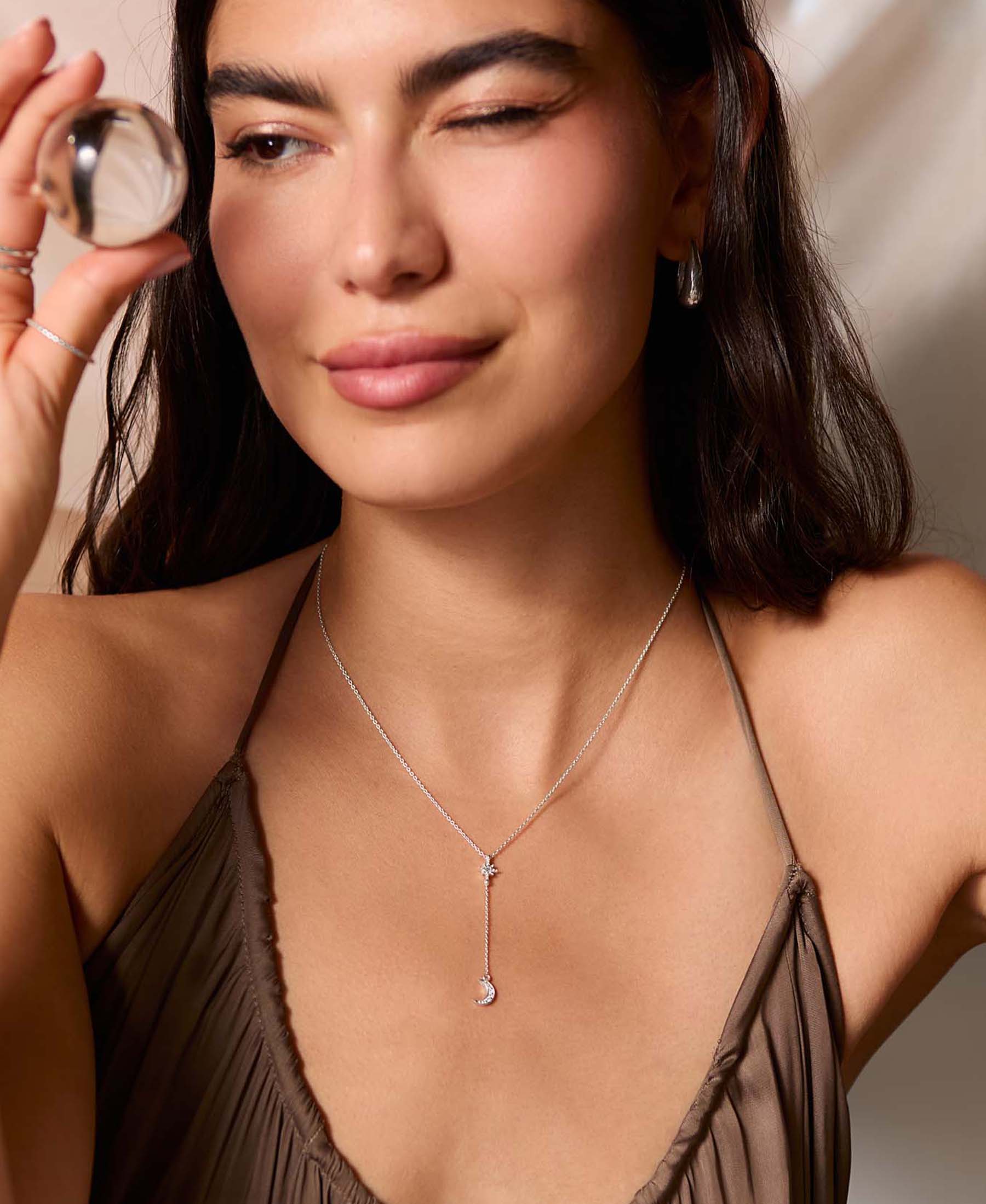 MOKSHA is a shiny necklace of 925 Sterling Silver with a very original design. Its chain is adjustable and is formed by a star from which hangs a moon, both with beautiful zircons embedded. It will look great!