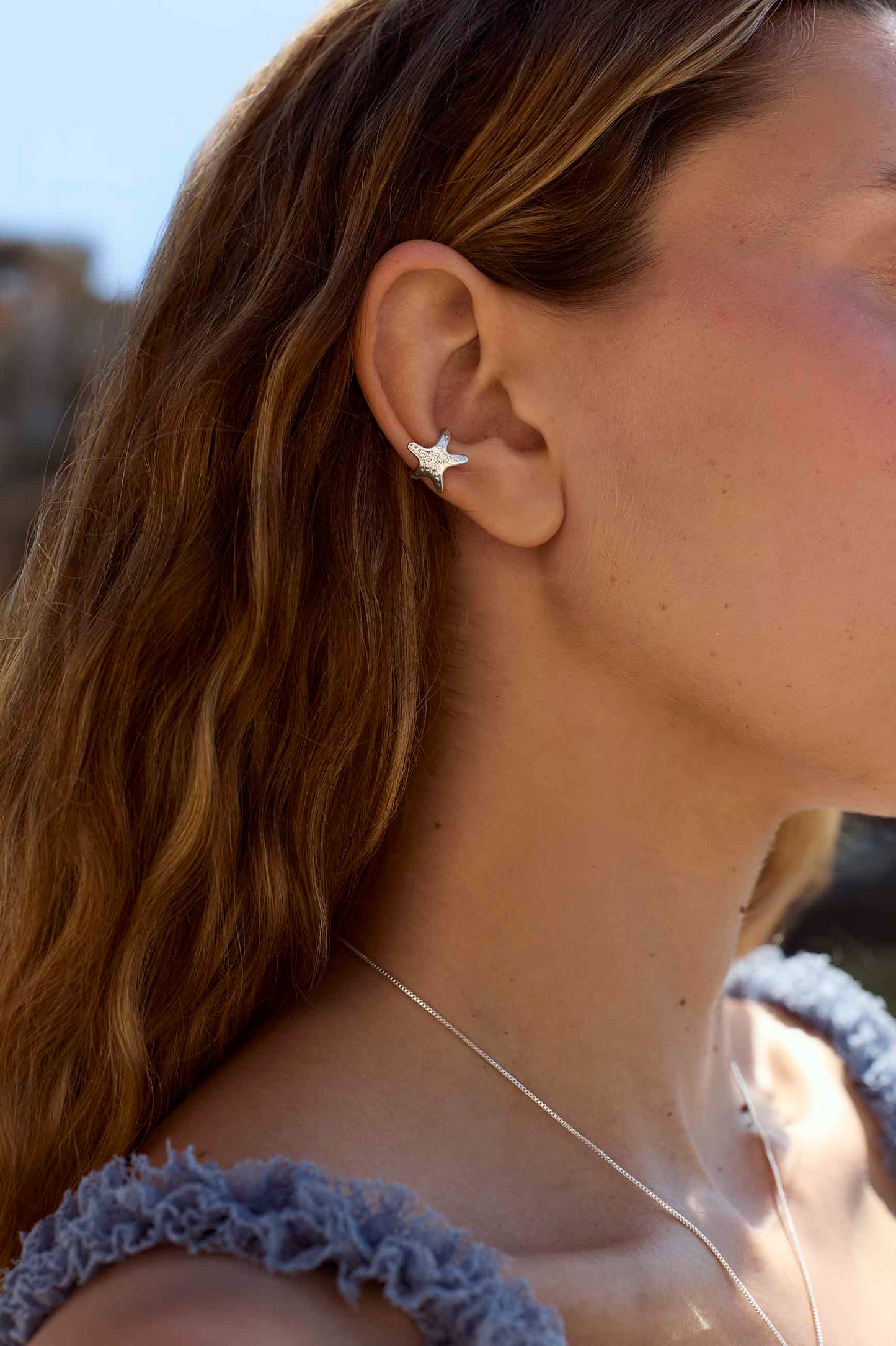 The TARAMACHALE right ear cuff is designed in the shape of a starfish – a fun and bold figure. Made from 925 Sterling Silver and crafted in Spain, it fits mid-ear without the need for a piercing.