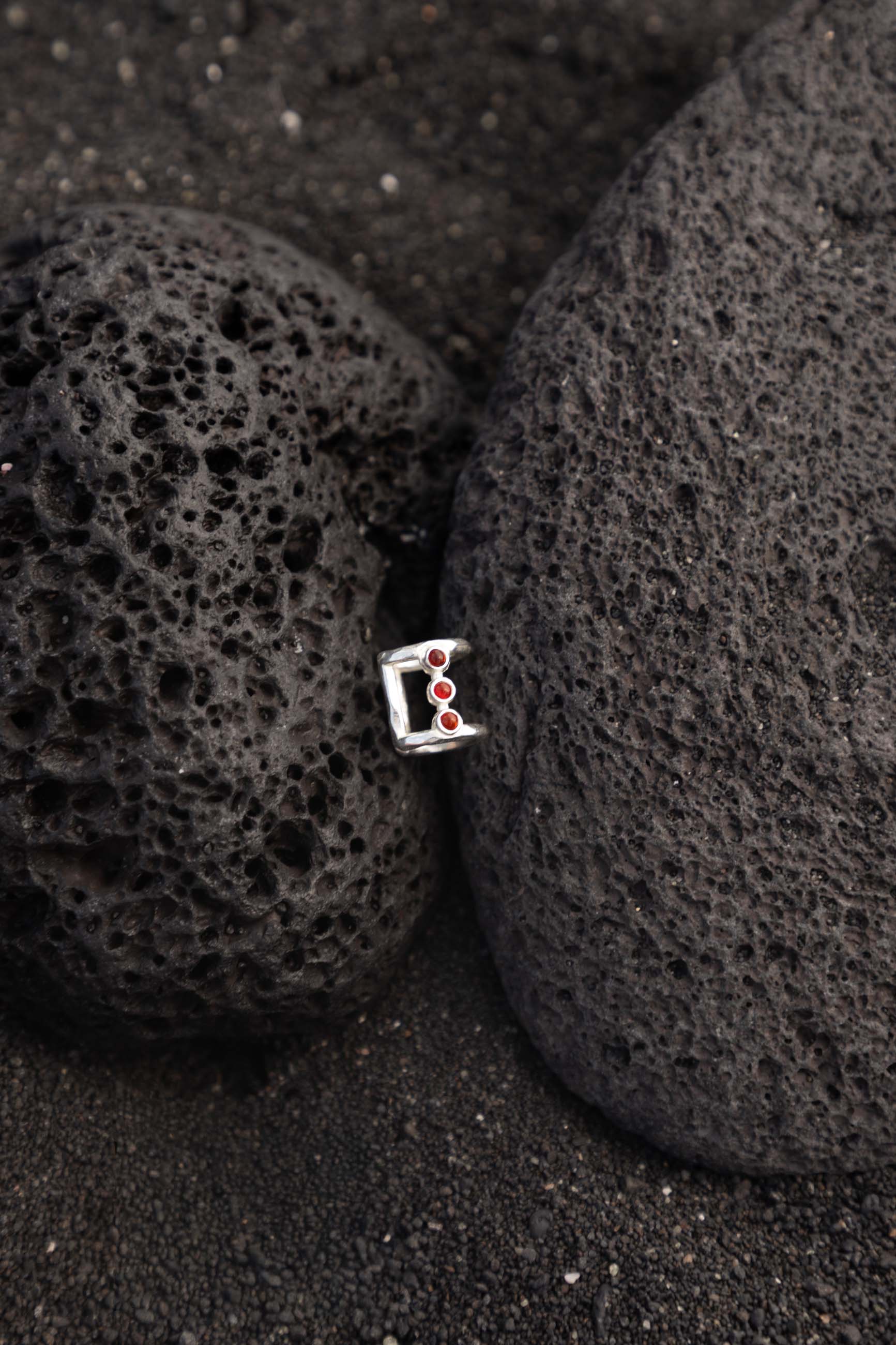 The Tesit Ear Cuff is made of 925 sterling silver and decorated with three natural carnelian stones. Its adjustable design with textured arms and ethnic aesthetic makes it a versatile and striking piece, ideal for those looking for an original earring without the need for additional piercing.
