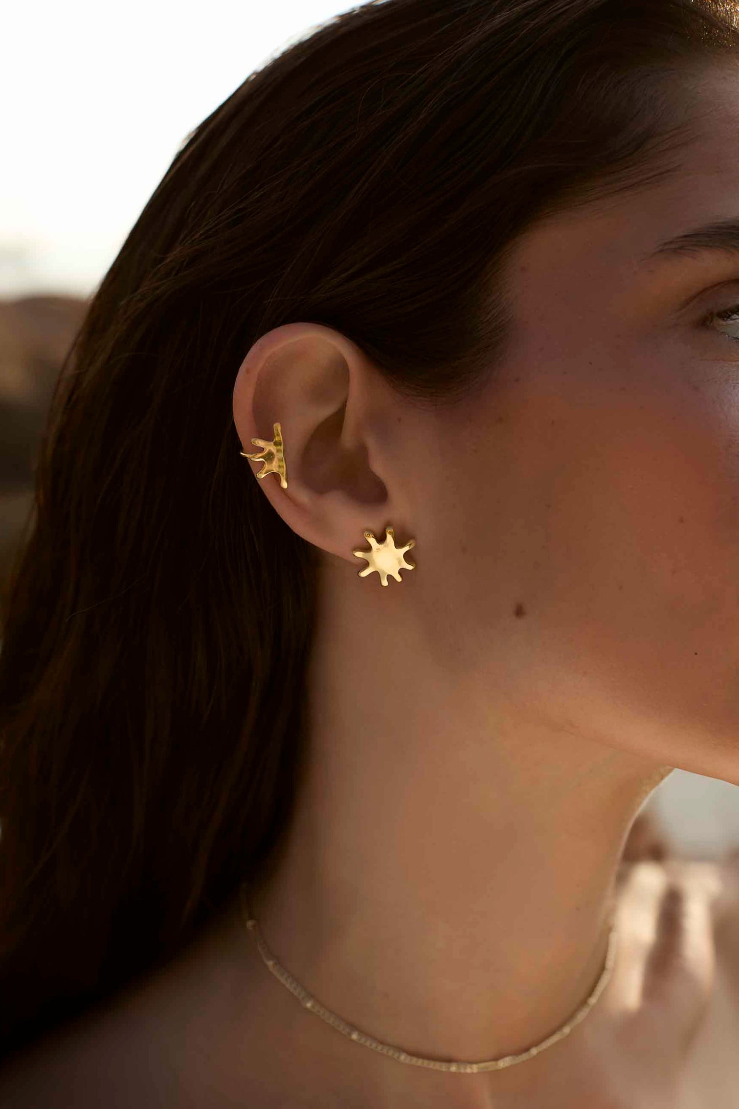 The BHOR earring in gold for the right ear features an organic aesthetic with sun-inspired details and a fluid combination of stud and ear cuff.