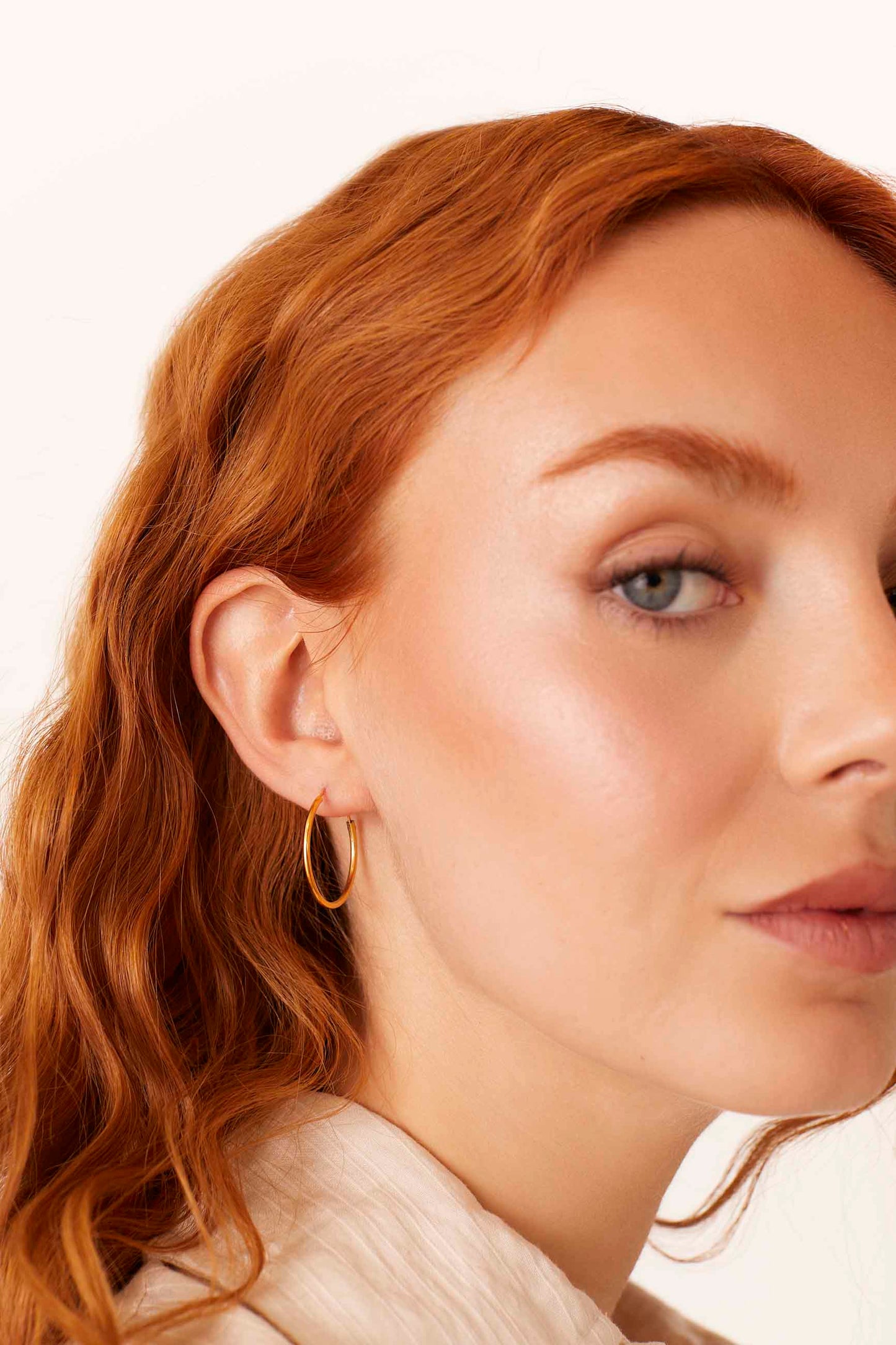 The JIVANA GOLD are completely plain earrings, that go great with other gold earrings and smaller hoops. They're ideal for the first hole. We have the same design in different sizes: JIVANA GOLD (10mm), JIVANA GOLD (12mm), JIVANA GOLD (16mm) and JIVANA GOLD (25mm).