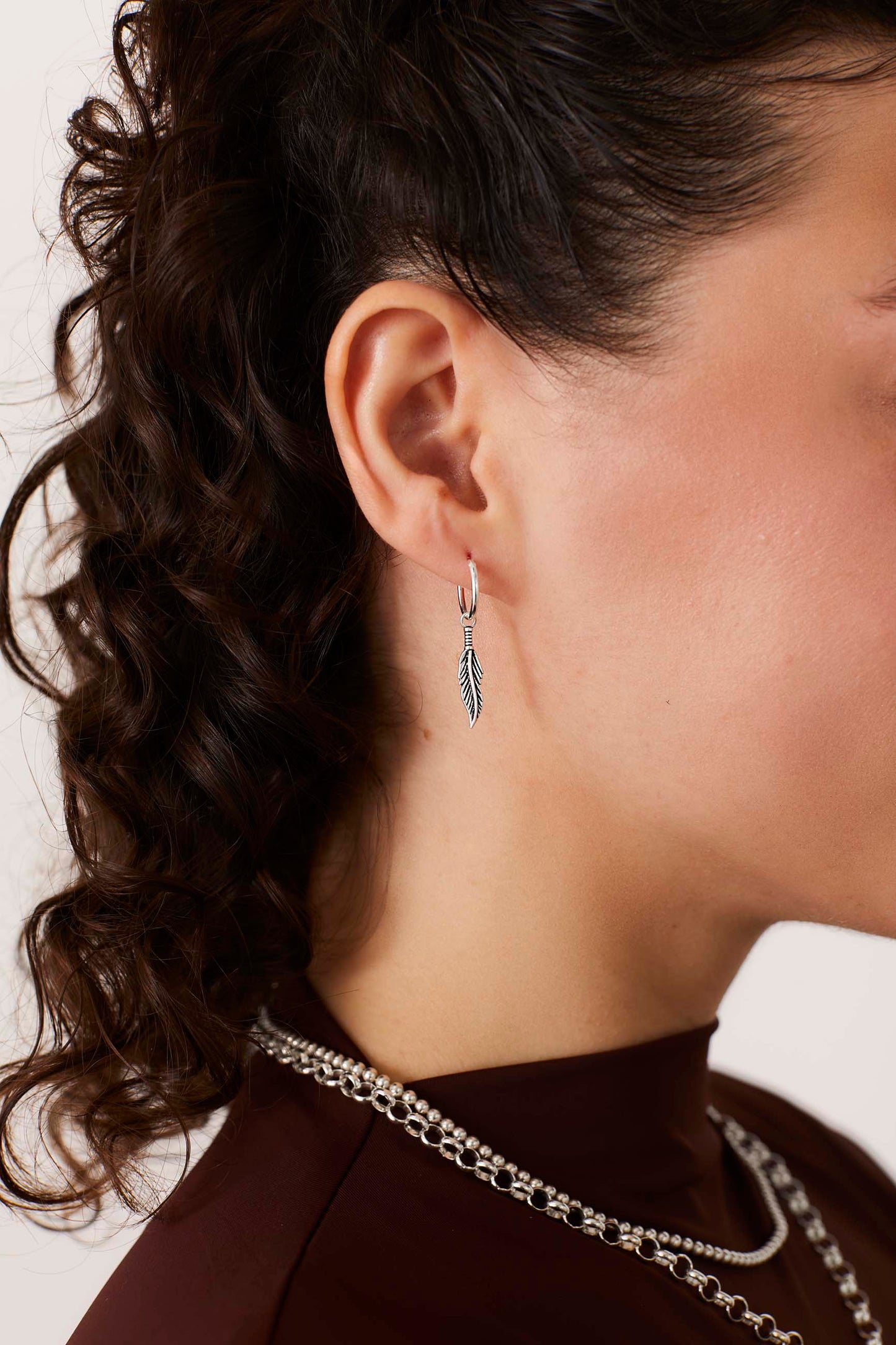 The VARALI earrings are plain 12mm diameter earrings with a fine feather hanging from the hoop. These feather earrings have a very careful design and a very nice contrast.