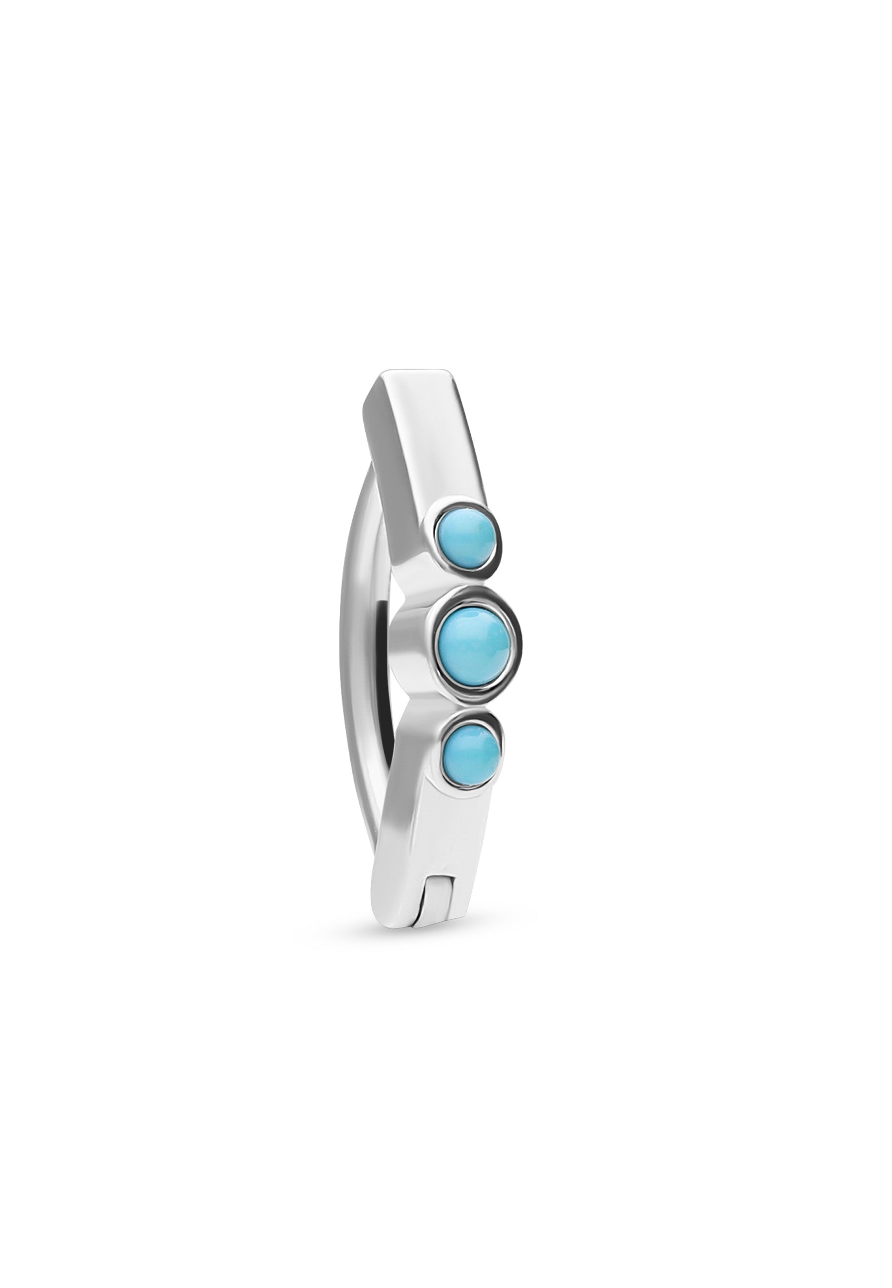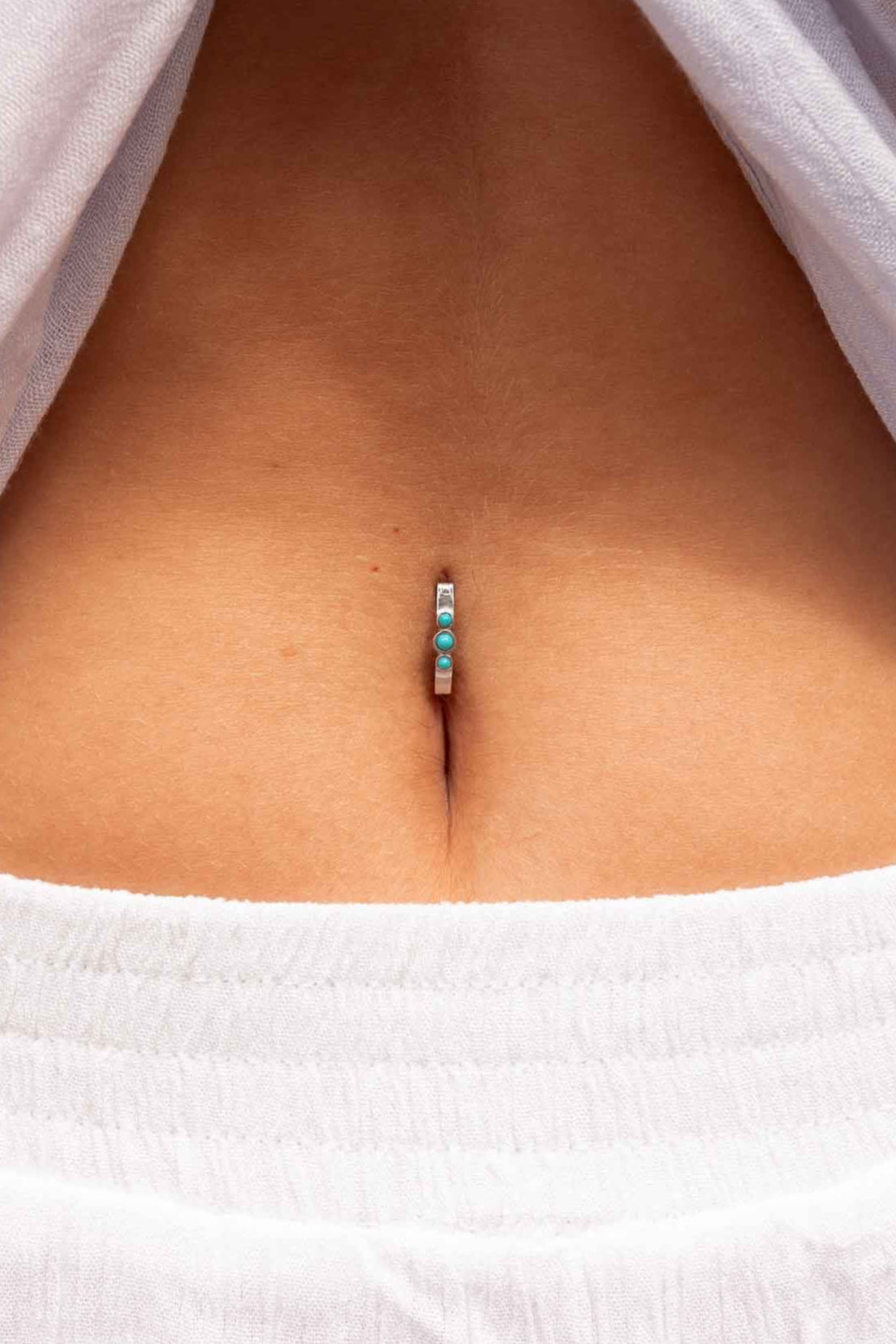 What makes it unique is its decoration with natural Larimar stone, a bluish gem that evokes the sea and summer. Its presence brings freshness and personality, making it the perfect piercing for warm months or for those seeking a piece filled with natural and positive energy.