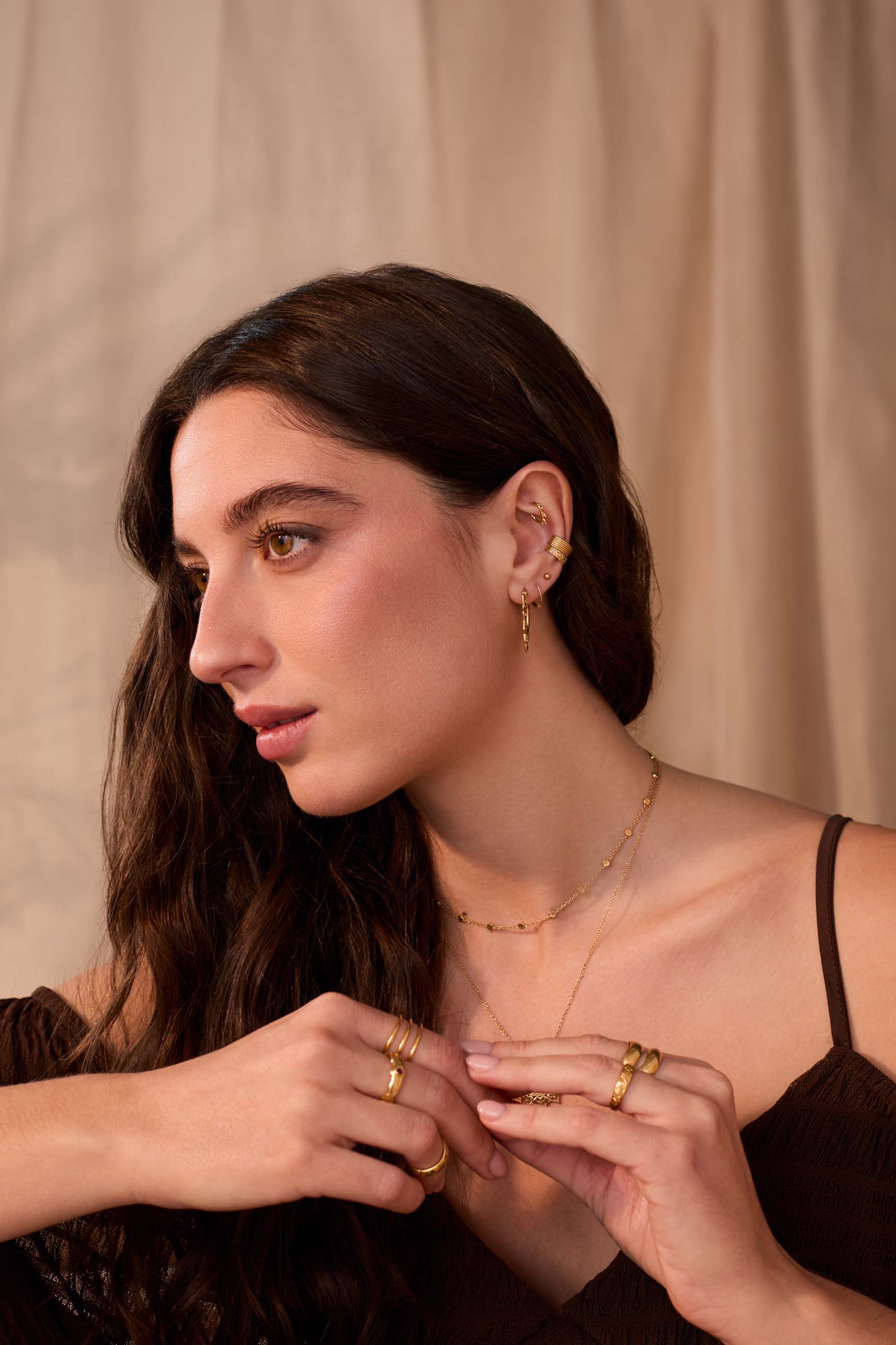 El piercing tiene un diseño de estilo étnico elaborado en Plata de Ley 925 y bañado en oro de 22K. Es perfecto para llevar en el lóbulo, hélix y contrahélix.