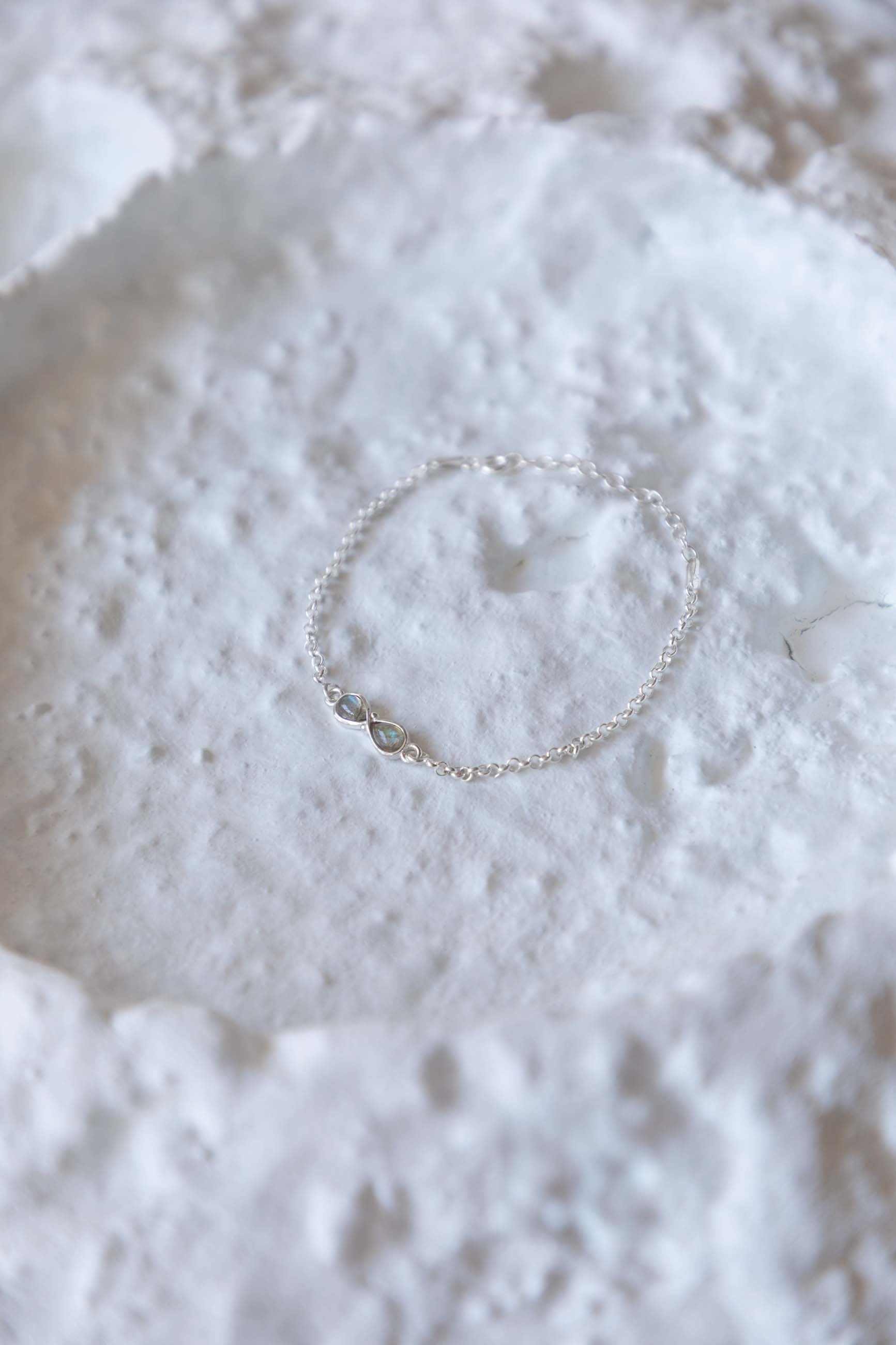 La pulsera SITA está inspirada en la eternidad. La pulsera consta de una cadenita fina y el símbolo del infinito con la piedra labradorita en su interior.