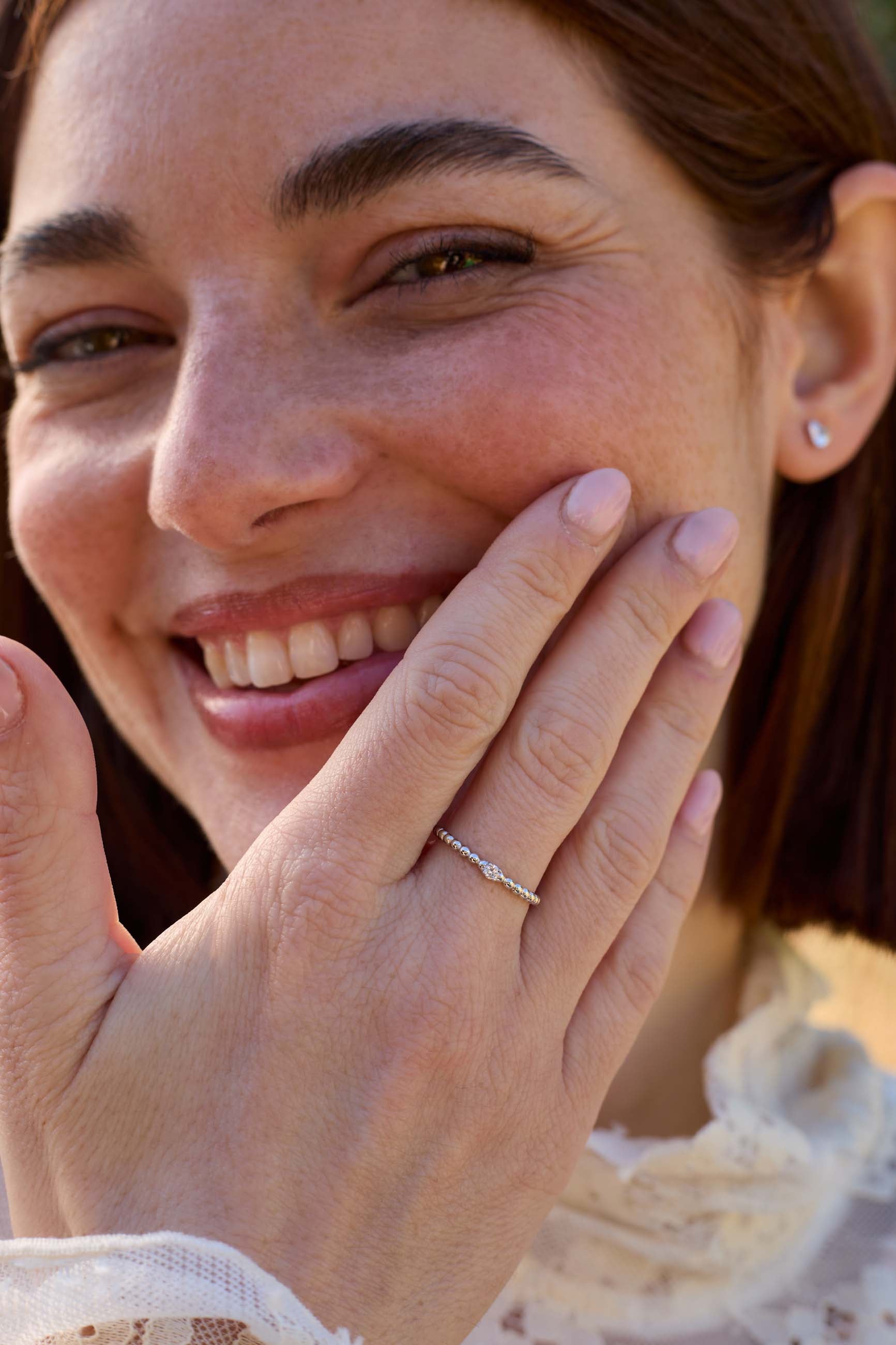 La combinaison de l'or blanc 9 carats avec les petites bosses crée un contraste fascinant et élégant. L'or blanc doux et lumineux constitue la toile de fond parfaite pour mettre en valeur la beauté du diamant au centre, tandis que les picots ajoutent une touche de texture et de piquant qui rend cette bague vraiment spéciale.