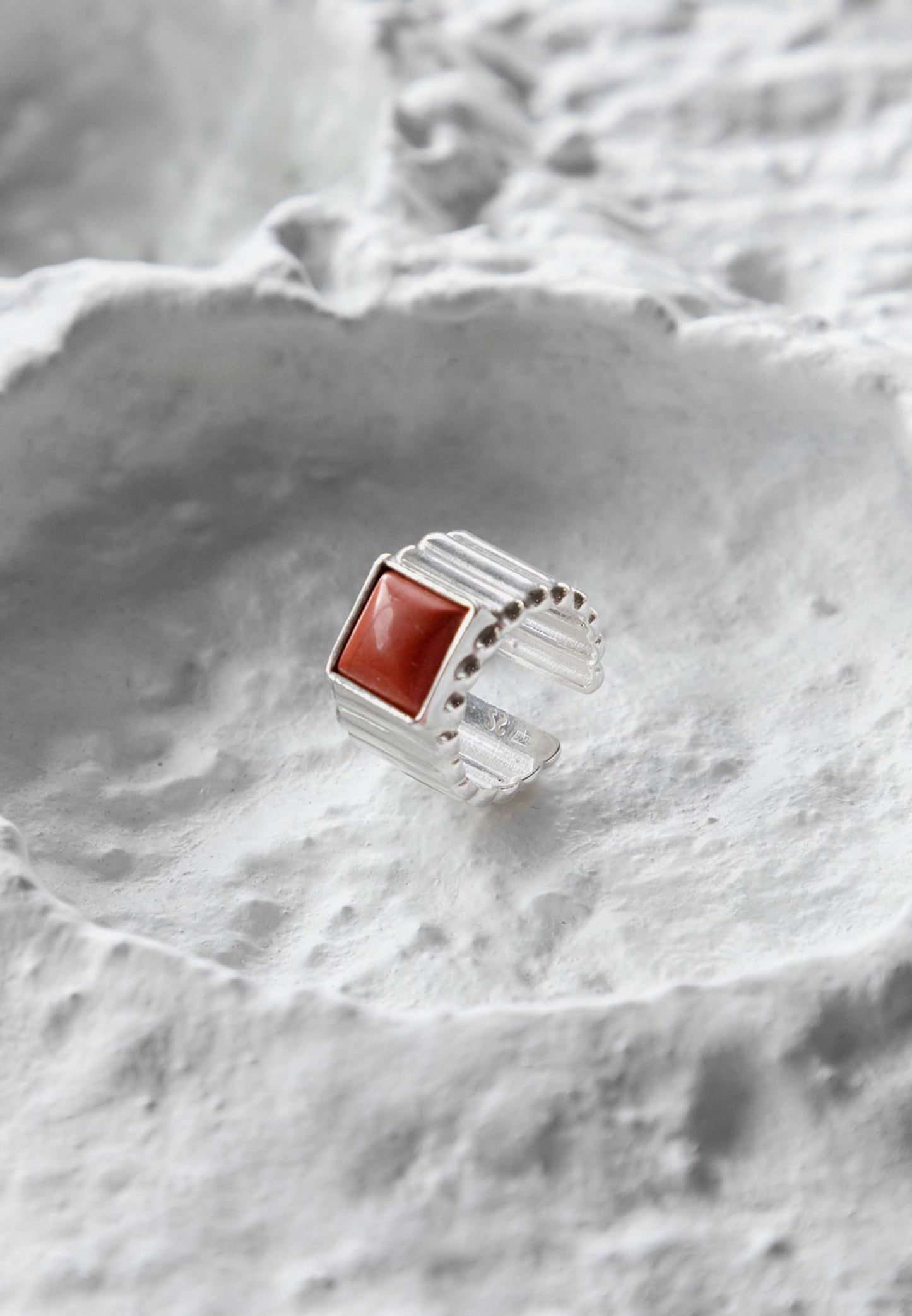Cette bague en argent avec jaspe rouge est un bijou qui fusionne le design contemporain avec du sens, idéal pour celles qui veulent se démarquer avec un style fort et plein de caractère.