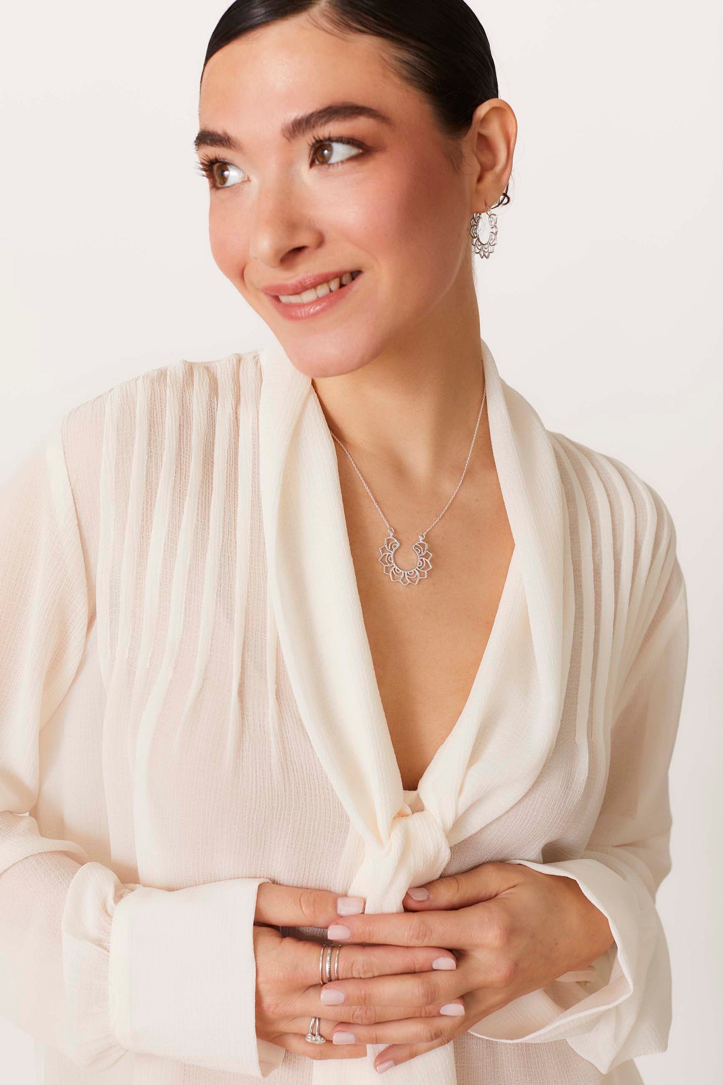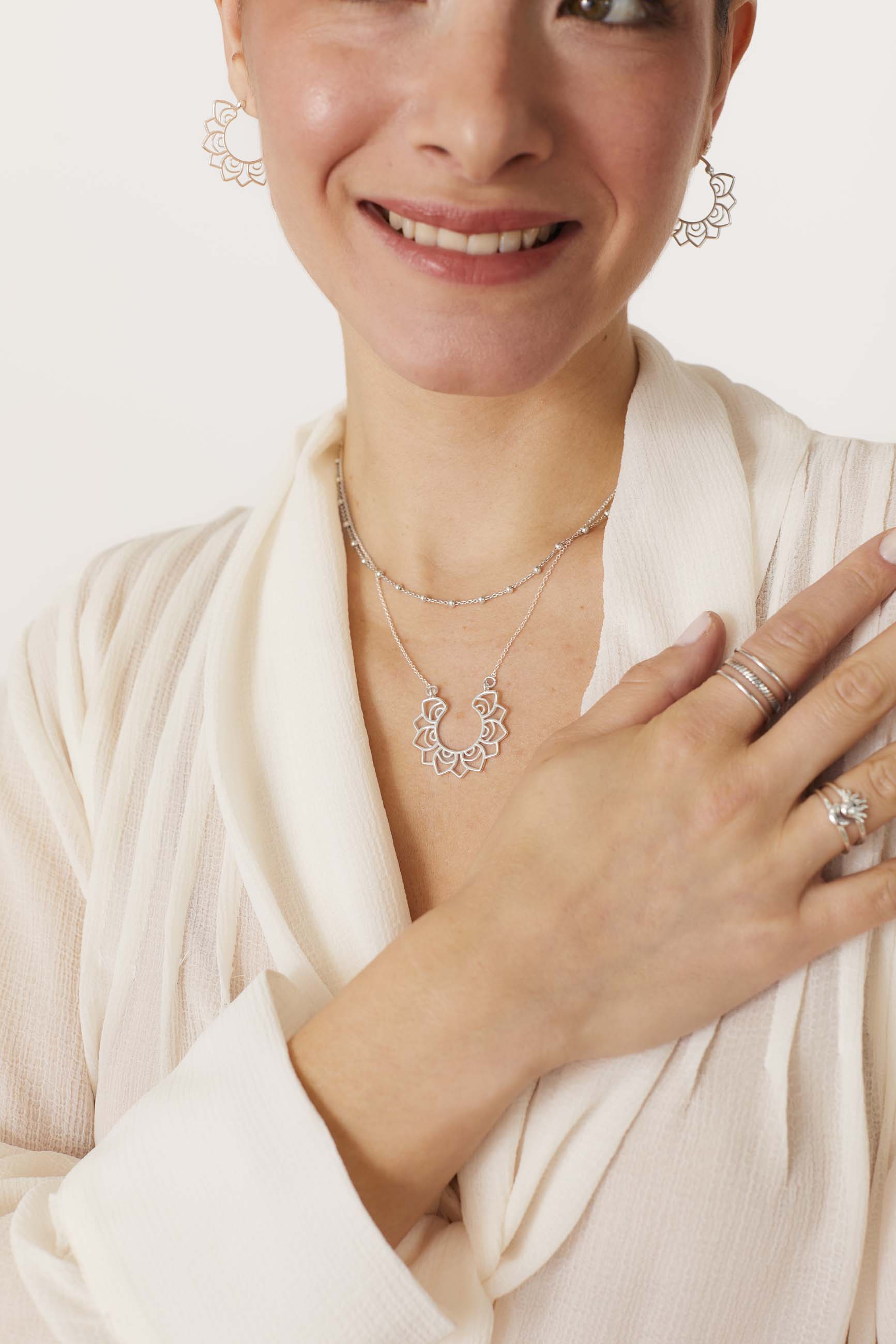 Le collier HEMA est un collier en forme de mandala, composé de fines bandes d'Argent Sterling 925 qui dessinent des silhouettes de mandalas. Ce bijou super spécial et magnifique stylise et donne beaucoup de vie. Il ajoute une touche d'élégance à n'importe quel look!
