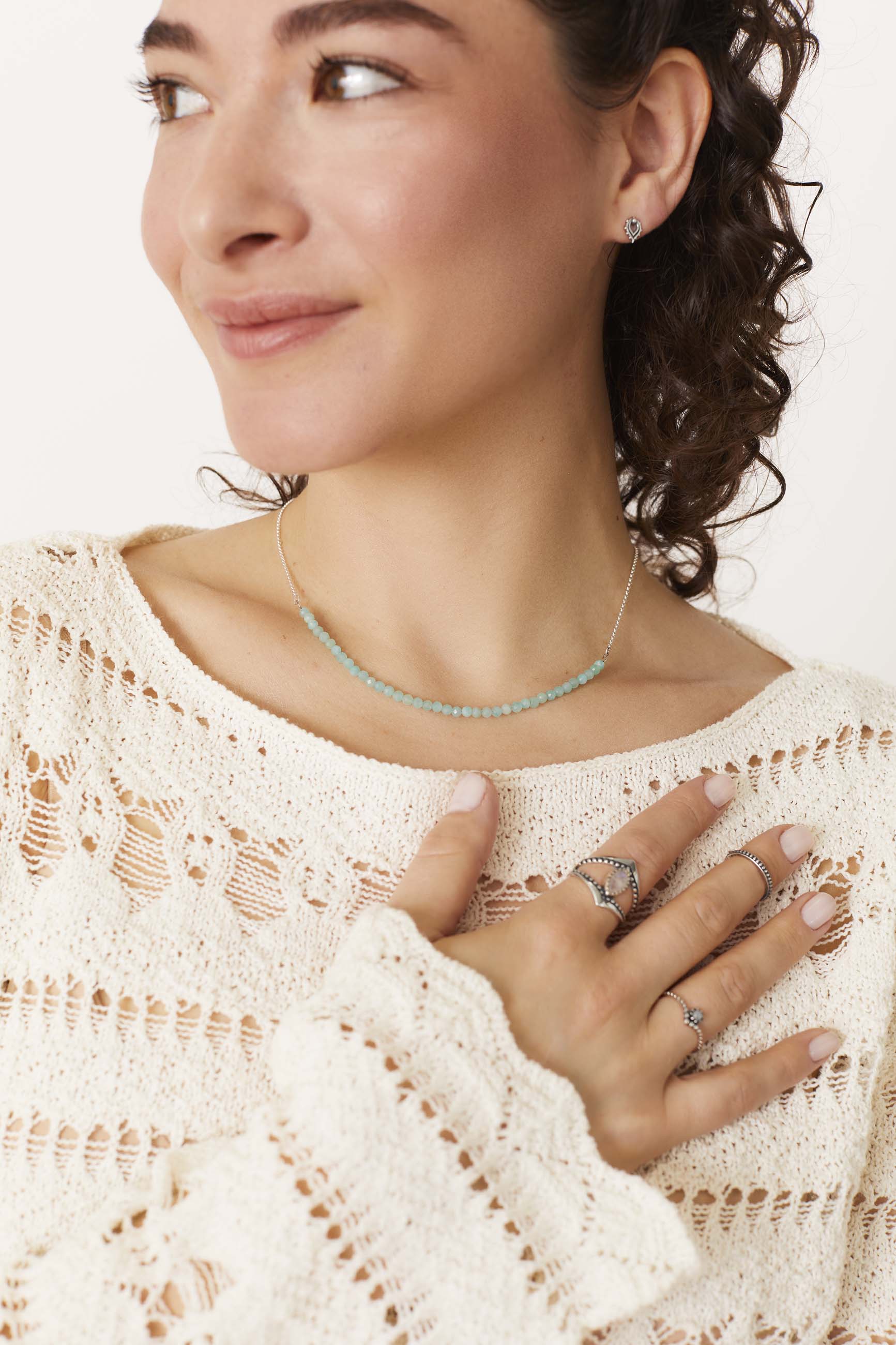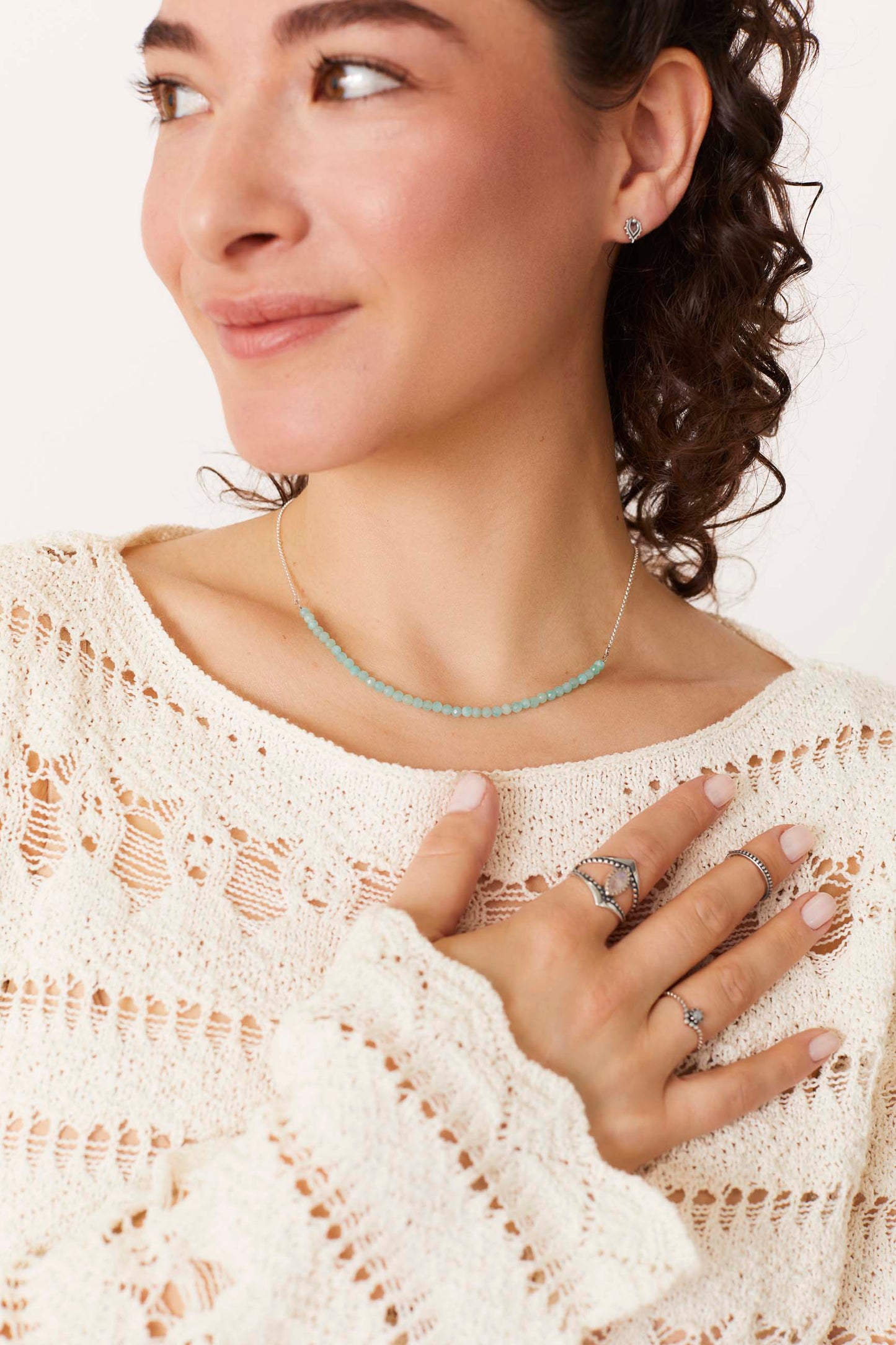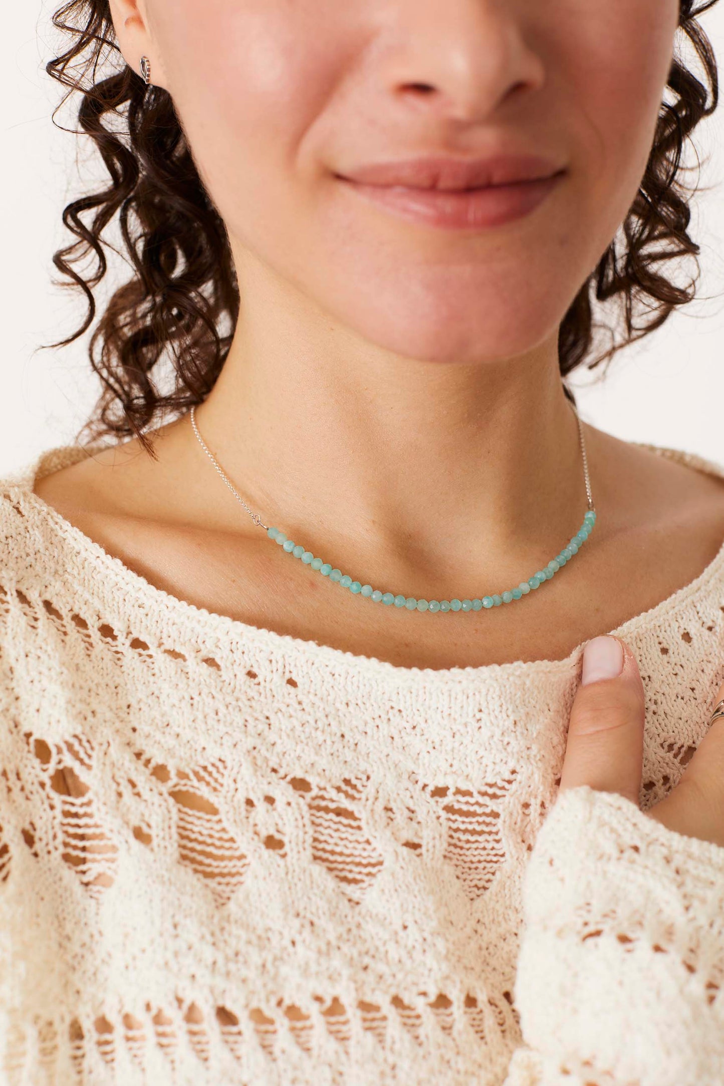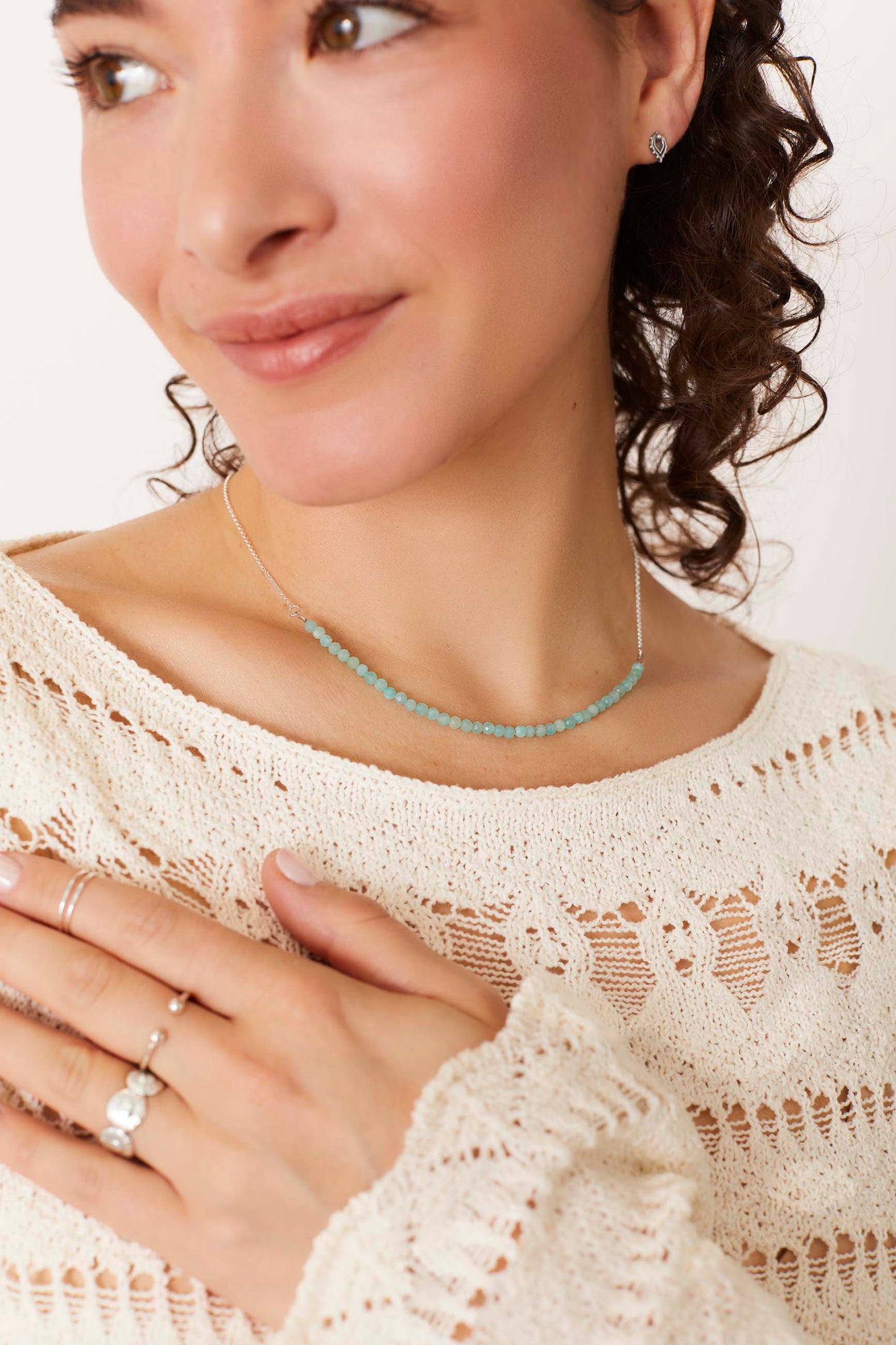 Le GITANJALI est un collier à chaîne réglable caractérisé par une série de pierres amazonite de taille ronde au bas du collier. La chaîne est réglable et fabriquée en argent sterling 925.