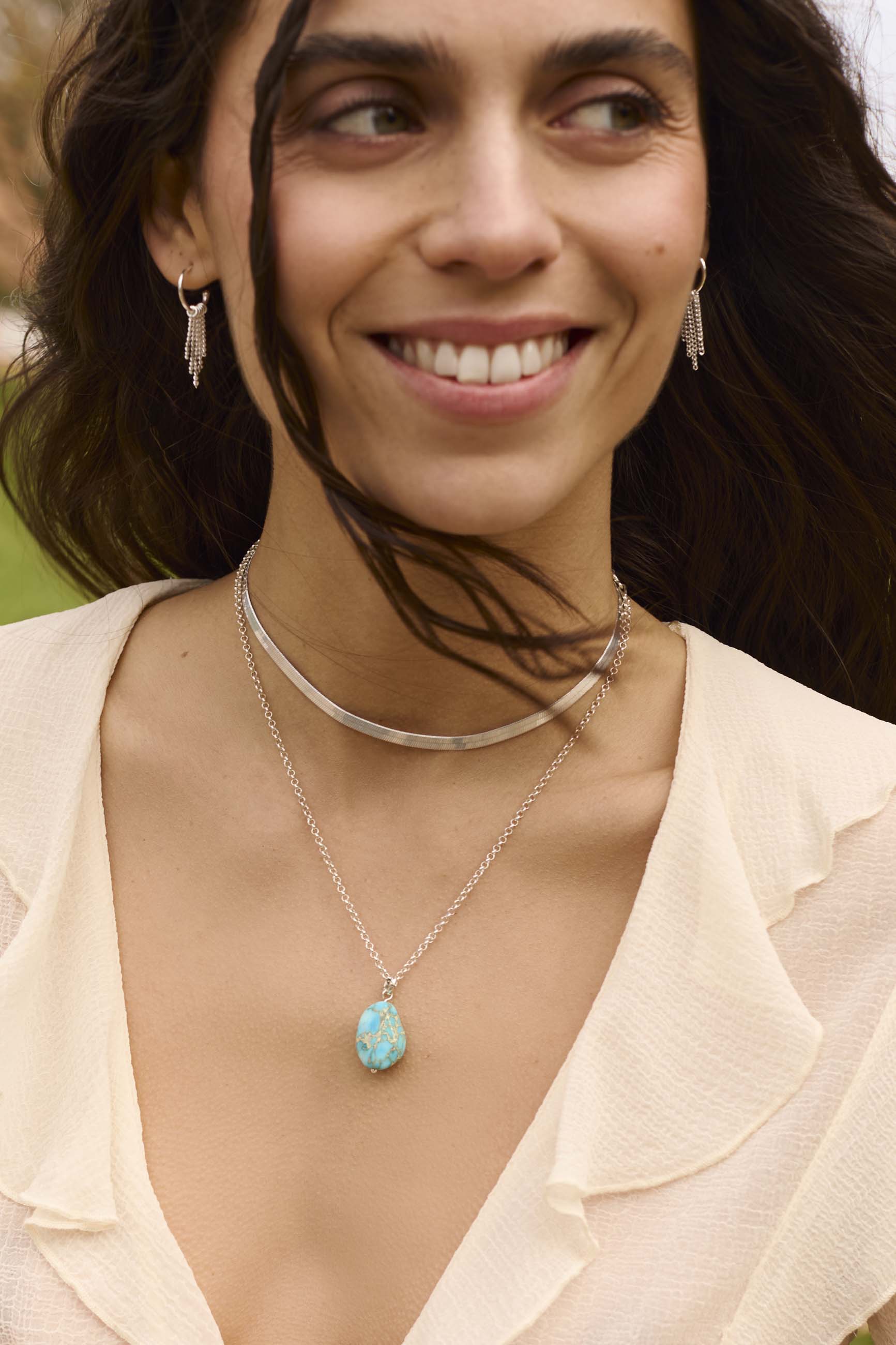 La turquoise impériale avec sa coupe imparfaite et sa forme ovale du charm Jivasma se distingue par sa couleur vibrante et sa forte personnalité. Son ton bleu turquoise traversé de veines contrastées crée un effet visuel très spécial qui apporte une touche naturelle à toute combinaison.