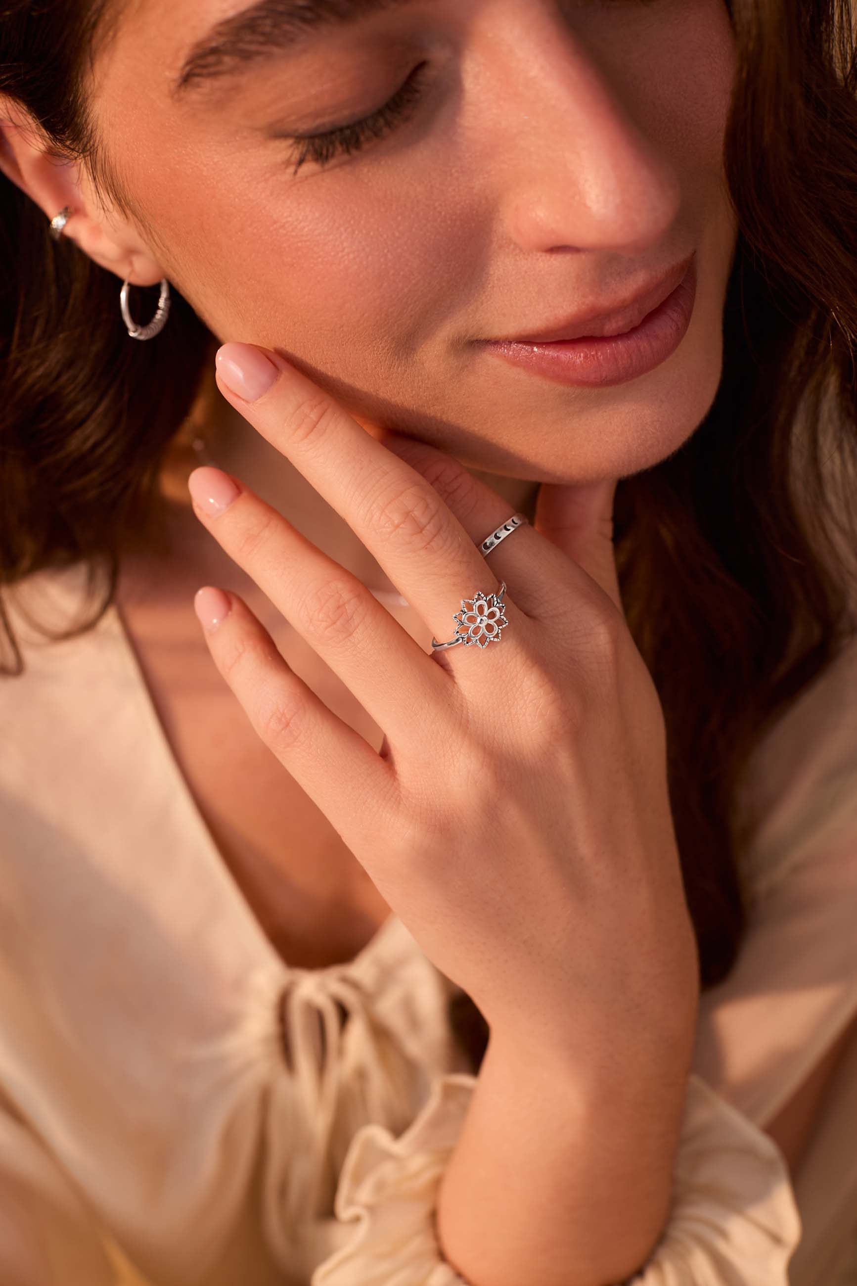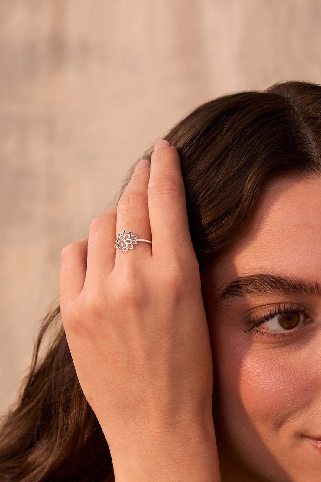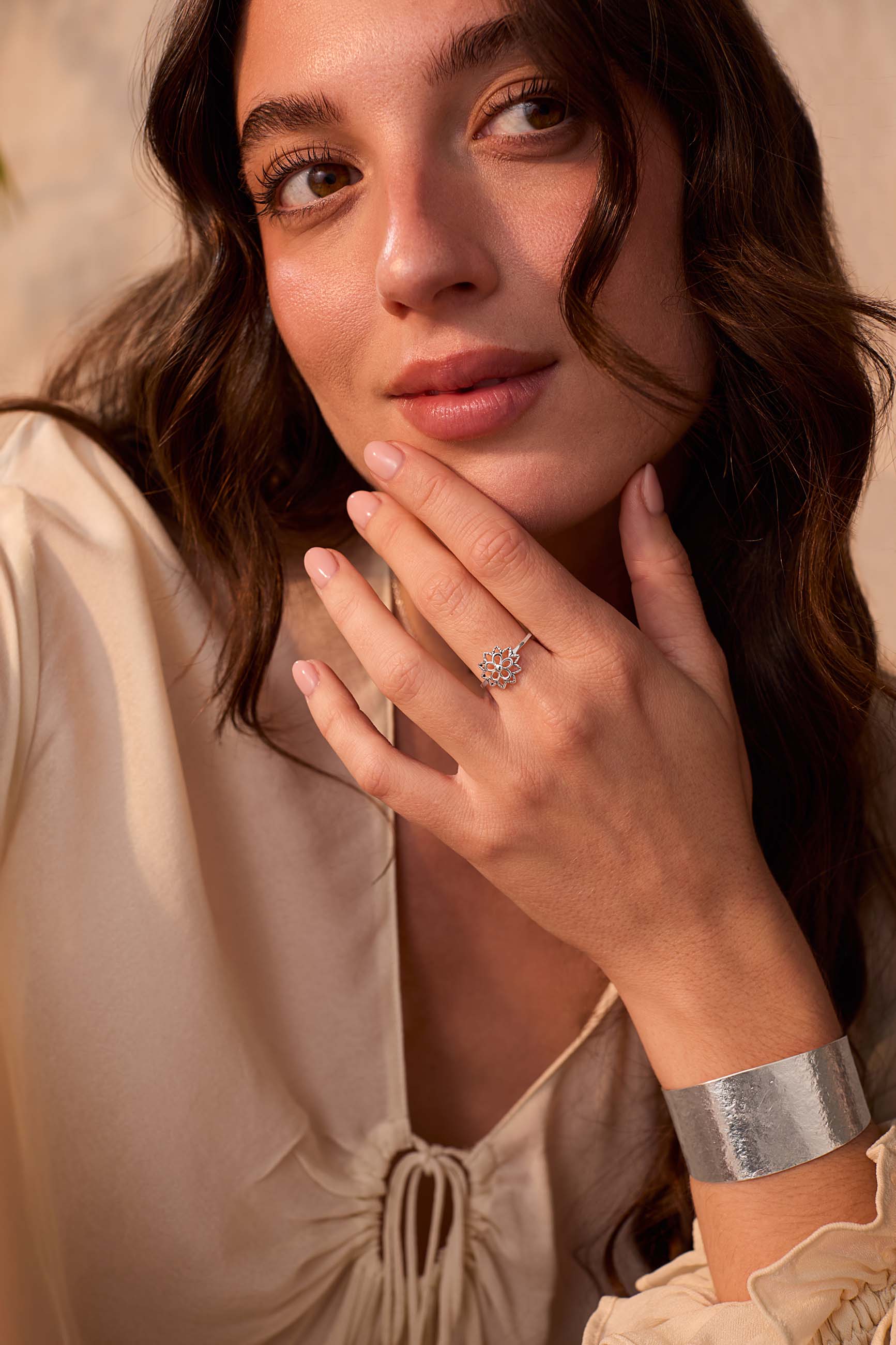La bague ANKUR a forme de fleur avec ses fils d'argent qui la composent, le résultat est très beau et original. Il est très élégant avec ses finitions intérieures arrondies et ses angles plus prononcés à l'extérieur.