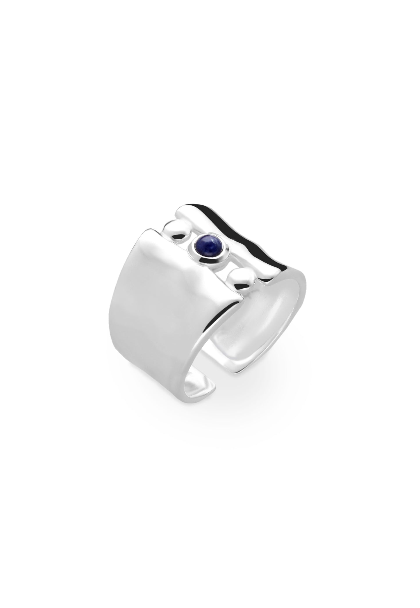 Au centre de l'anneau, trois petites boules s'assemblent pour créer un détail charmant, et la boule centrale abrite une belle pierre sodalite bleue. Cette pierre fournit non seulement une touche de couleur vibrante et élégante, mais est également connue pour ses propriétés apaisantes et sa capacité à favoriser la clarté mentale.