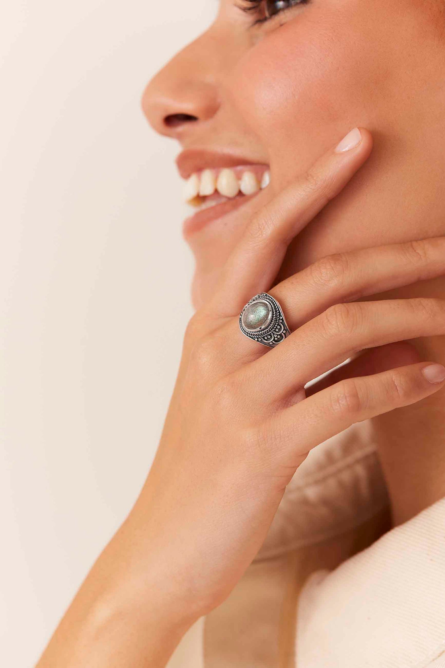 La bague KEVAL est une bague avec beaucoup de lumière et d'intensité. Ce bijou unique est composé d'unebelle pierre Labradorite Naturelle et d'Argent Sterling 925.