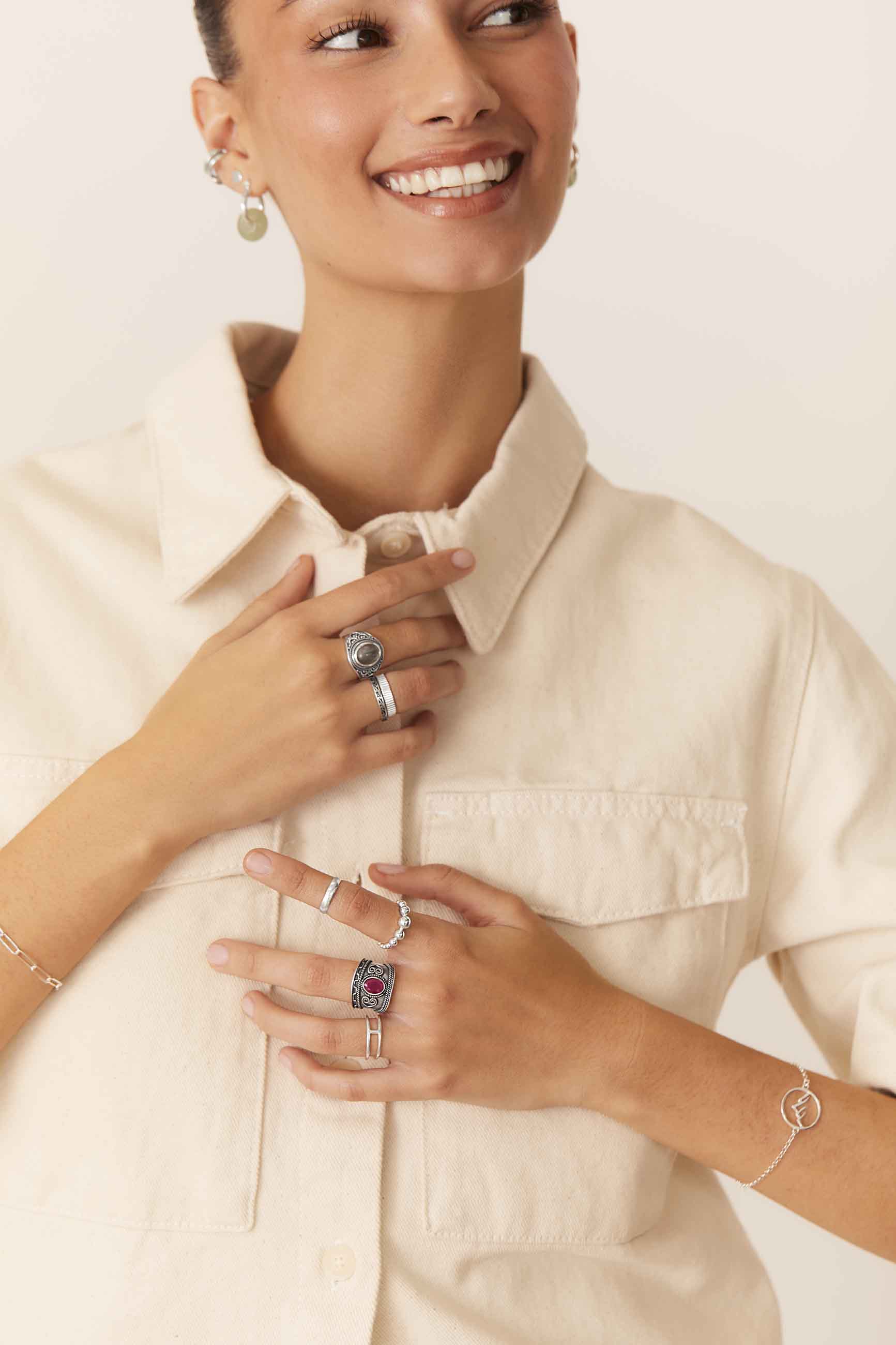 Le design de KEVAL se caractérise par sa silhouette large et robuste. La pierre précieuse est ovale et constitue l'élément principal au centre. Autour d'elle, des entrelacs et d'autres petits détails en argent sont formés.