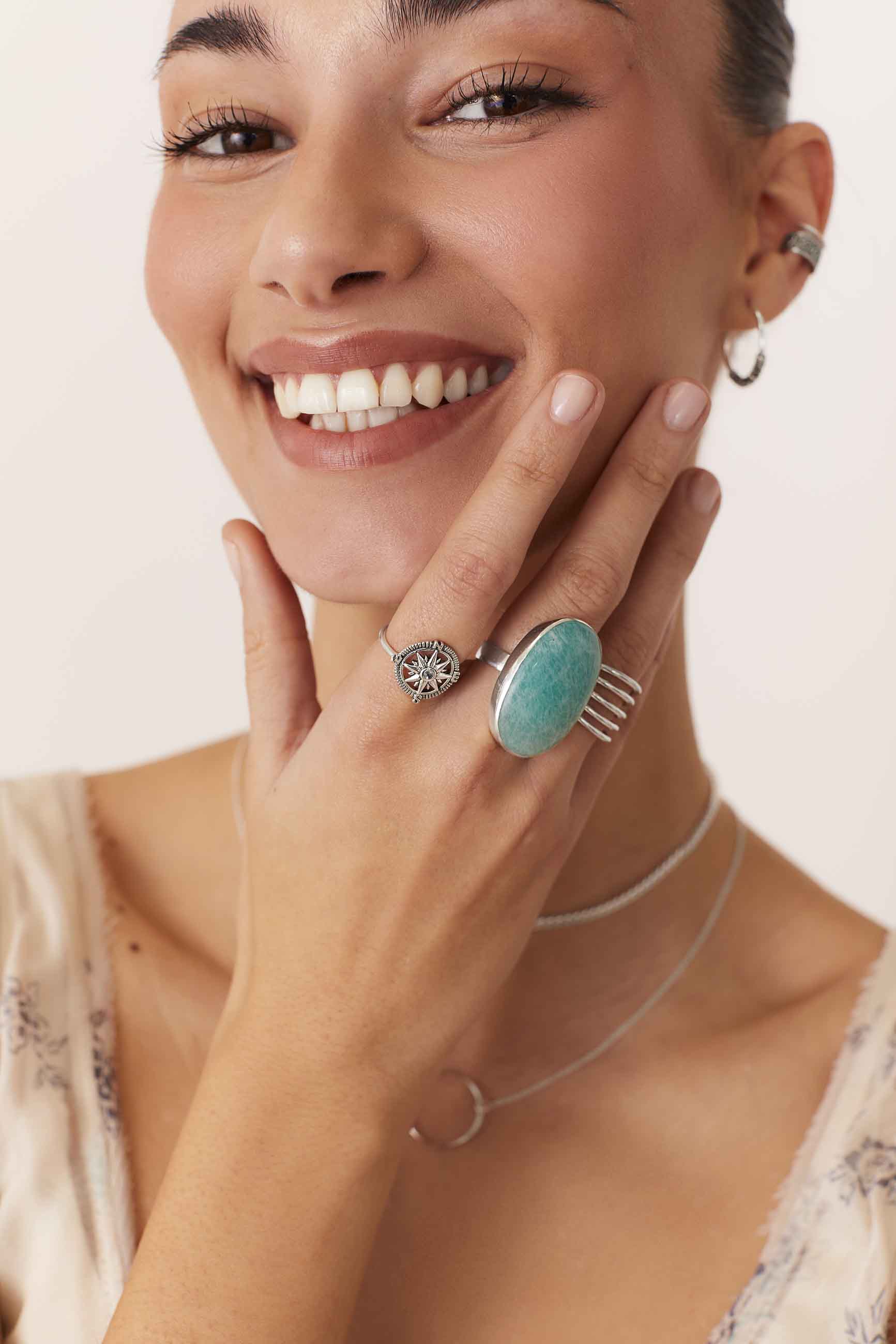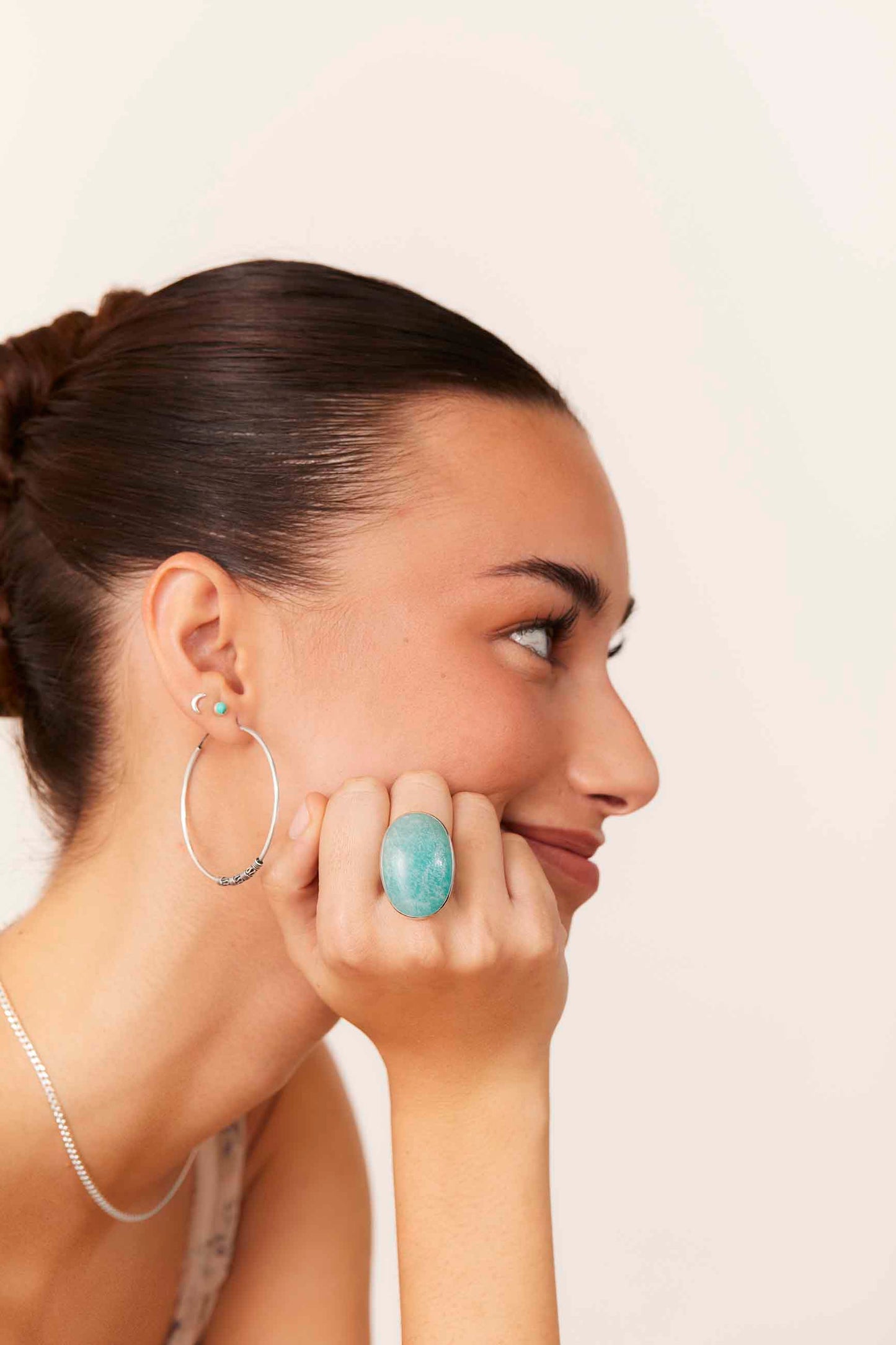La bague TULI est ornée d'une très belle pierre d'amazonite naturelle. Elle est fabriquée en argent 925, ce qui signifie qu'elle est solide et durable.La pierre d'amazonite ajoute beaucoup de couleur au bijou, il est donc idéal pour les looks audacieux. Vous pouvez le porter lors d'occasions spéciales comme les mariages, les baptêmes ou les communions. Vous allez l'adorer !