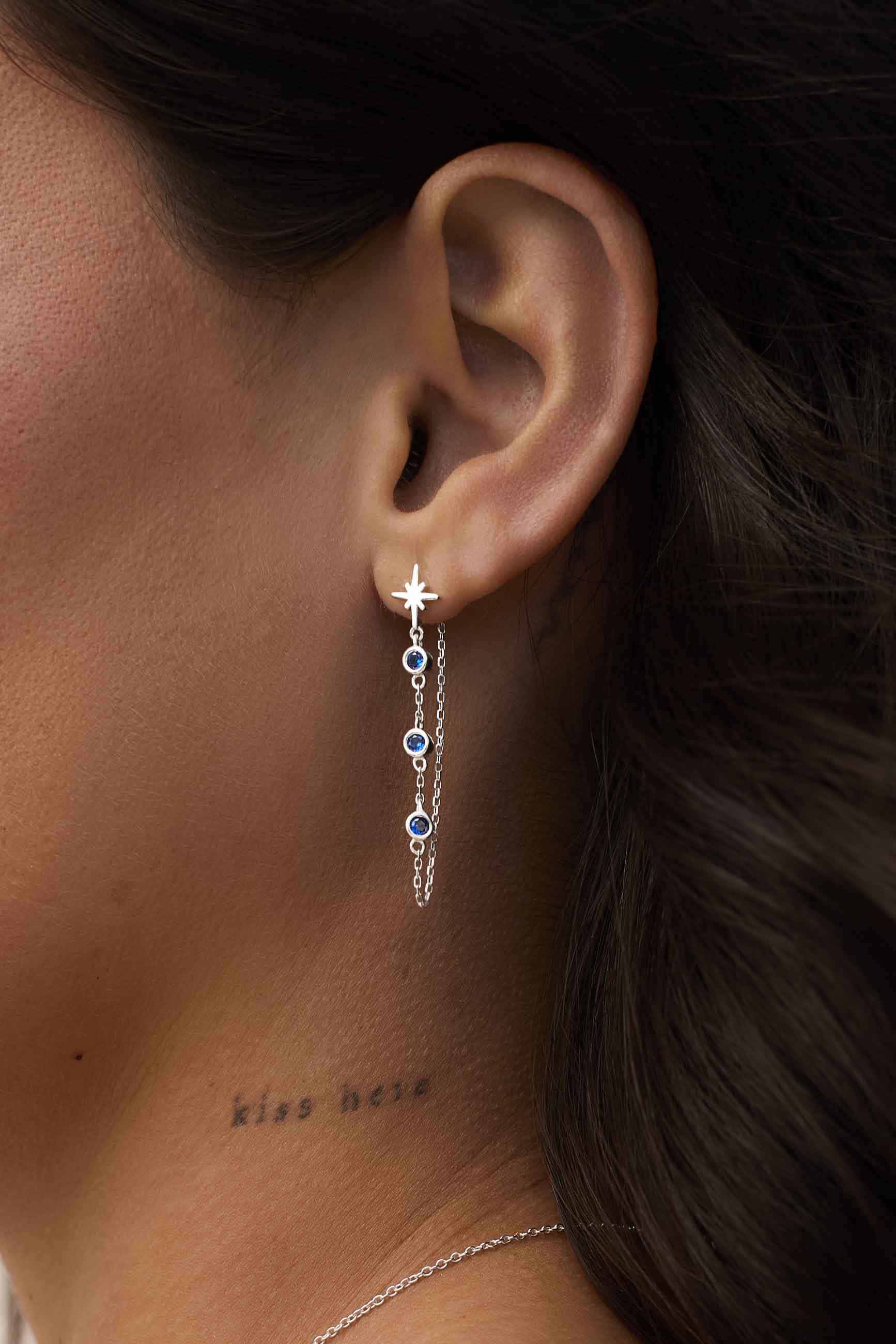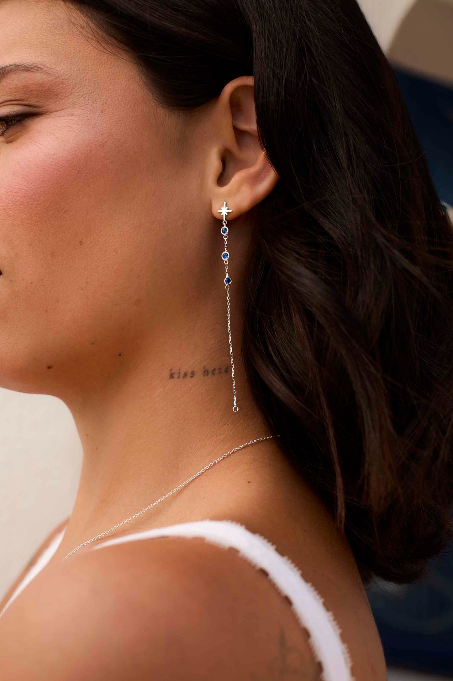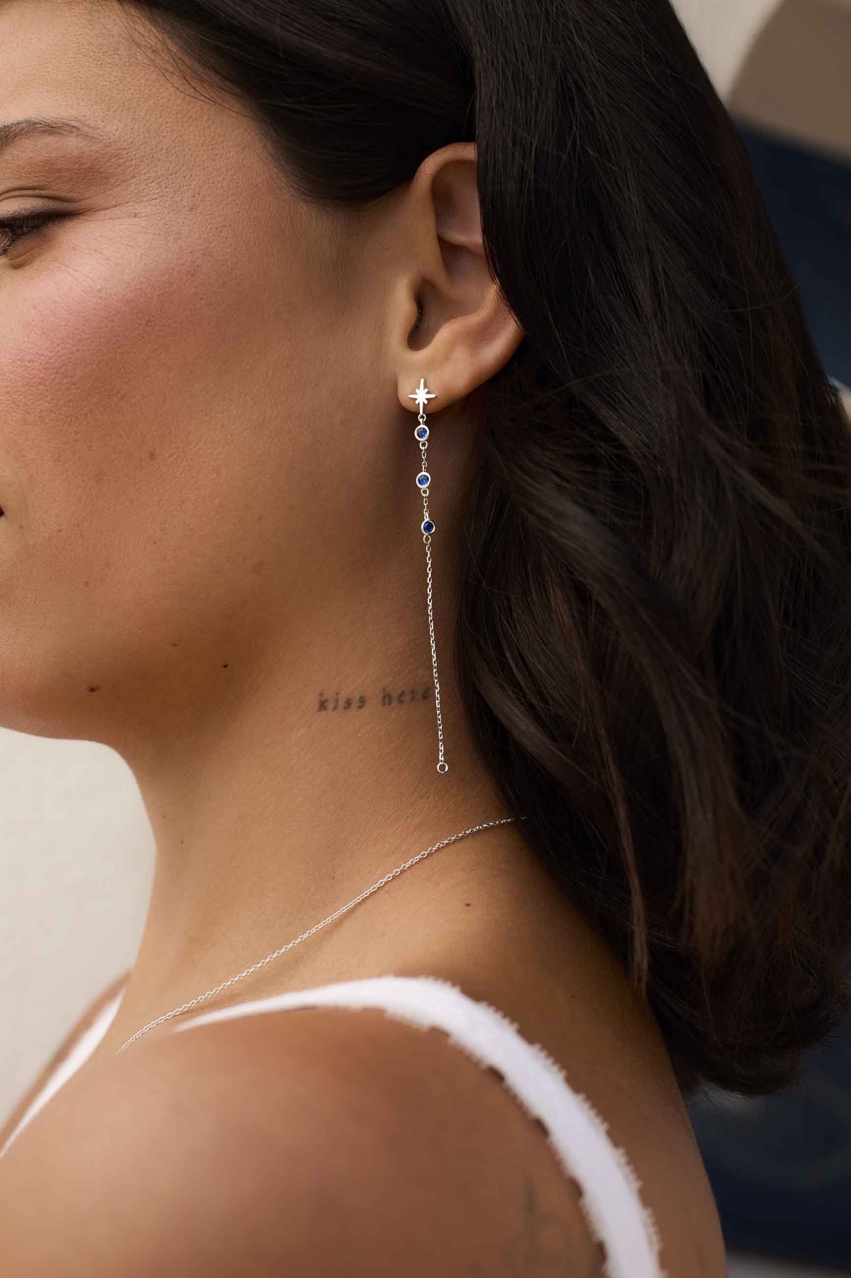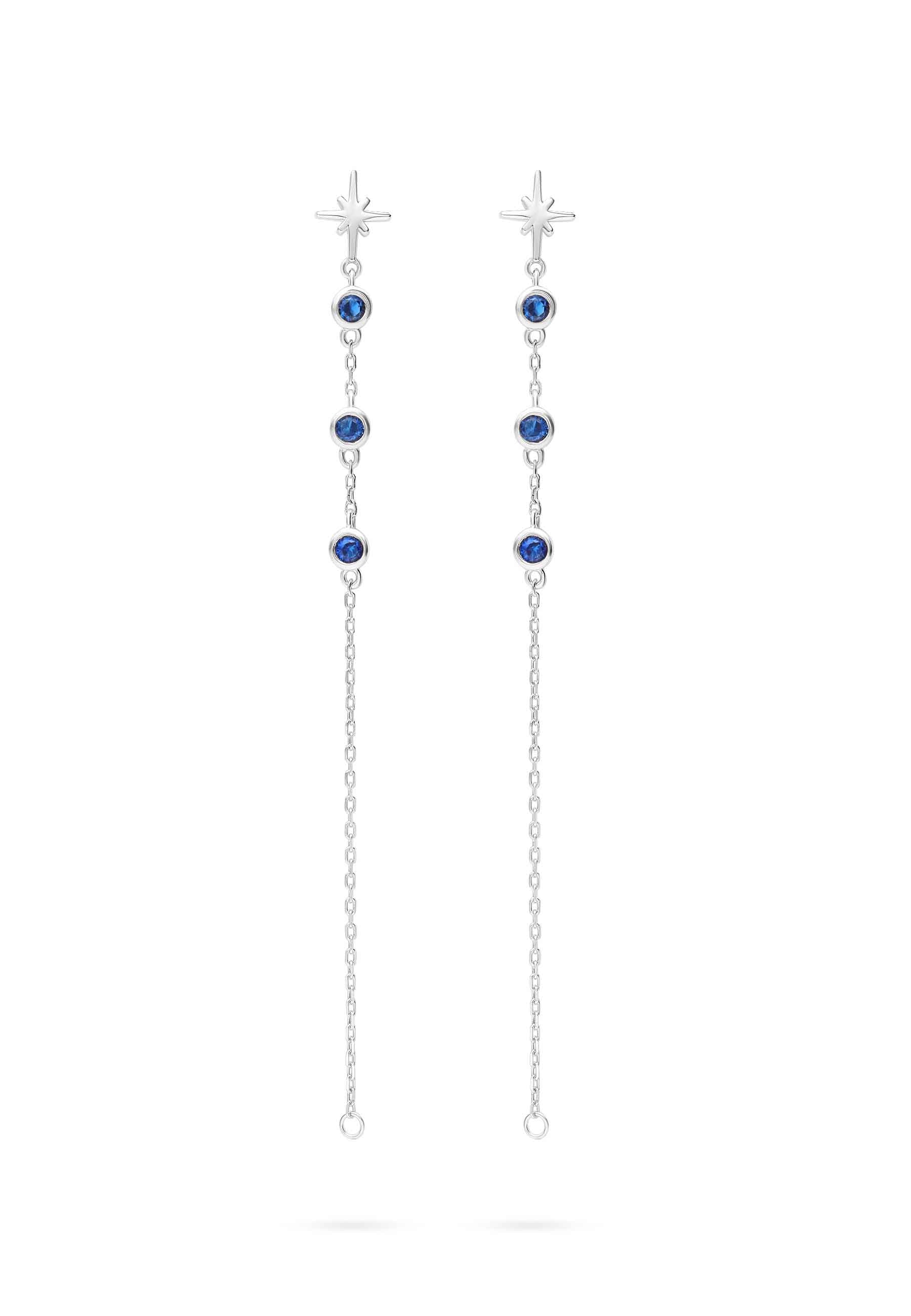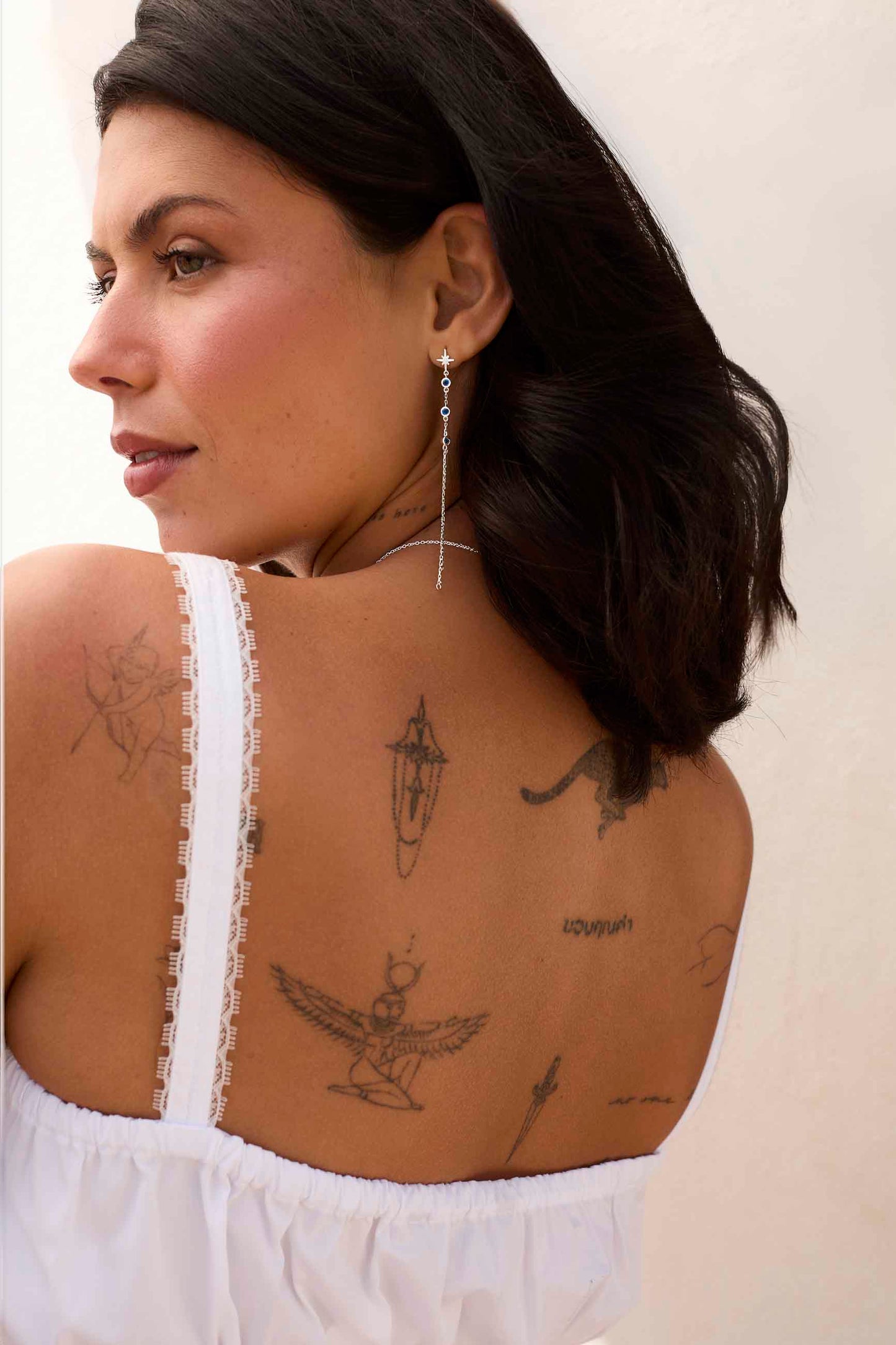 La boucle d'oreille TARAGATA est fabriquée en argent sterling 925 et présente un design long, délicat et d'inspiration mystique. Décoré de zircons bleus qui ajoutent de la lumière et de la couleur, son style élégant et spécial en fait une pièce maîtresse pour n'importe quel look.