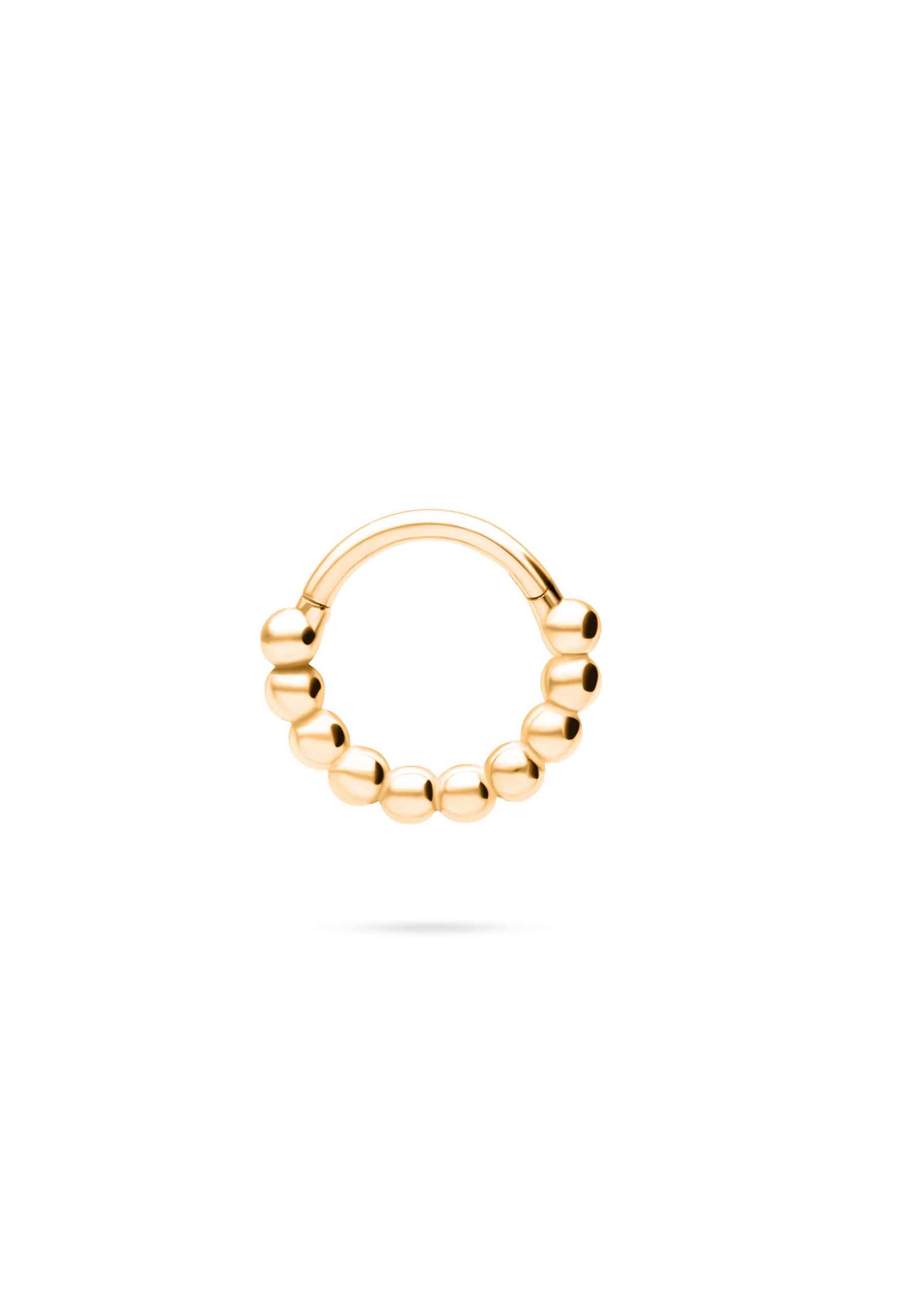 Son design se distingue par le fait qu'il est entouré de petites boules en relief , qui apportent du volume et une touche décorative sans perdre l'harmonie de l'ensemble. Cette texture transforme le piercing en un bijou visuellement riche mais équilibré, parfait pour donner un look sophistiqué et jeune.