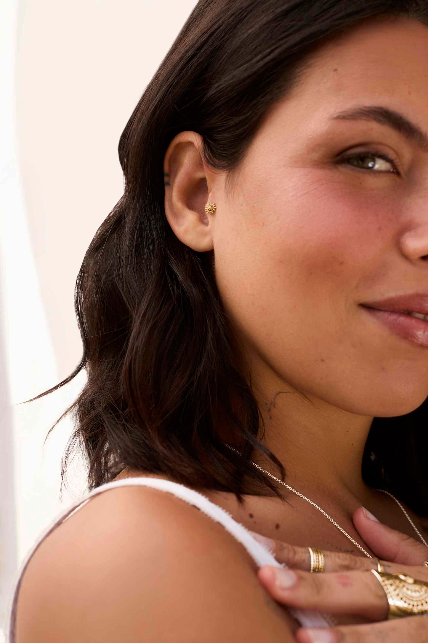 Sa forme de soleil aux rayons arrondis évoque la lumière, la force et la protection. Le centre lisse contraste avec le relief doux des rayons qui l'entourent, créant un bel effet visuel lorsque la lumière se reflète sur l'or. Ce design embellit non seulement l'oreille, mais transmet également une ambiance positive et magique.
