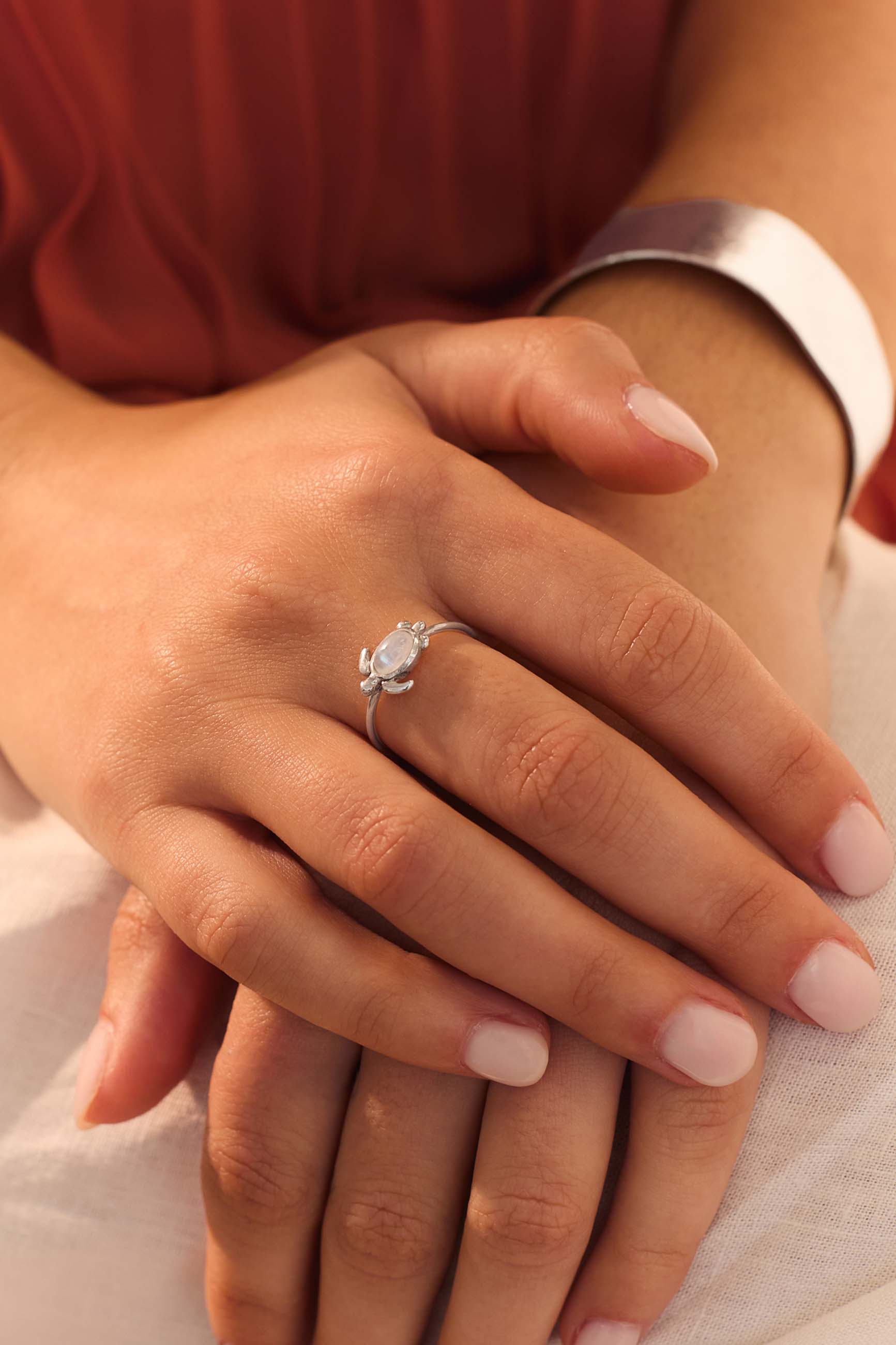 Scoprite il nostro anello SAMADHI, un anello in argento Sterling 925 a forma di tartaruga con una pietra di luna abbagliante al centro.