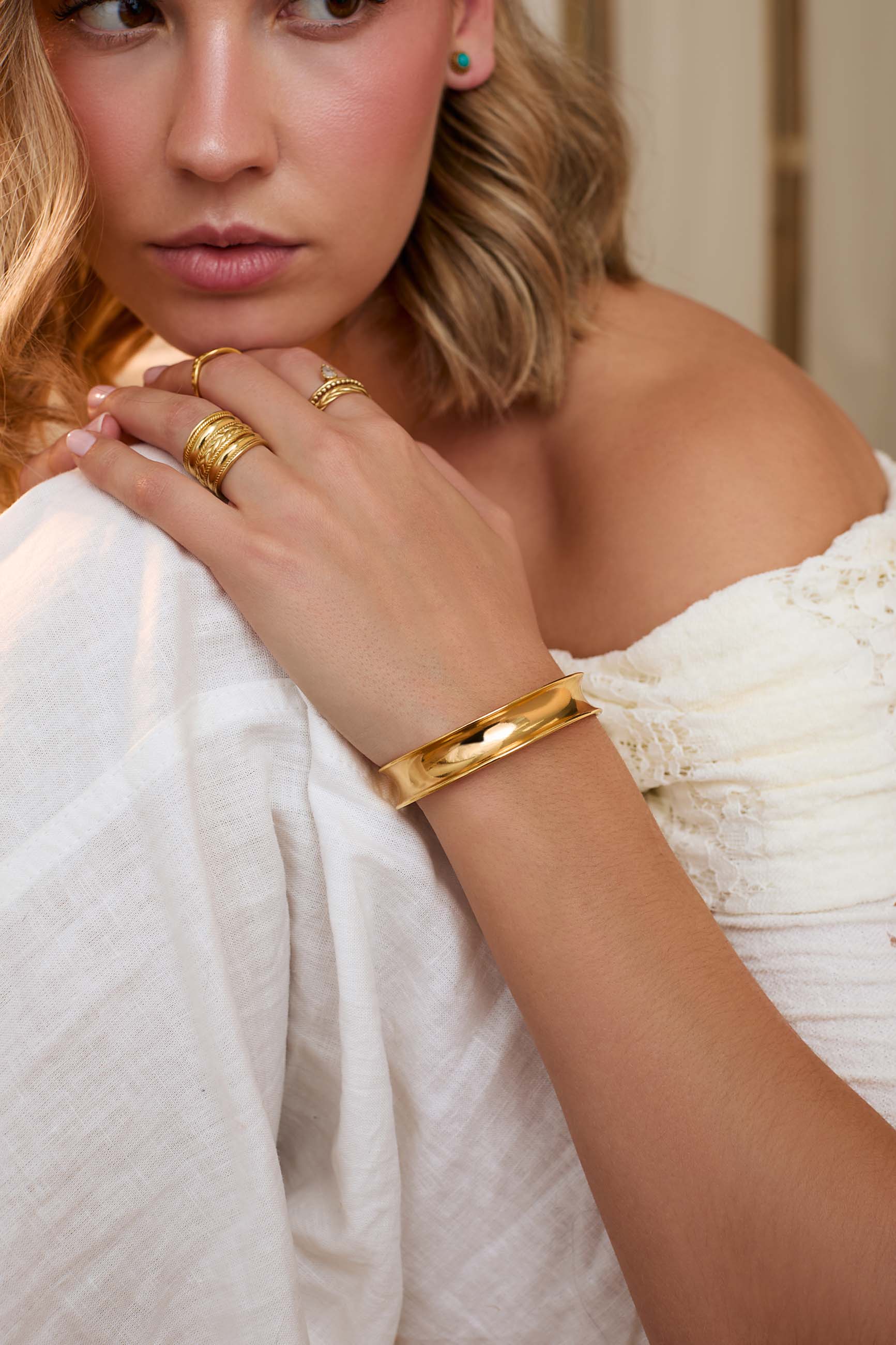 Il bracciale Samyama, placcato in oro 22 carati e parte della collezione Hathor, unisce eleganza radiosa e forza interiore. La sua forma decisa si ispira alla dea Hathor, simbolo di gioia, amore per sé stessi e libertà.