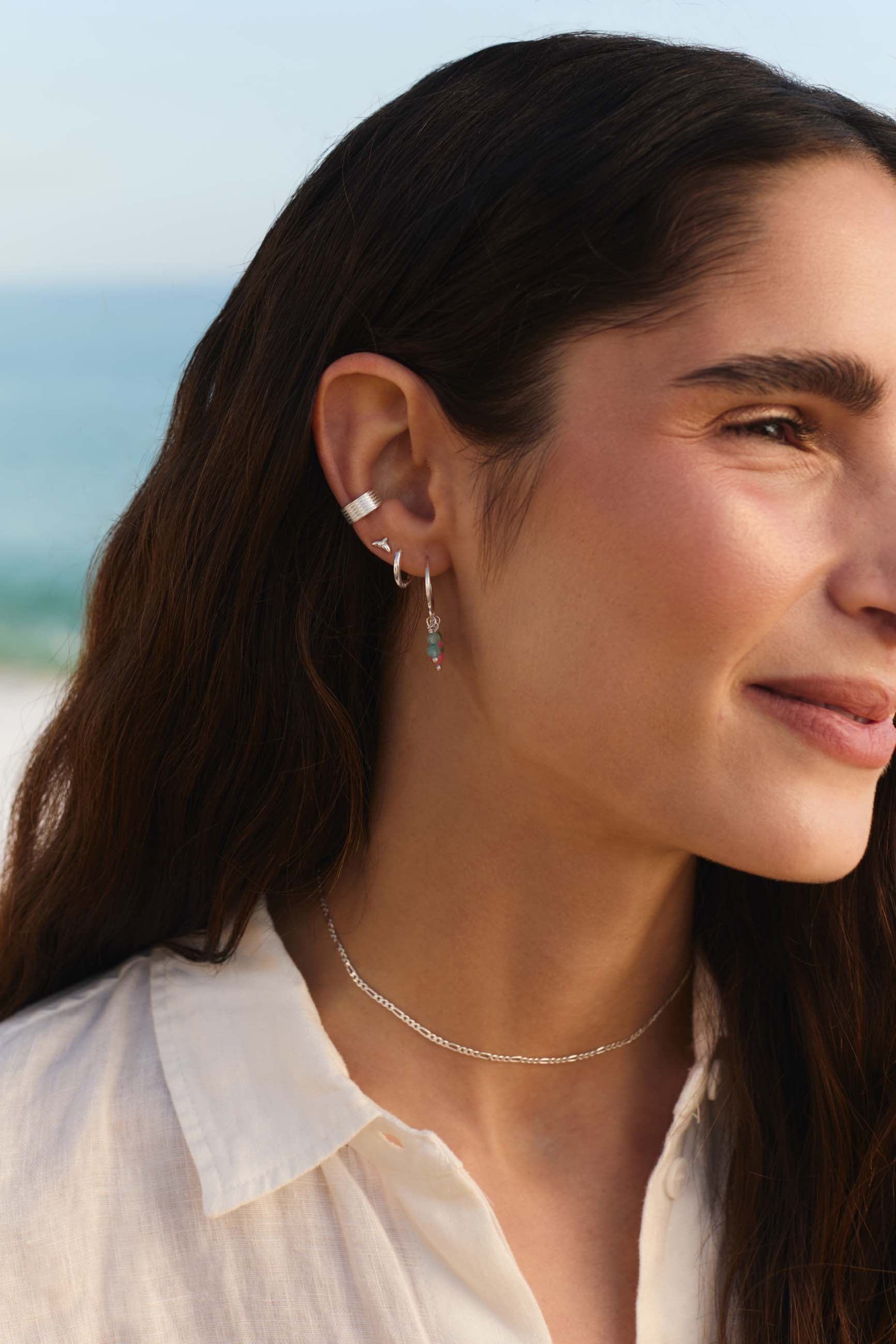 Gli orecchini ARUSHI sono composti da un piccolo oricchino a cerchio da cui pendono sei piccole palline di pietre. Due palline di pietra Apatite blu, due de Crisoprasio e due di Quarzo Fragola. Bellissimi!