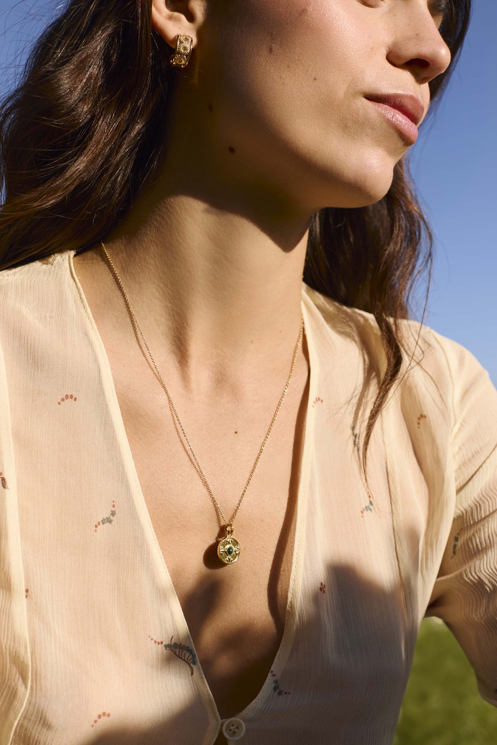 Il charm Pankhudi in oro valorizza il design floreale della moneta e aggiunge una brillantezza che incornicia la pietra naturale di Malachite al centro. Il contrasto tra il verde profondo e il tono dorato crea un insieme elegante e molto valorizzante.