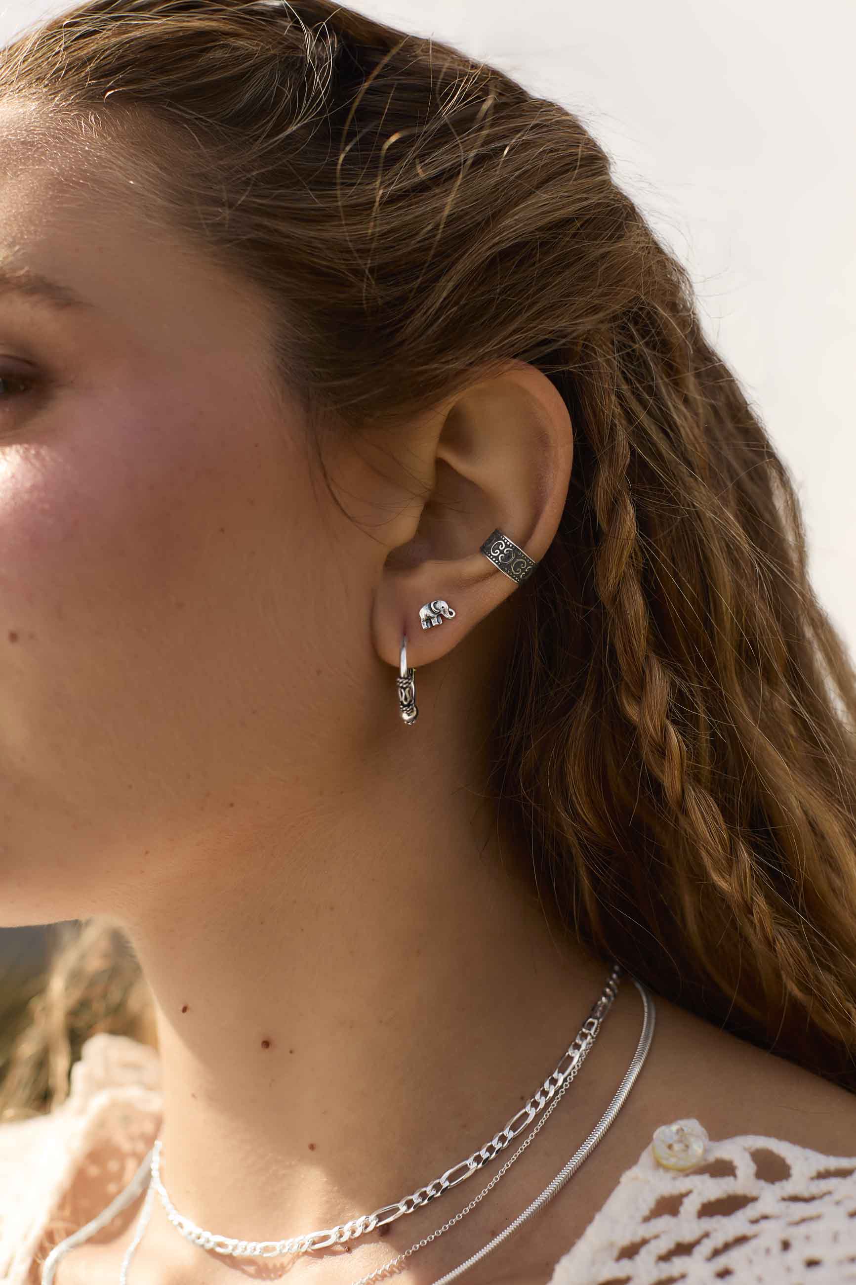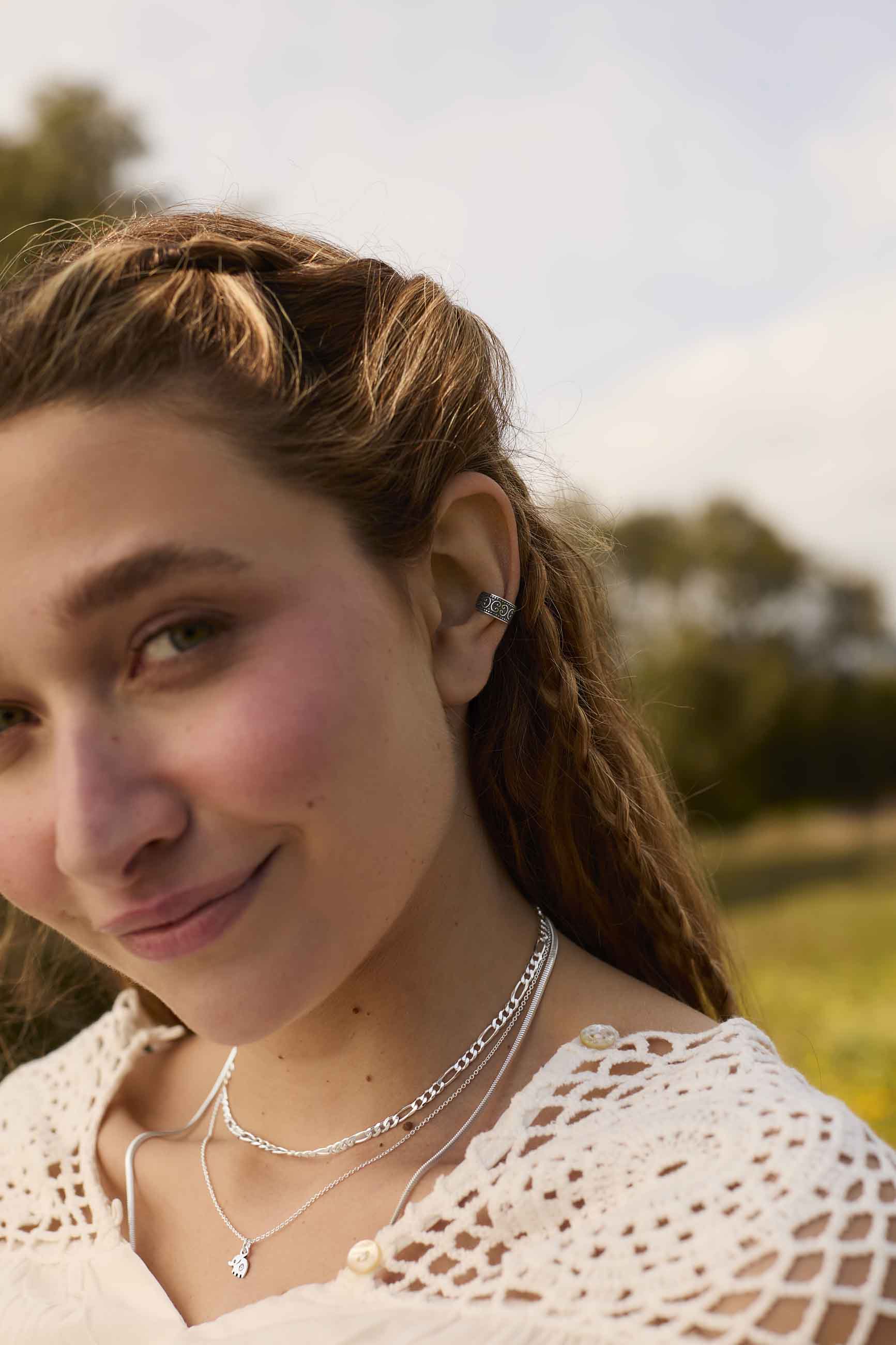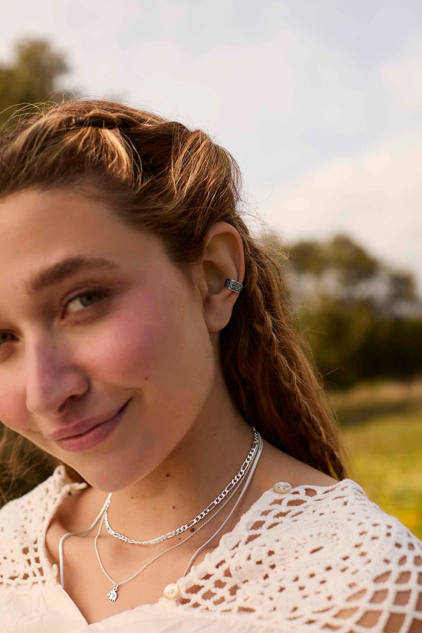 Il ear cuff NIDHI è un orecchino regolabile con disegni sulla sua base d'argento che danno origine anche ad alcune ombre scure che conferiscono all'orecchino quel particolare fascino.
