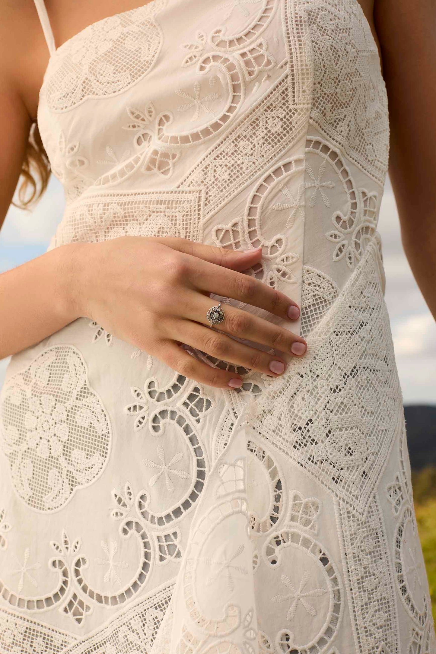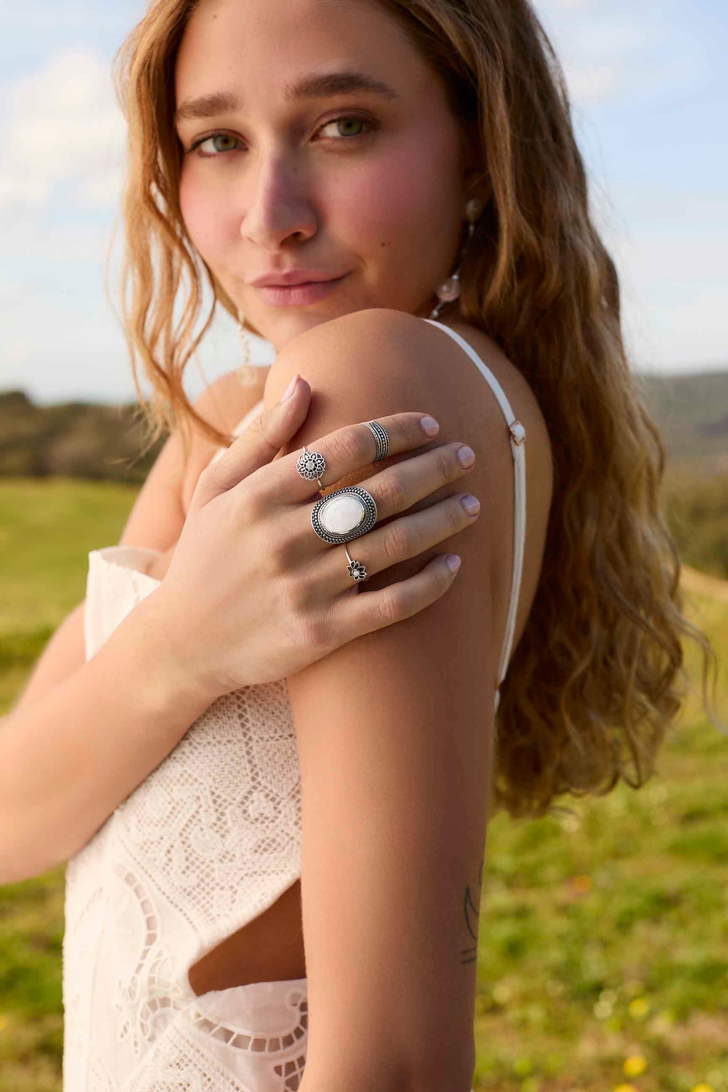 L'anello ELIKA è un gioiello bello ed elegante di quarzo bianco e Argento Sterling 925. È fatto interamente a mano e si distingue per la sua pietra naturale, convertendosi in un accessorio molto versatile ed elegante.