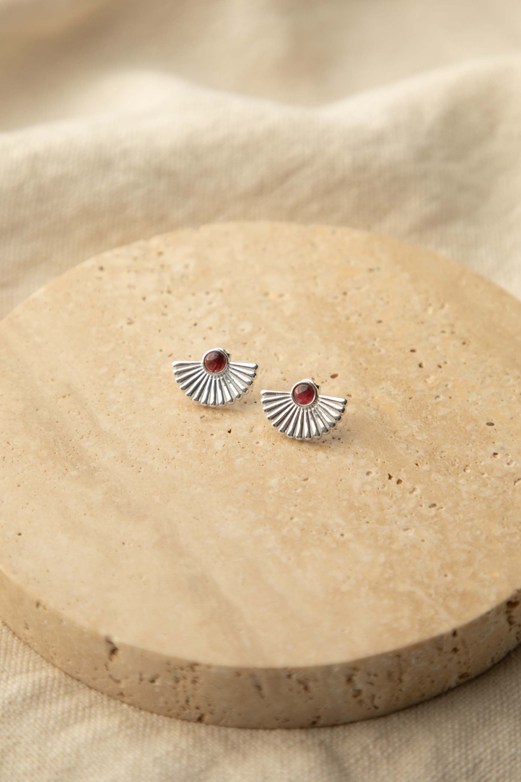 Gli orecchini Rama realizzati in argento 925, orecchini a bottone trasformati in fiori squisiti. Ogni dettaglio è lavorato con cura per creare un pezzo che catturi l'essenza della stagione primaverile, al centro di questi fiori c'è una pietra di rubino rotonda.