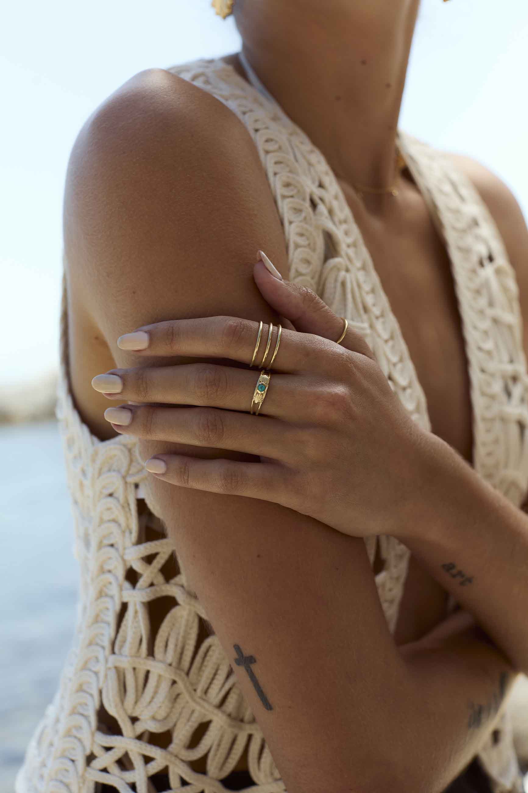 L'anello KRASA placcato in oro 22 carati è un gioiello con carattere e freschezza, pensato per distinguersi con un tocco sofisticato. Questa versione regolabile (taglie dalla 10 alla 20) si adatta comodamente al dito ed è perfetta da indossare da sola o abbinata.
