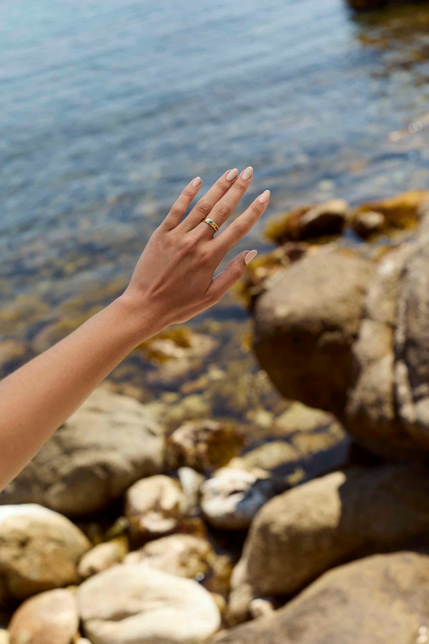 Il suo design fluido dalle linee morbide richiama il movimento del mare, mentre la sua pietra turchese da 3 mm dona energia, colore e un legame diretto con l’estate. Prodotto in Spagna, è un pezzo che illumina qualsiasi look.