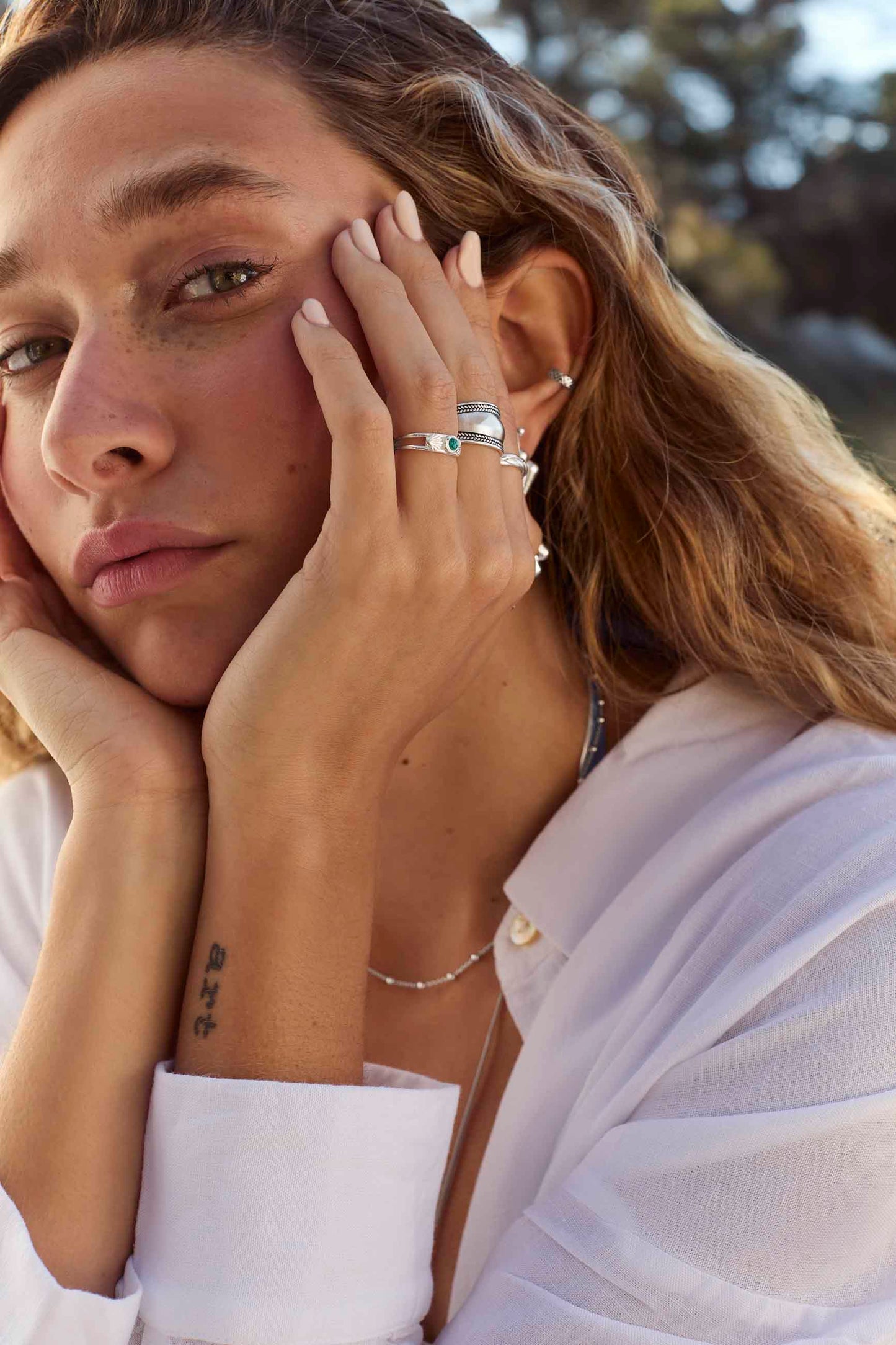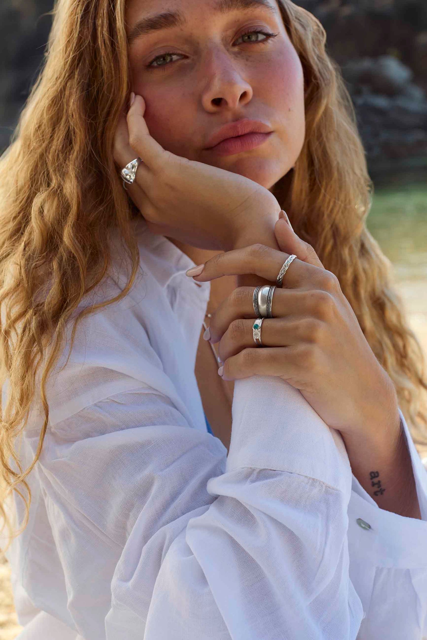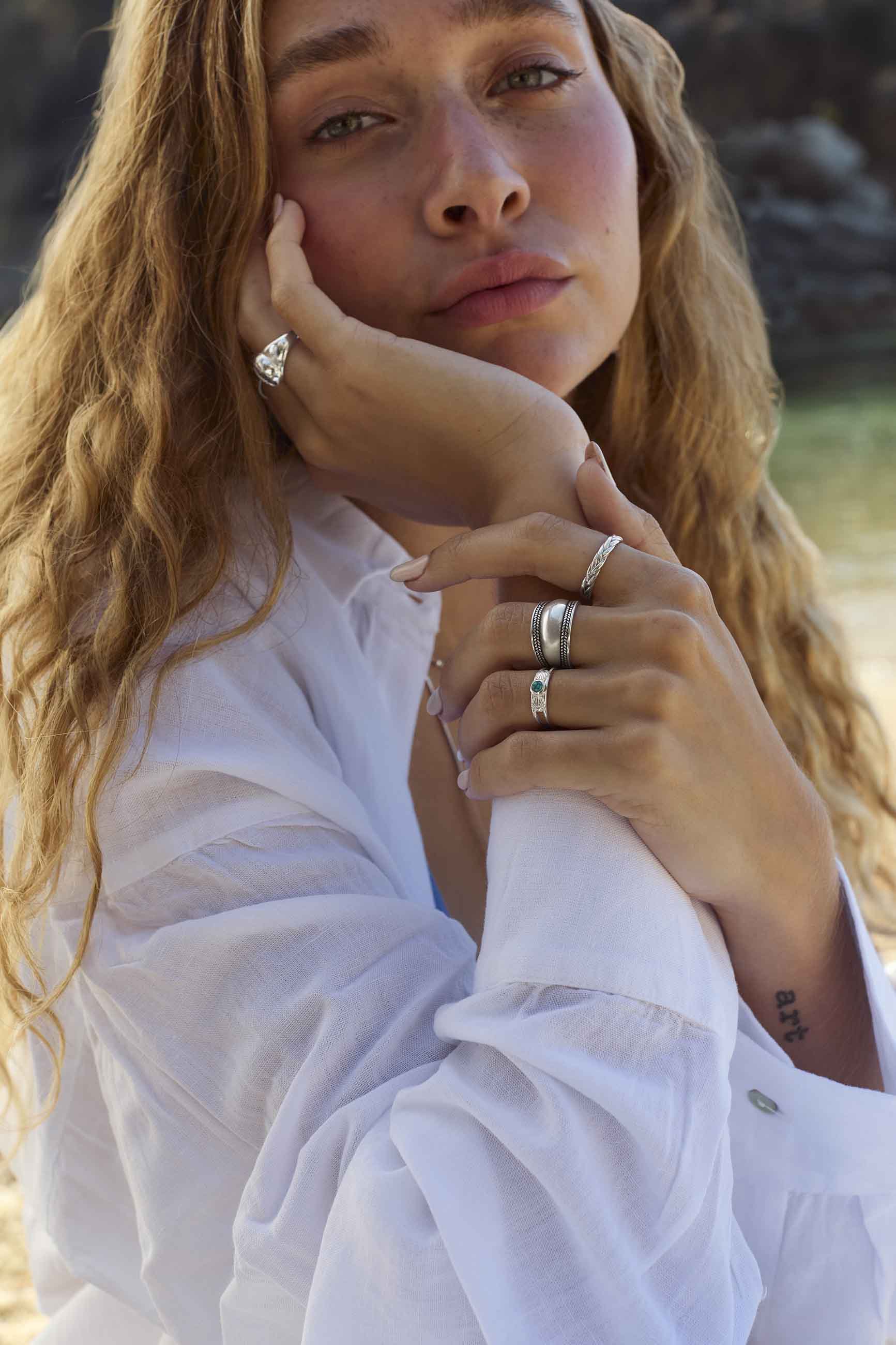 L'anello KRASA nella sua versione normale è un gioiello dal carattere forte e dall’essenza marina, perfetto da indossare da solo o abbinato ad altri anelli. Realizzato in Argento 925 e prodotto in Spagna, ha un design regolabile (taglie dalla 10 alla 20) che si adatta facilmente al dito.
