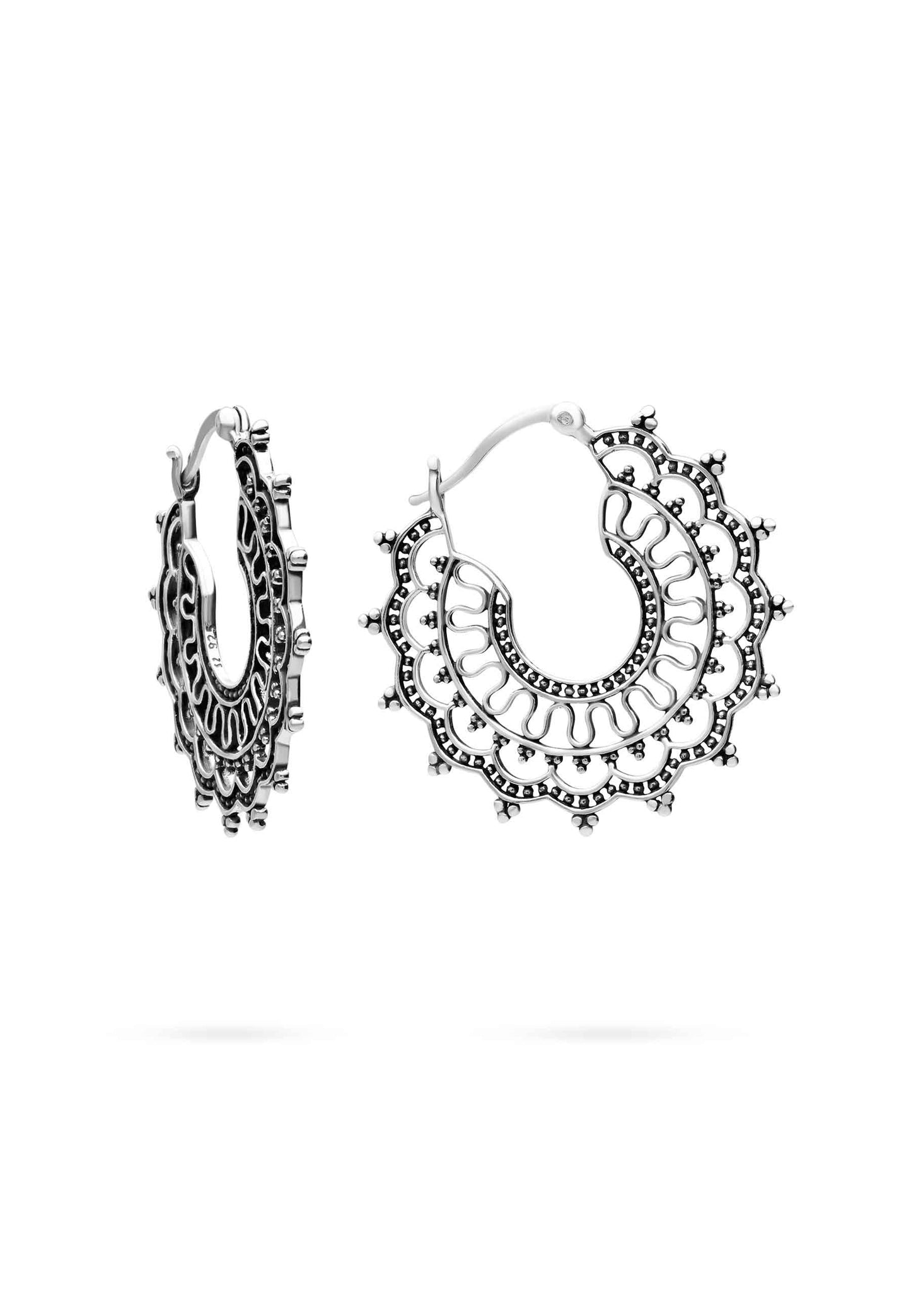Gli orecchini NARAKA sono degli orecchini a cerchio di 35mm. Hanno un design ispirato ai nostri orecchini ARAVINDA ma con più detagli. Ha cinque file con diversi disegni: palline, forme a spirale, tre palline a forma di triangolo.
