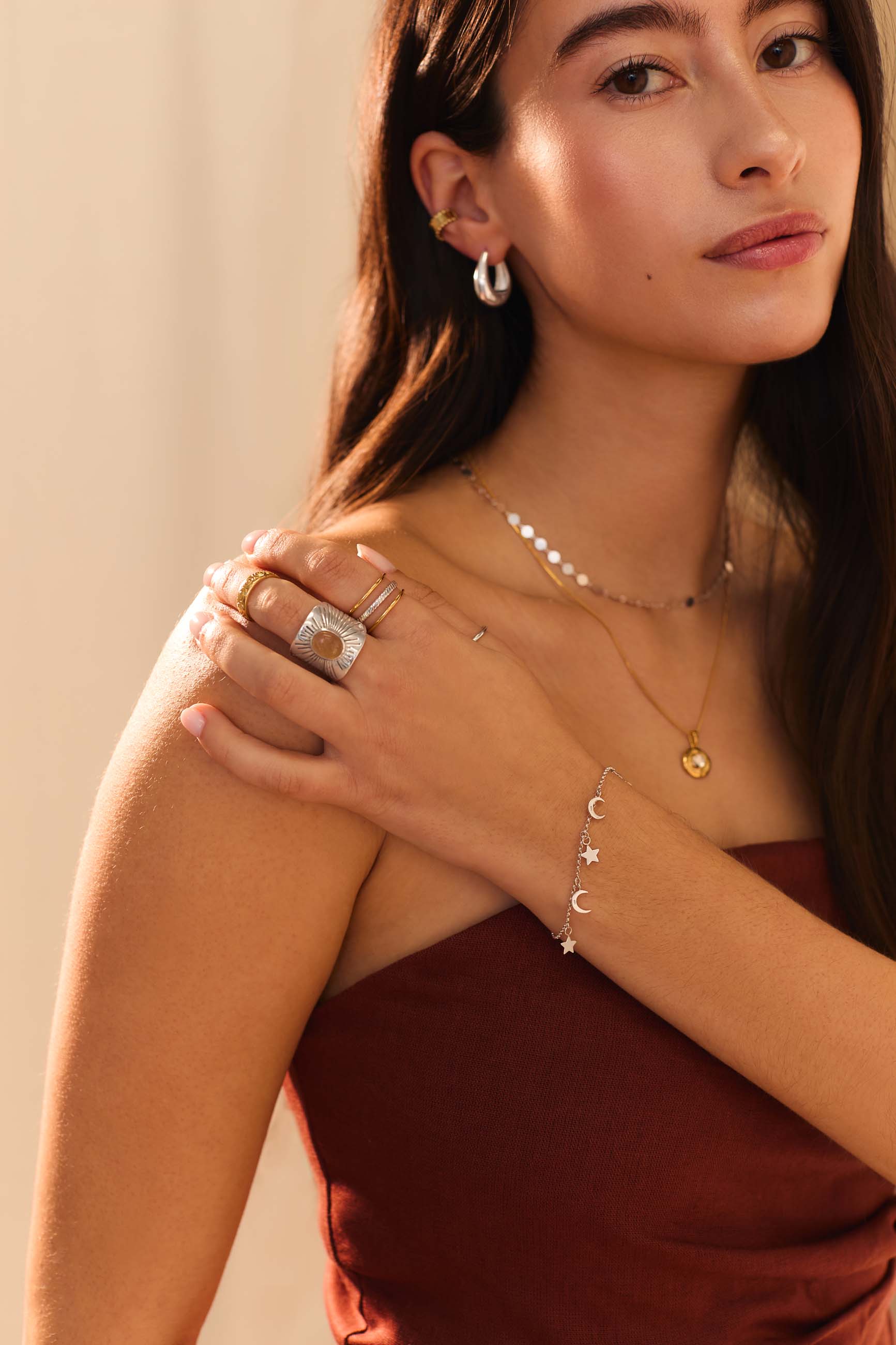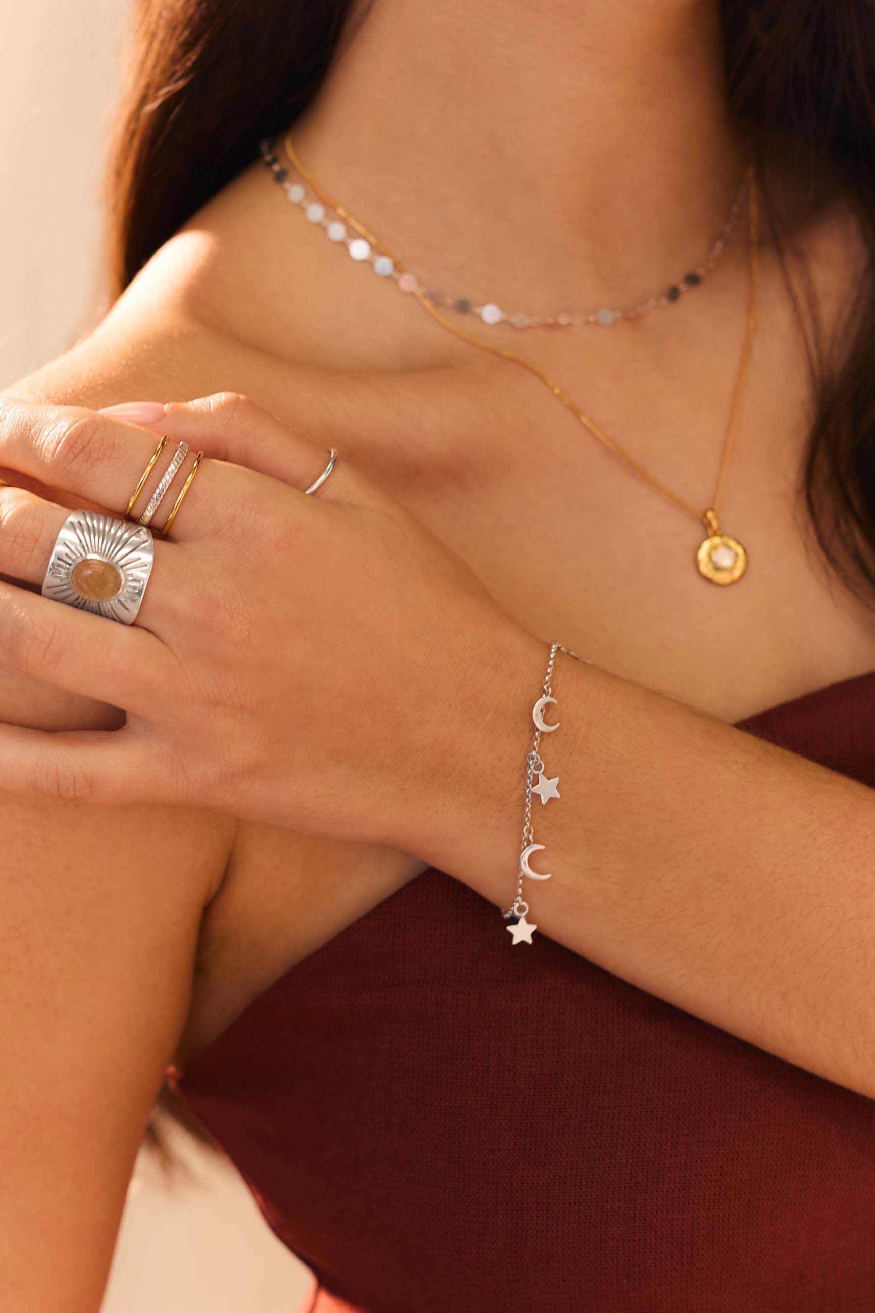 Il bracciale AESHAN è un gioiello super originale inspirato al cielo notturno. È composto da una catenina e da ciondoli a forma di stella e luna. Rifinito a mano in Argento Sterling 925.