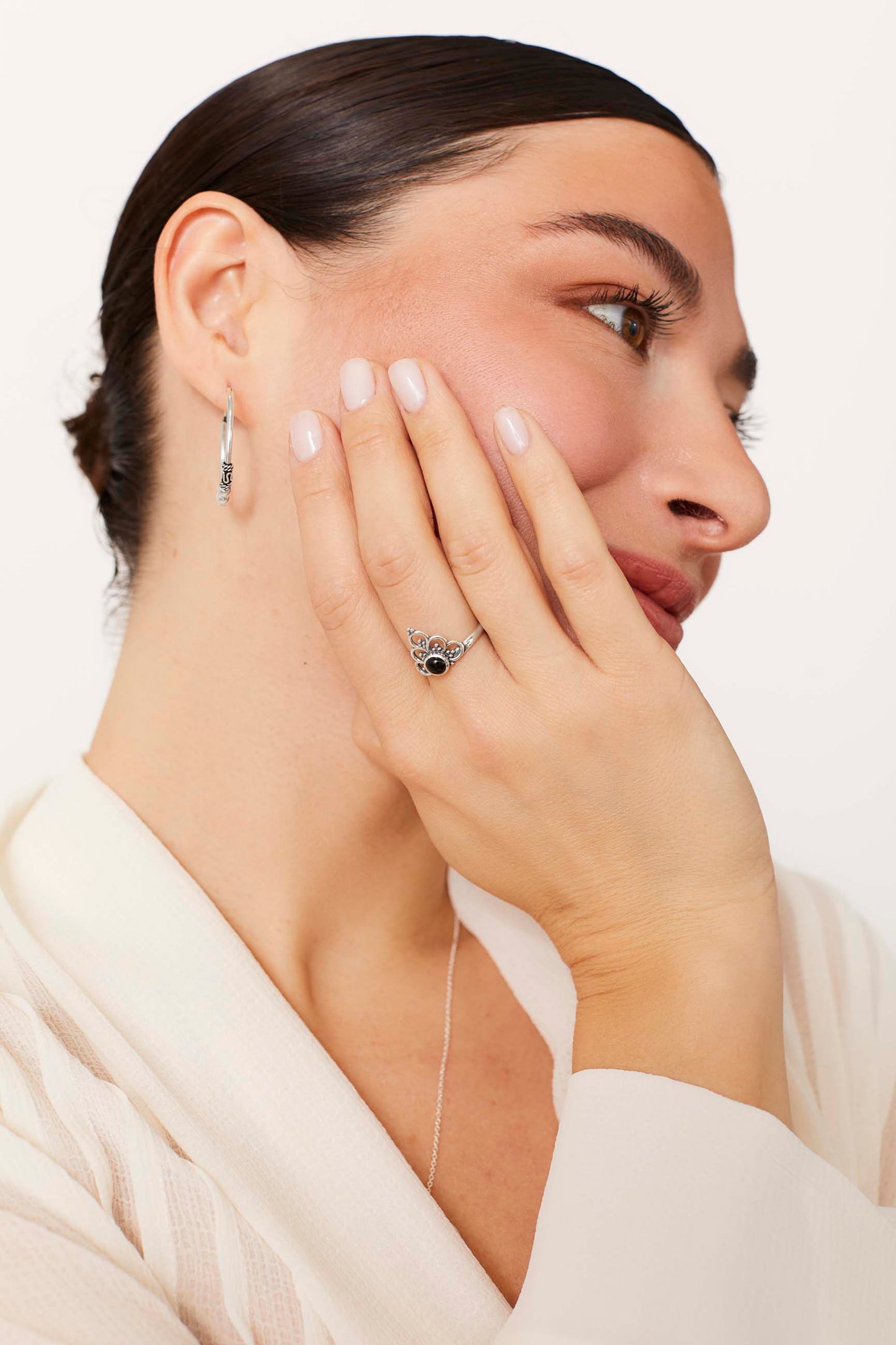 Potete abbinarlo perfettamente agli orecchini ARANVINDA (16MM), i nostri orecchini di medie dimensioni ricchi di dettagli super bassi e raffinati.