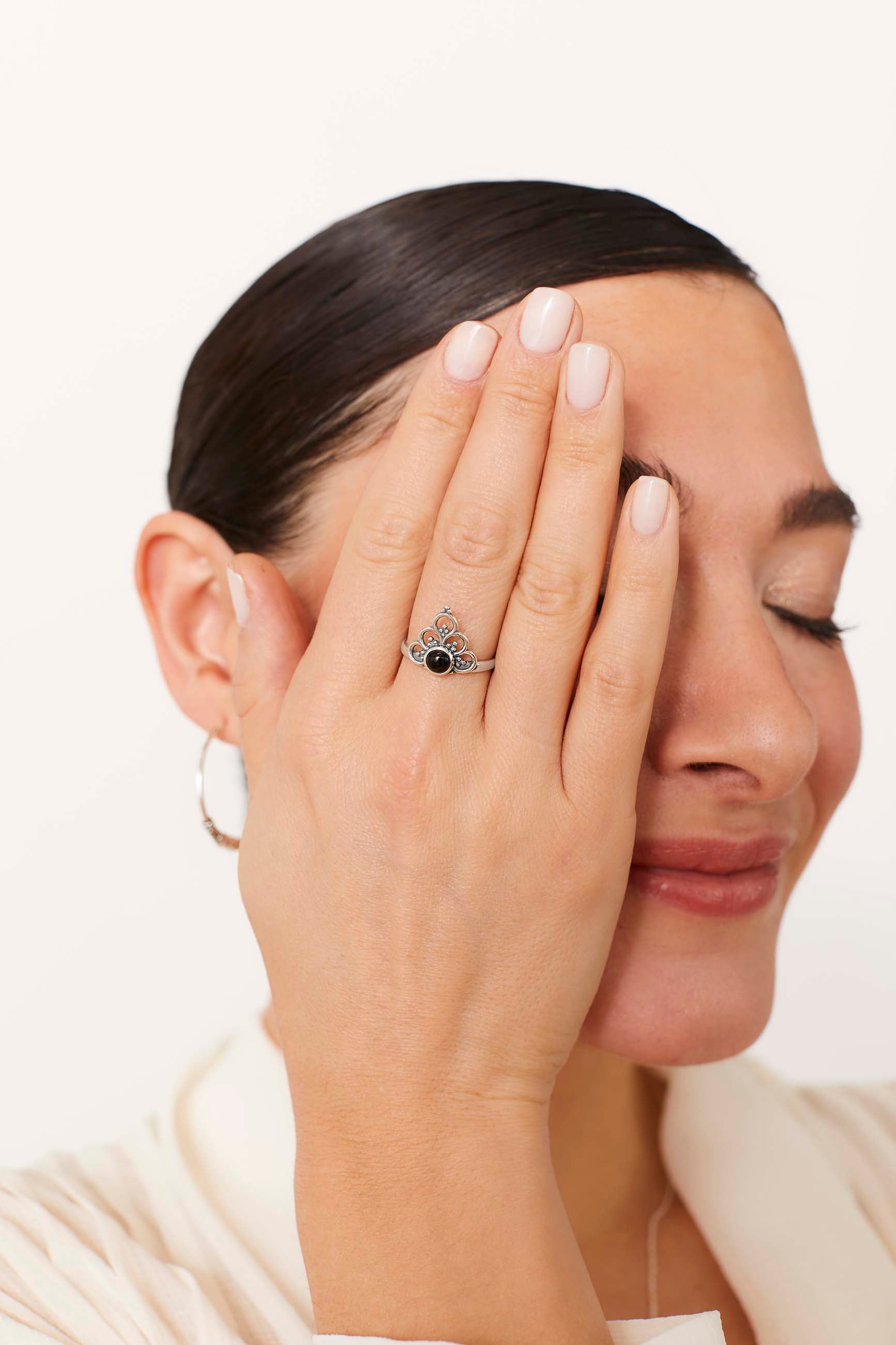 L'anello MOUNI ha un fascino particolare grazie alla splendida pietra naturale Onice al centro. Si ispira alla tradizione di Bali e alla bellezza dei mandala, che abbiamo cercato di catturare nella forma e nel rilievo.