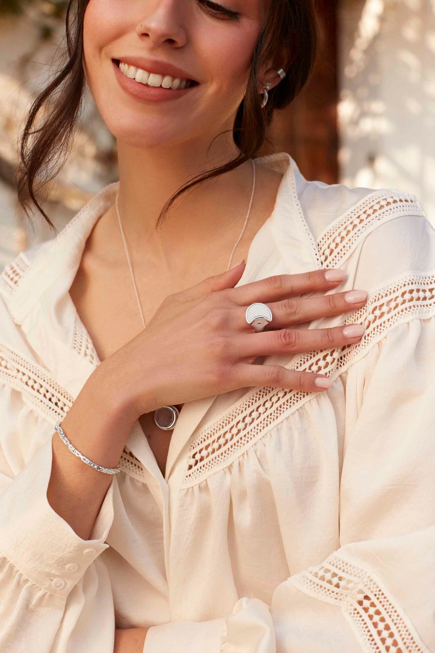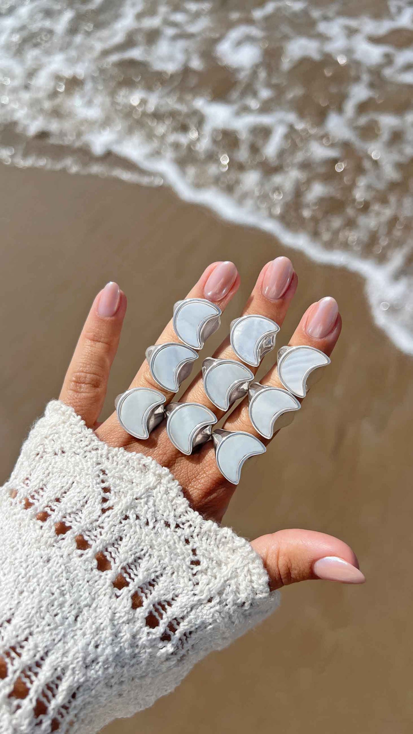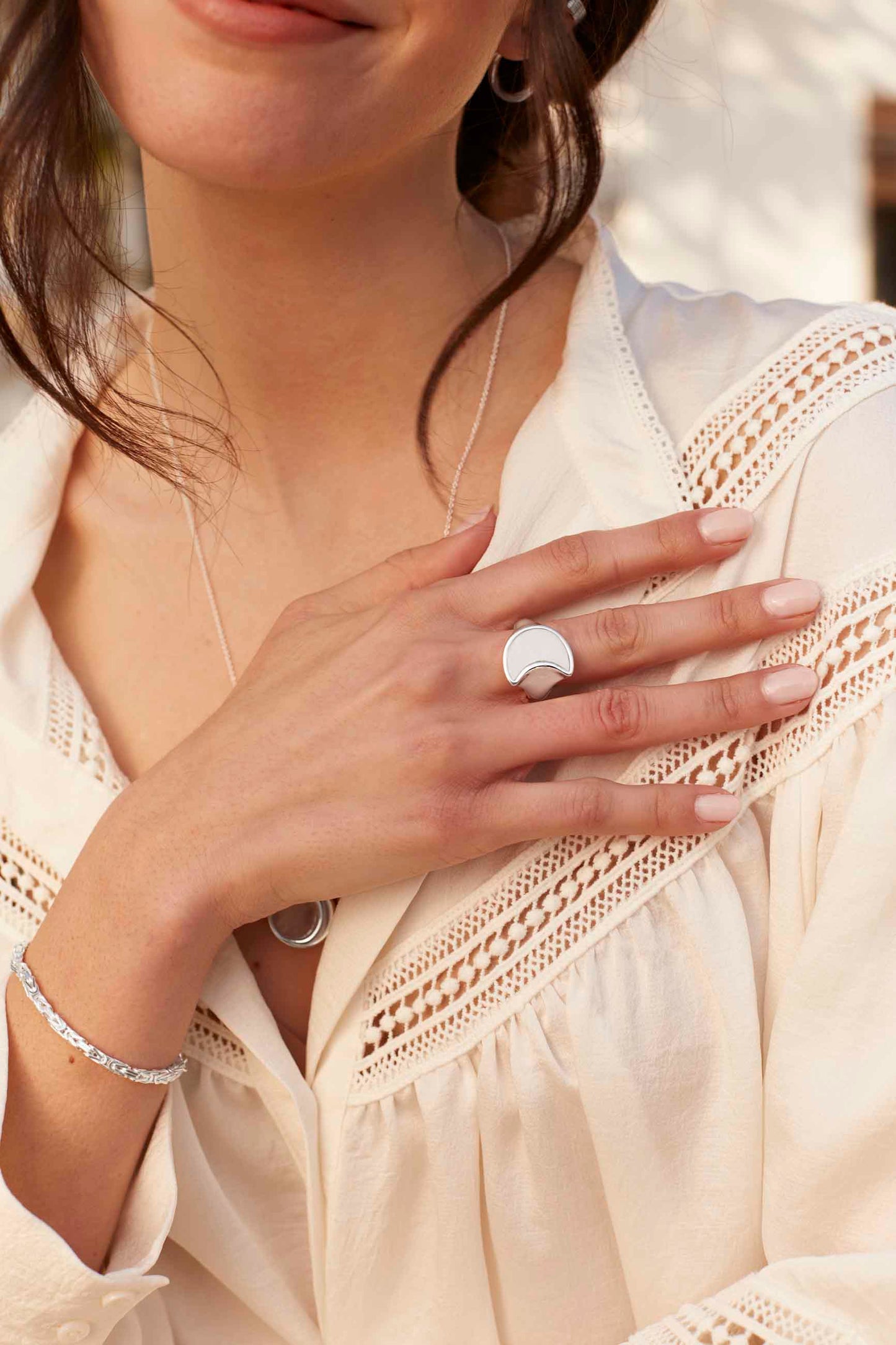 Sei uno di quelli a cui piace indossare i gioielli Maxi? Allora adorerai il nostro anello Til. Un anello che presenta disegnata una luna nella parte superiore, ed è composto da una bellissima pietra madreperla.