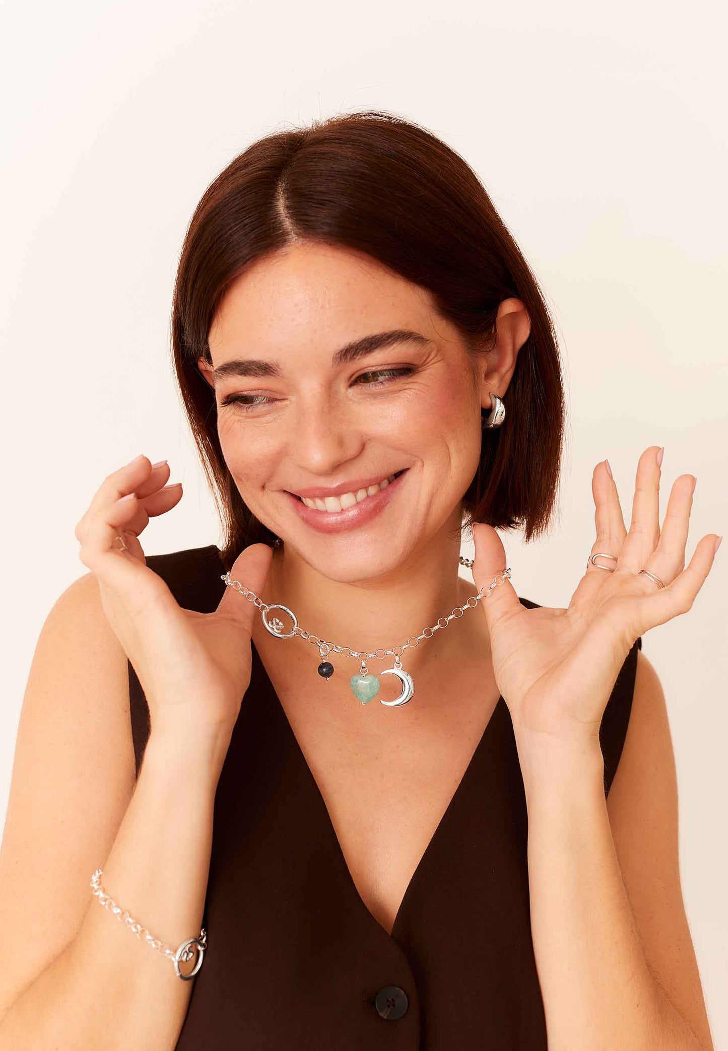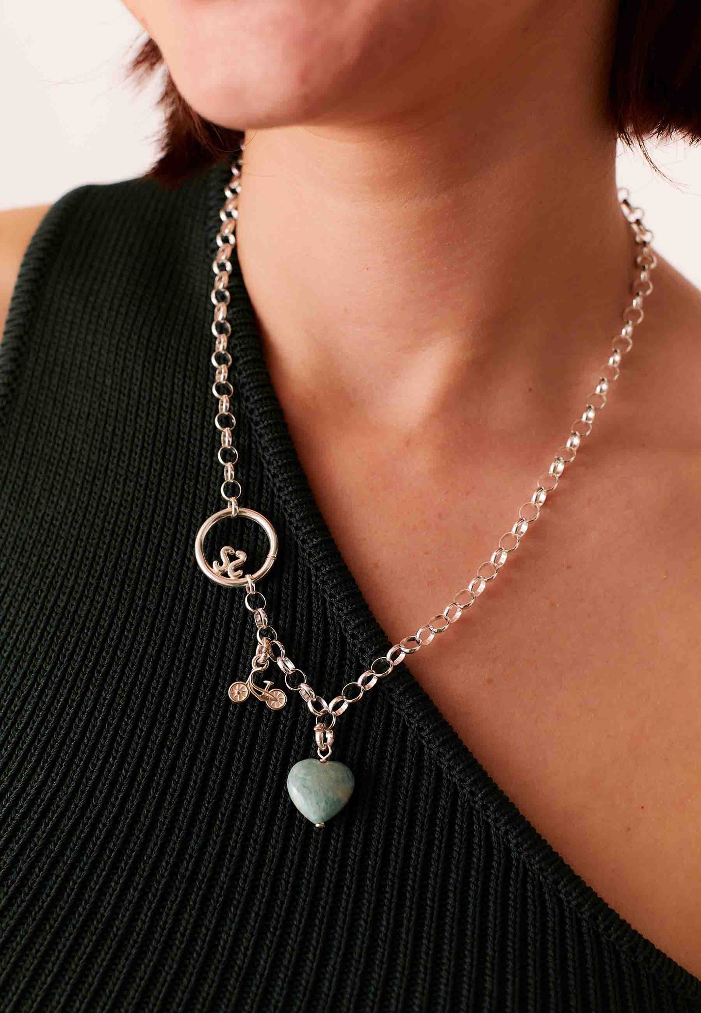 Il ciondolo Nitya , con la sua delicata forma a cuore e realizzato in pietra naturale Amazzonite, è un pezzo che trasmette dolcezza e autenticità. Progettato per essere appeso alle catene della collezione INSIGNIA , questo charm aggiunge un tocco speciale alle tue creazioni personalizzate.