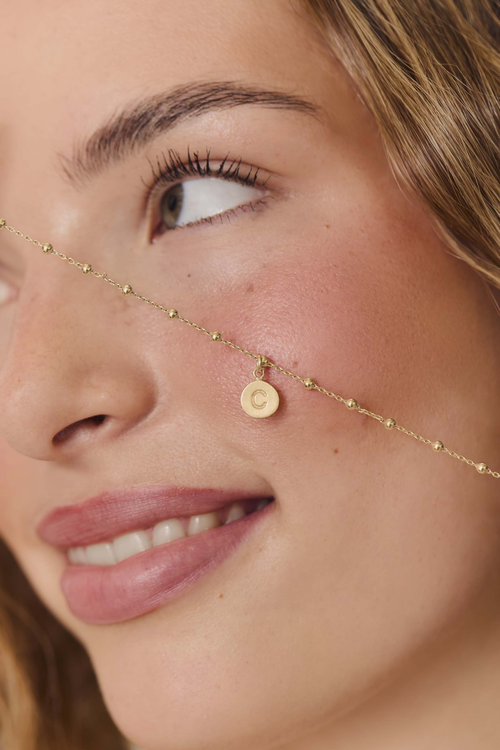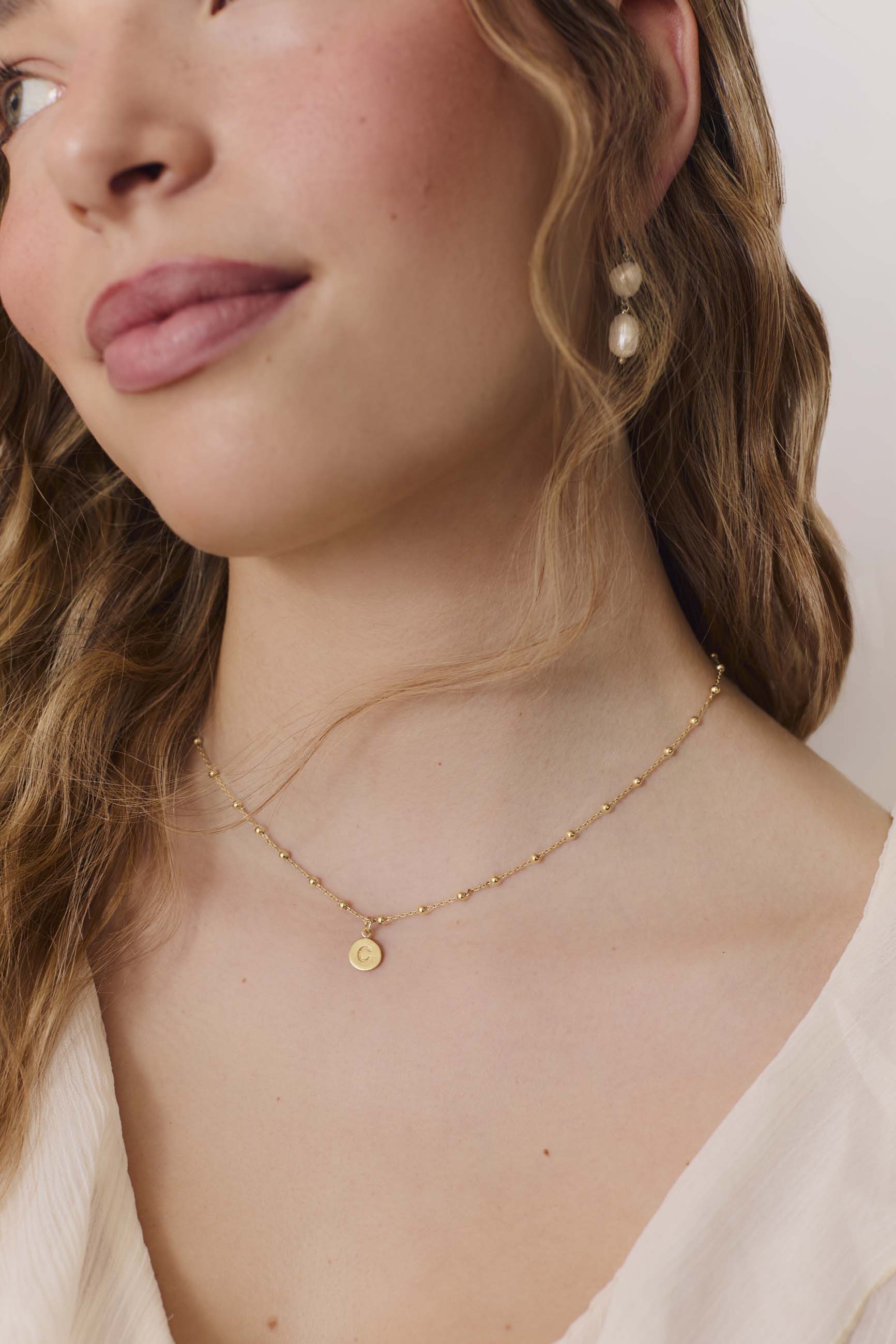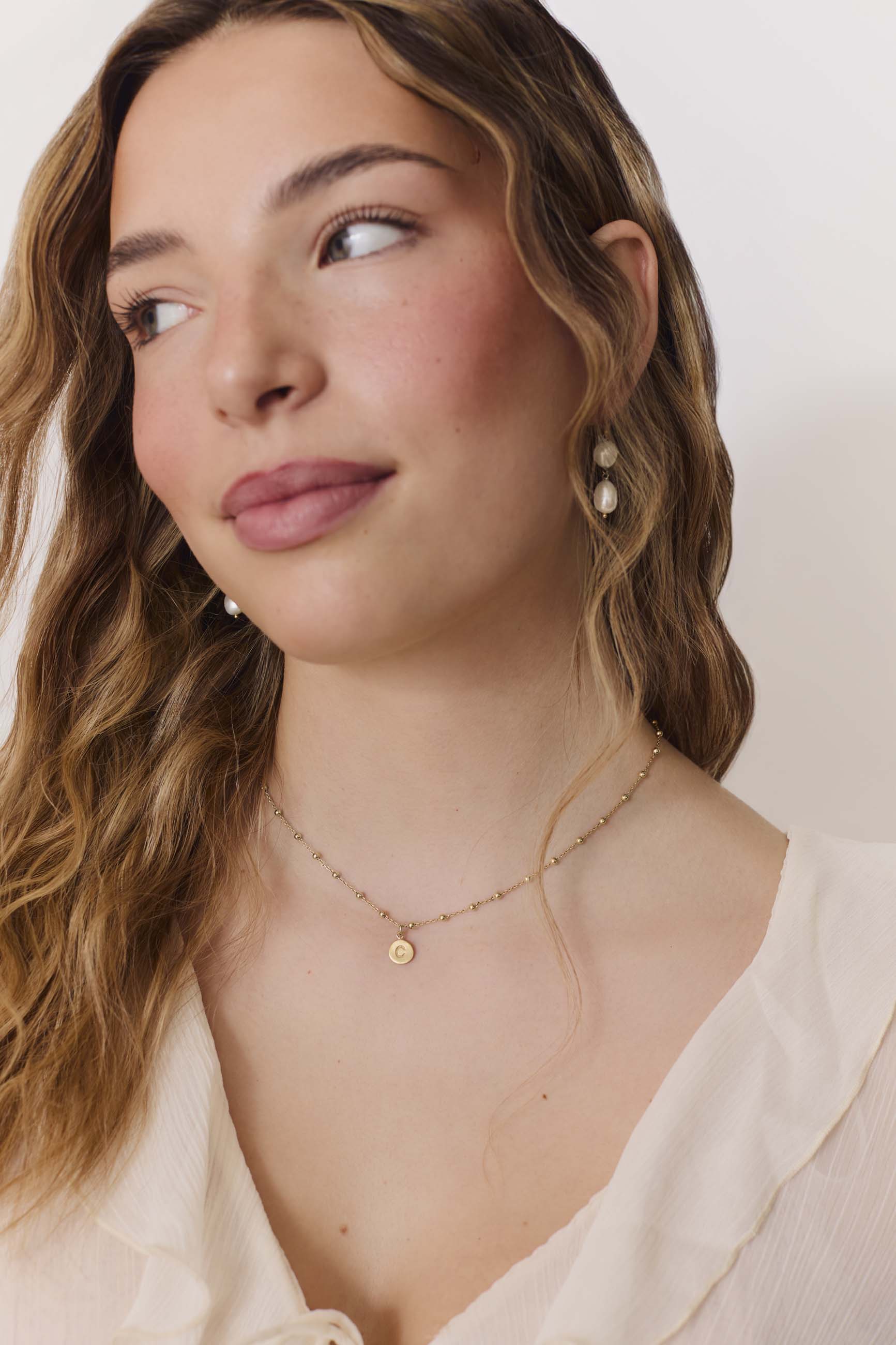 La collana personalizzabile ANUK ORO è composta da una catena sottile con perline intercalate. Dalla catena pende una medaglietta tonda con l'iniziale della tua scelta incisa sopra. Puoi scegliere l'iniziale che ti piace di più!