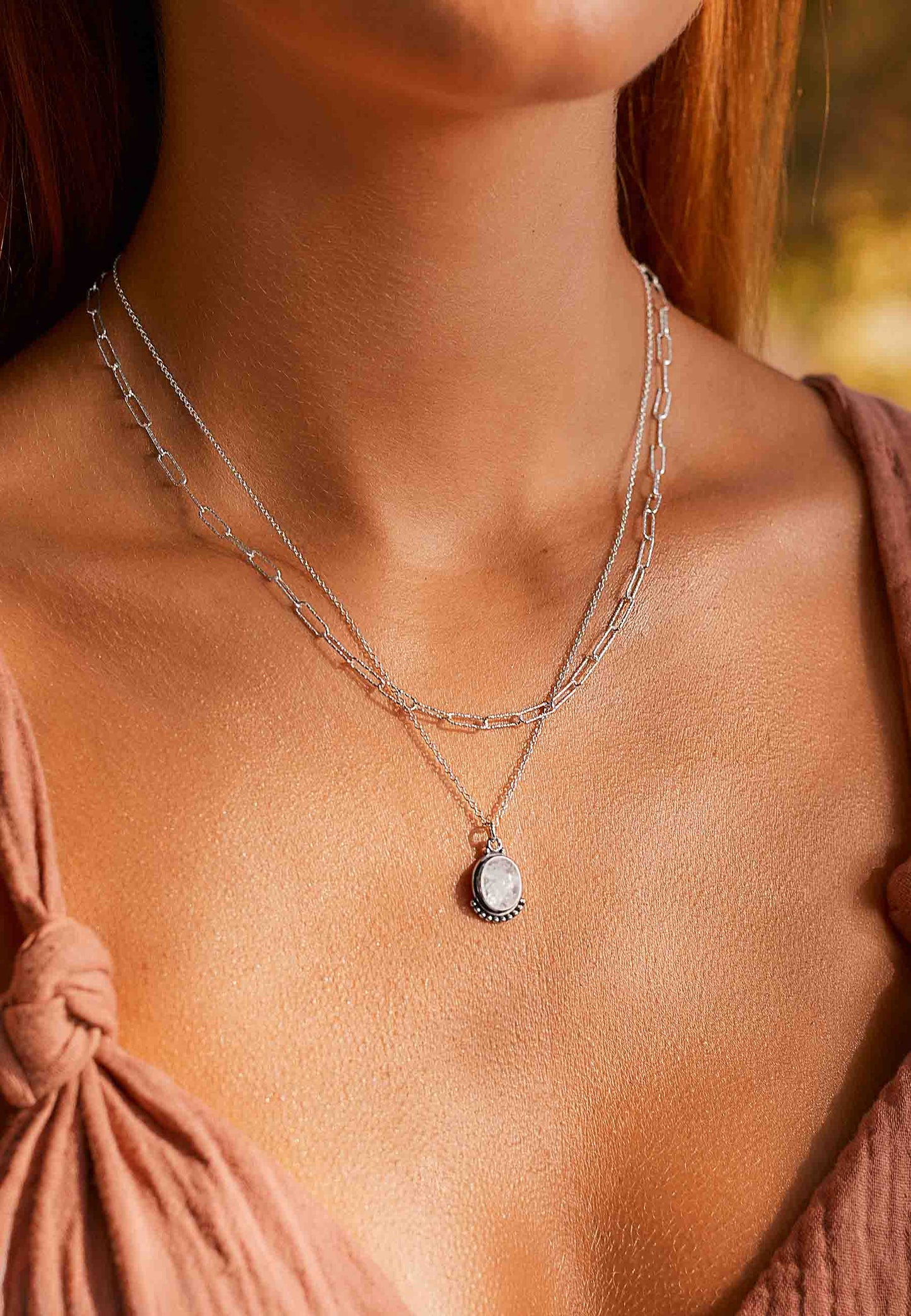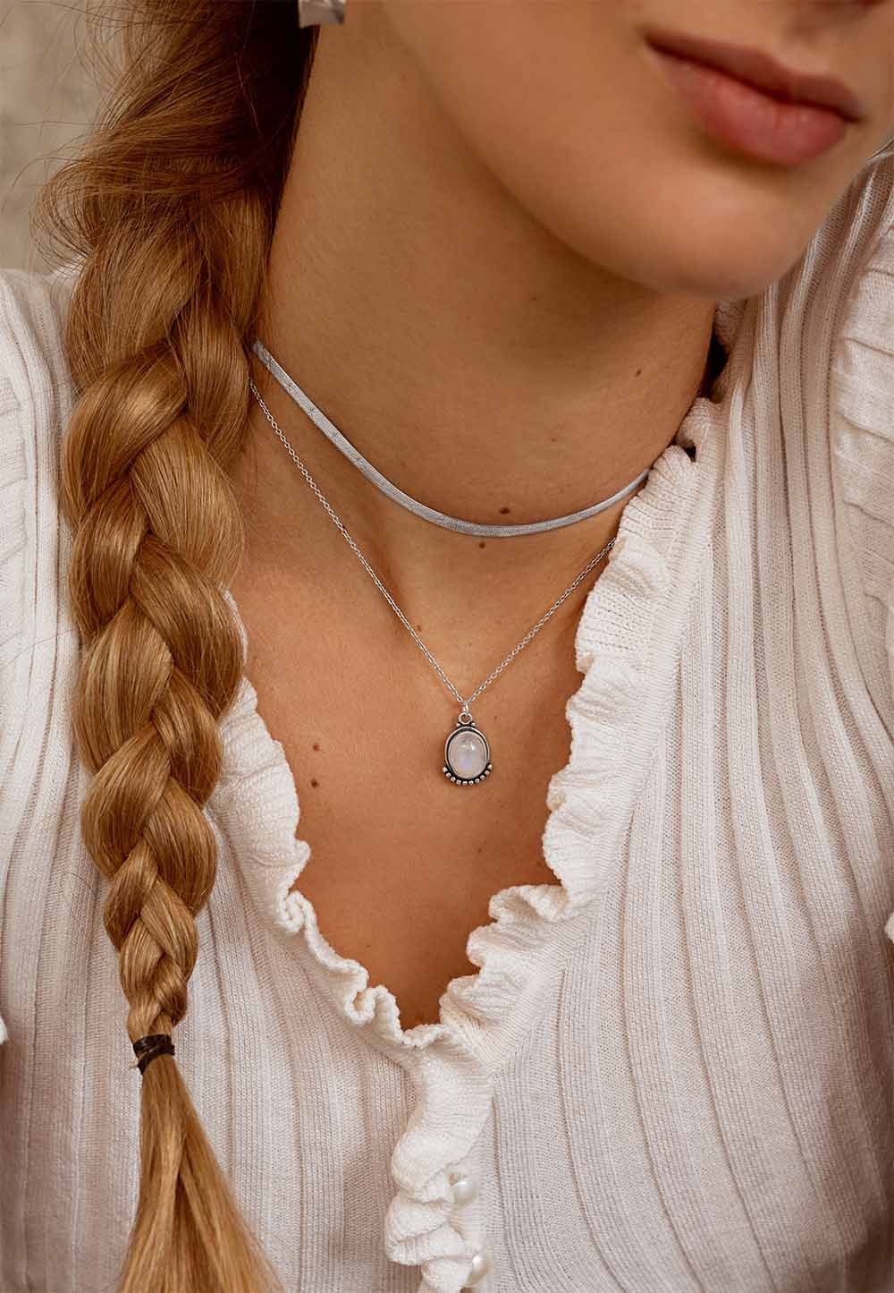 La Collana NITI è formata da una catena in Argento Sterling 925 e Pietra di Luna Naturale. È un gioiello molto attraente e diverso, in quanto ha la qualità camaleontica di cambiare colore a seconda dell'ambiente. Questa pietra preziosa ha una magia speciale!