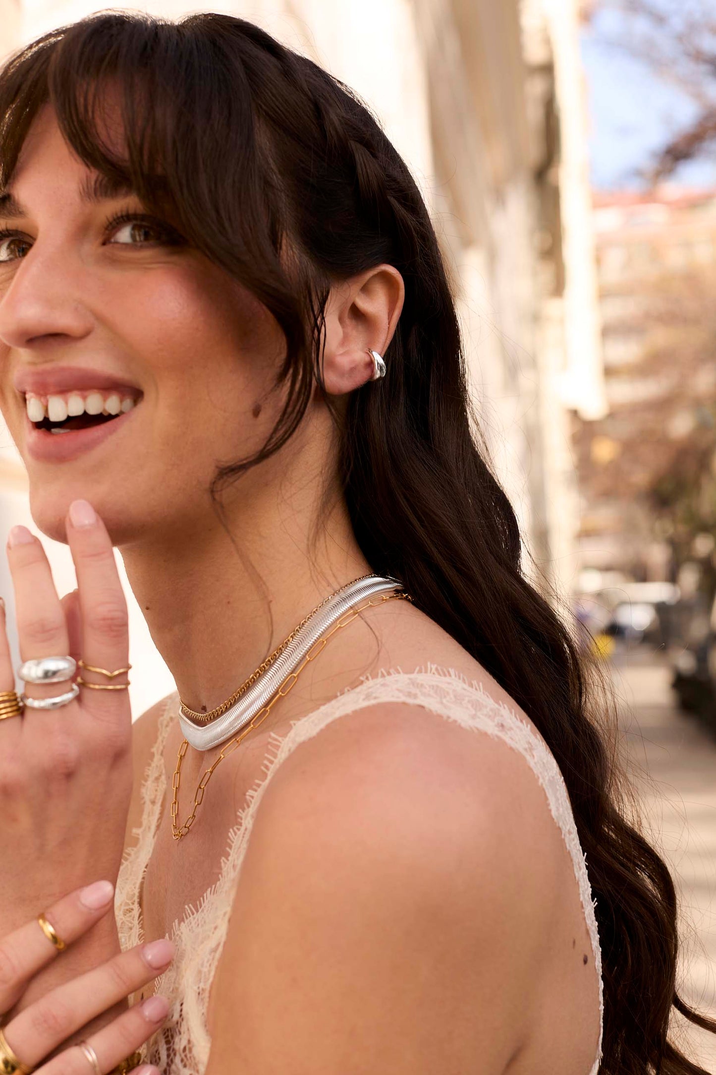 La sua forma voluminosa e l'effetto gonfio valorizzano l'orecchio senza bisogno di foro, ideale per chi cerca la comodità senza rinunciare allo stile. Inoltre, è scavato all'interno , quindi non pesa nulla.