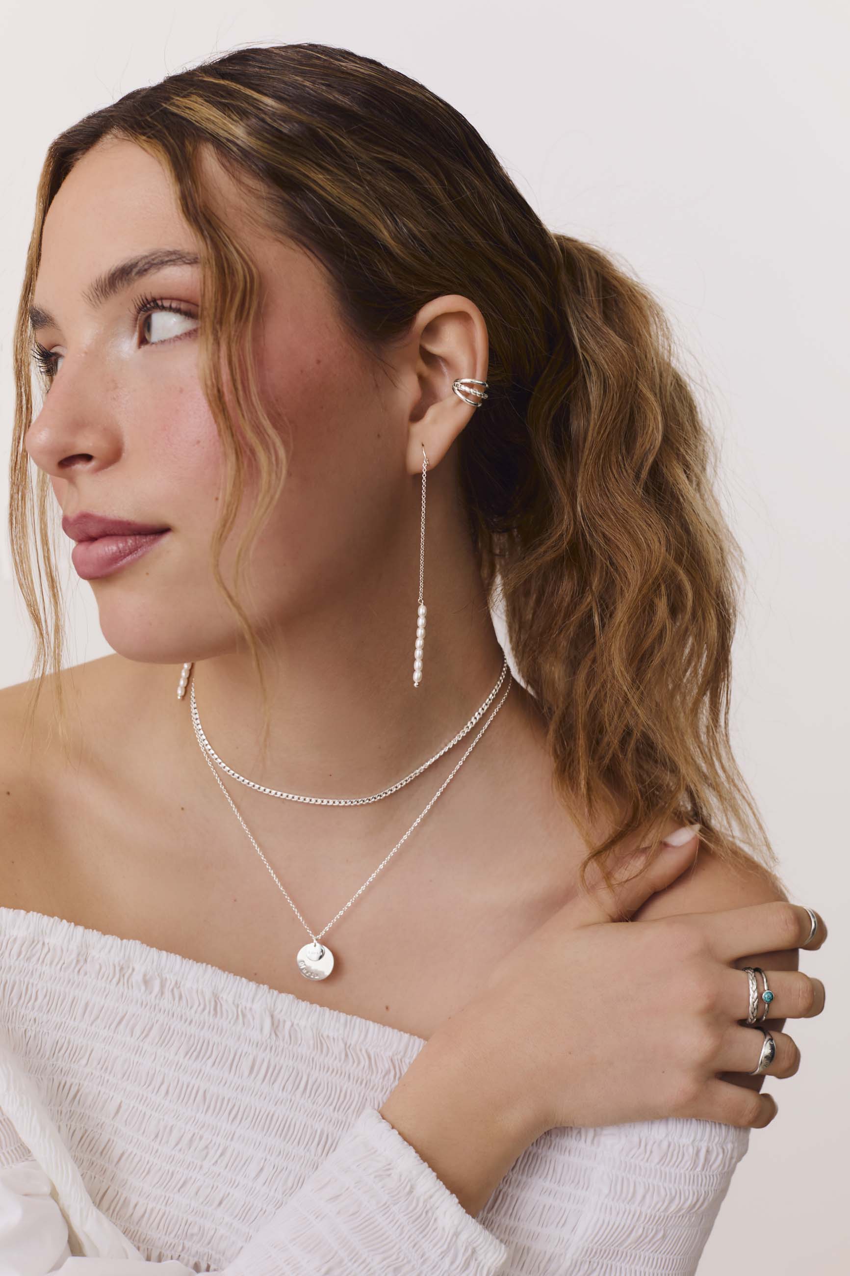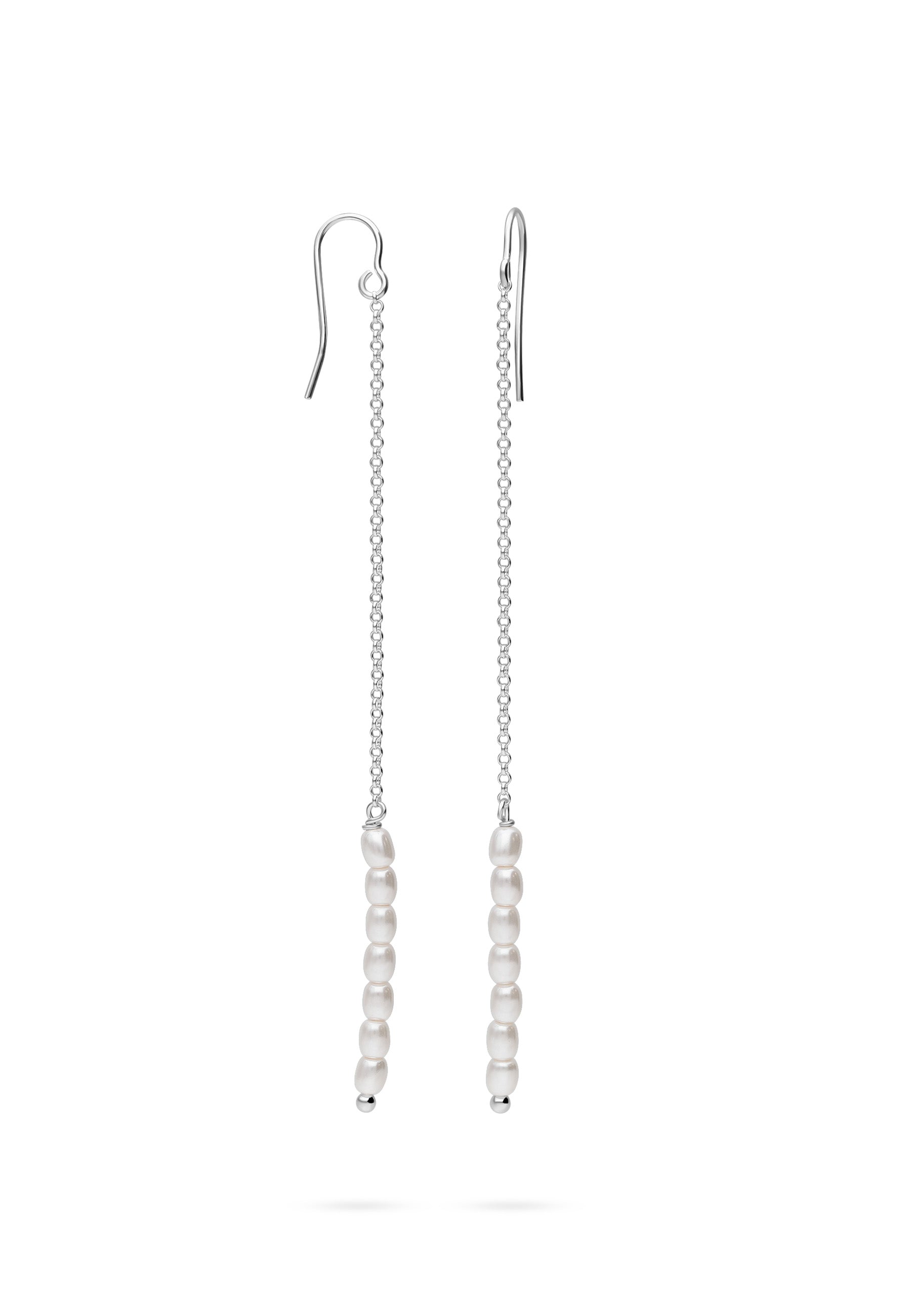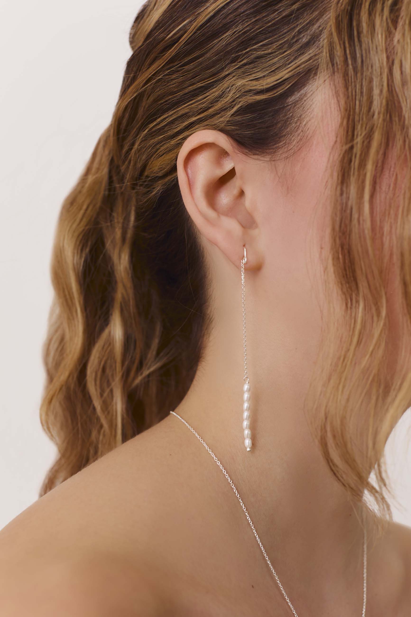 Gli orecchini Bhuma in argento sterling 925 presentano una sottile catena che culmina in sei accattivanti perle , creando un tocco di eleganza.