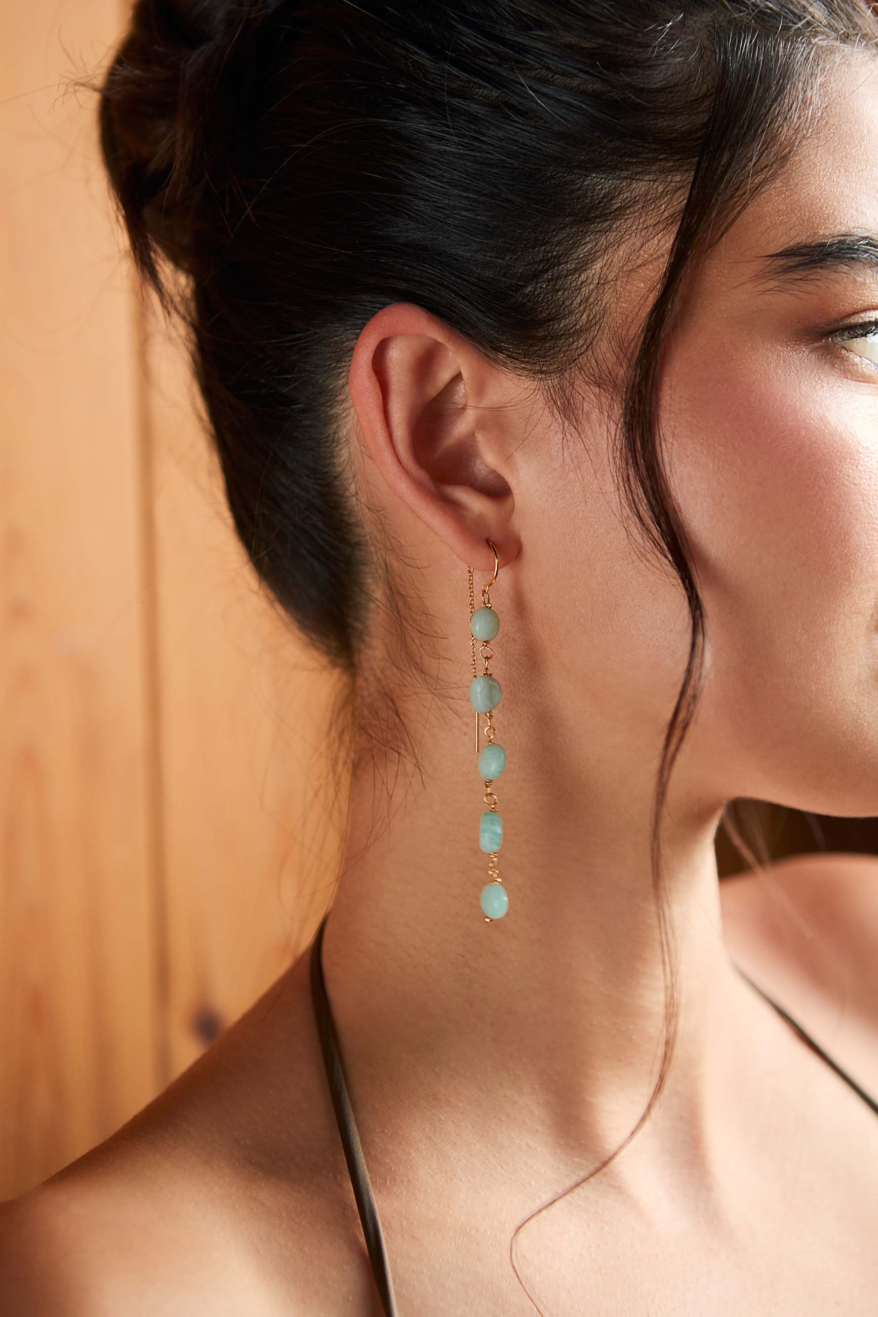 Questi orecchini, realizzati in argento sterling 925 oro, fondono la naturalezza con la semplicità . Presenta una sottile catena che unisce sei accattivanti amazzoniti di una tonalità verde brillante.