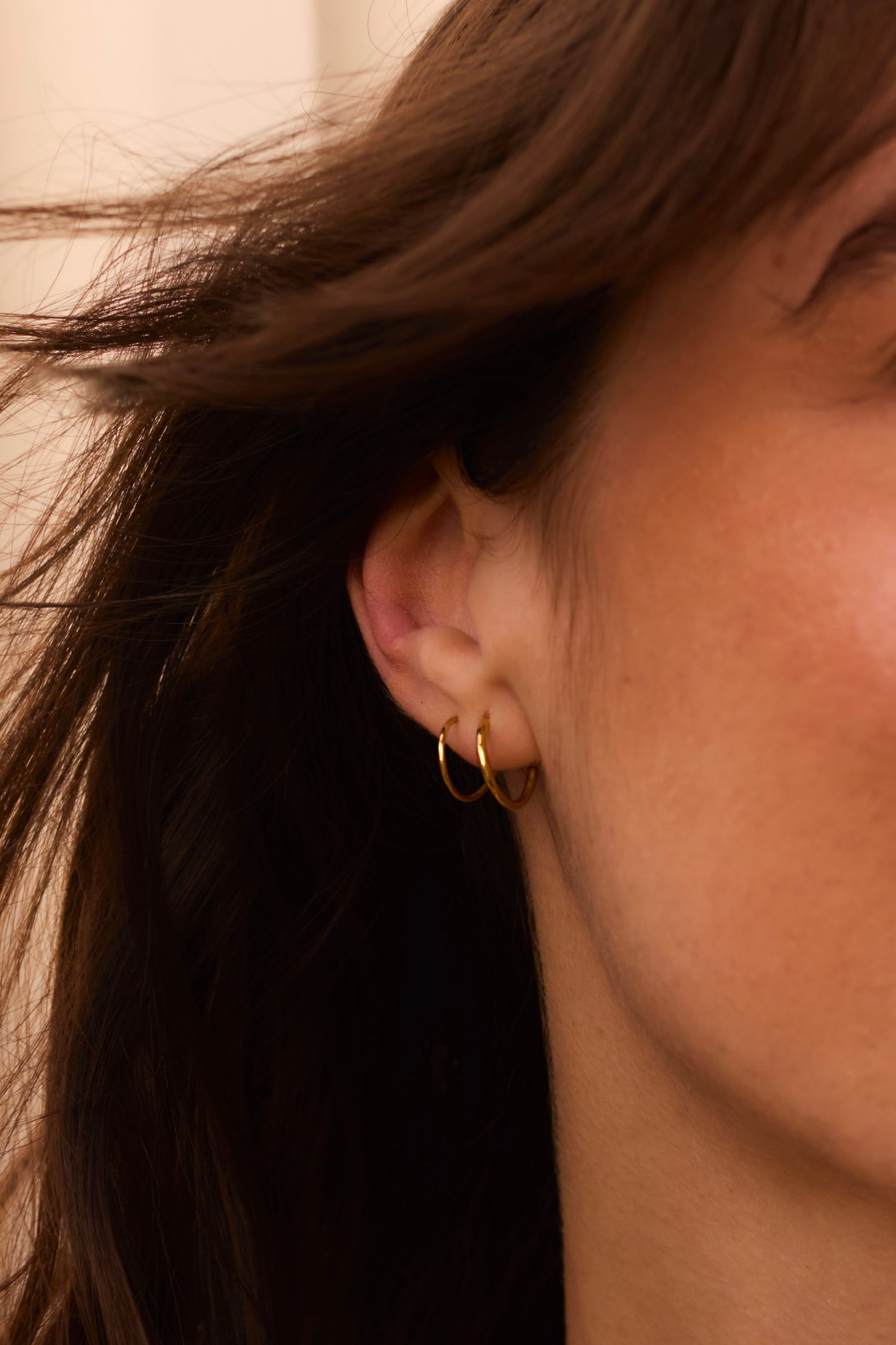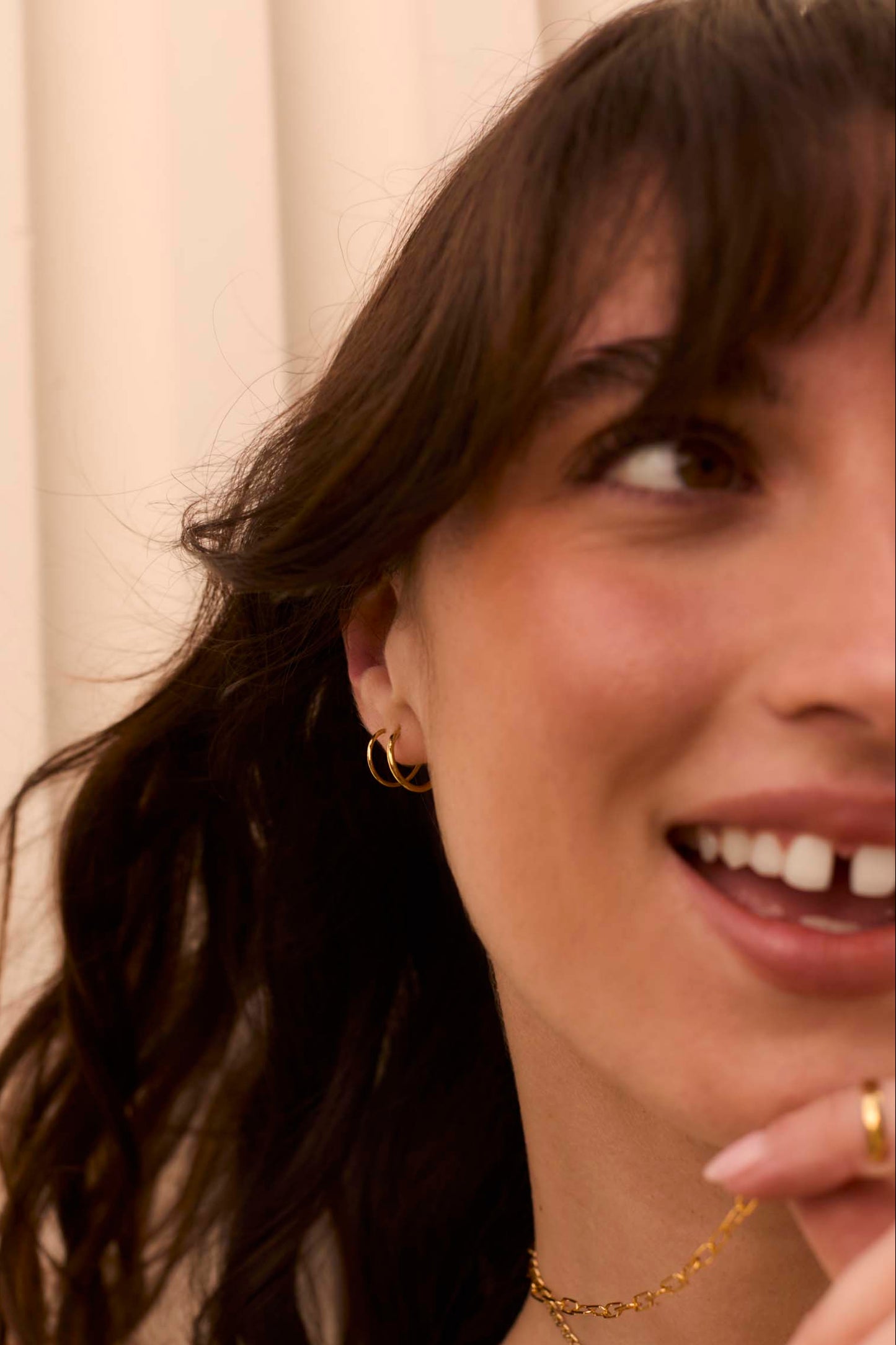 Il doppio cerchio dorato KUNDALE per l'orecchio destro è il tocco luminoso che trasforma qualsiasi look. Il suo design a doppio cerchio consente di ottenere l'aspetto di due orecchini in uno, senza dover fare più di un foro.