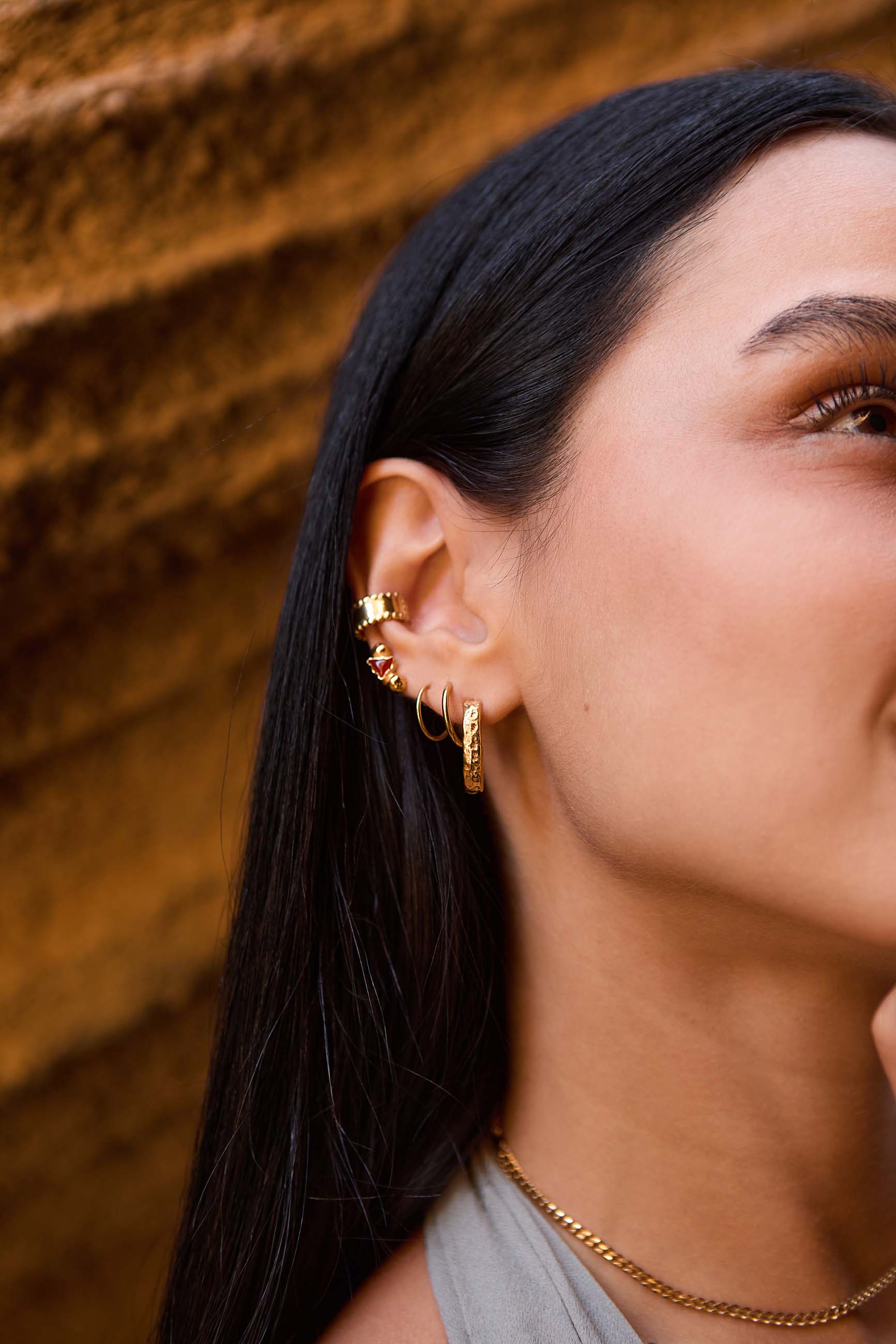 I Orecchini Jaivik sono realizzati in argento sterling 925 placcato in oro 22k e presentano una finitura con texture sabbiosa che conferisce loro carattere e stile etnico. Con un diametro di 20 mm, il loro design allungato offre una forma diversa ed elegante rispetto al tipico cerchio rotondo.