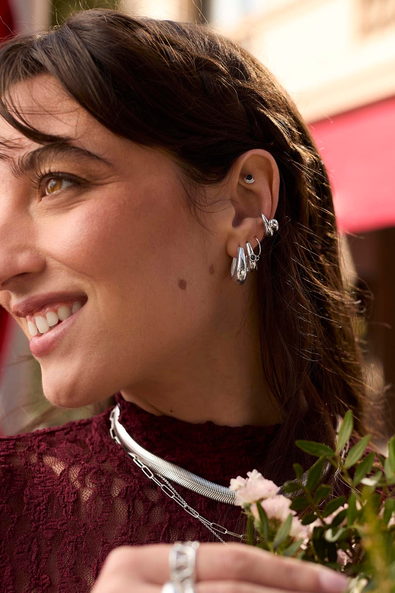La sua forma bombata e leggera lo rende comodo da indossare per ore, e la sua chiusura click garantisce una perfetta tenuta. Perfetto per il secondo buco dell’orecchio, abbinato a un cerchio più grande, oppure da solo per un look più delicato.