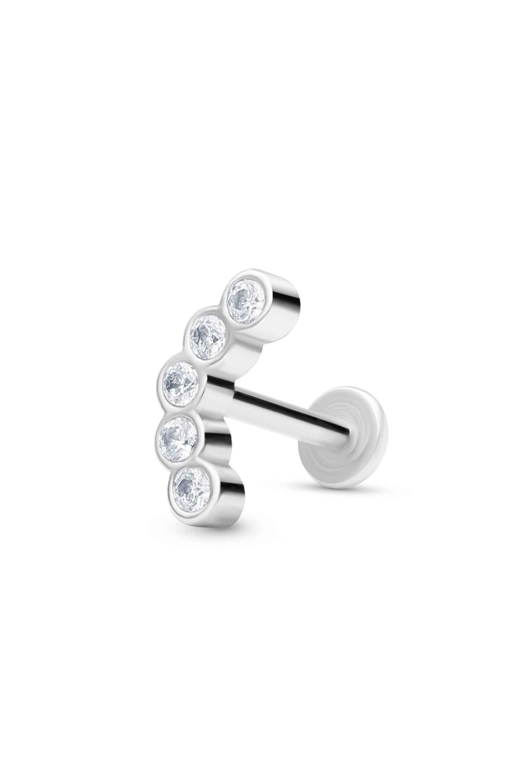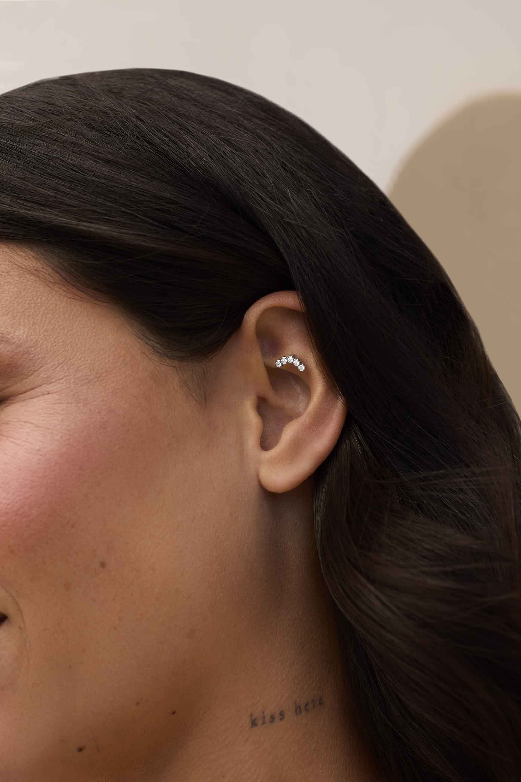La sua forma leggermente curva incorpora cinque piccoli zirconi allineati , creando una linea brillante che segue la curvatura dell'orecchio o decora elegantemente il trago. La disposizione delle pietre conferisce luce e struttura, mantenendo uno stile minimalista ma ricco di dettagli.