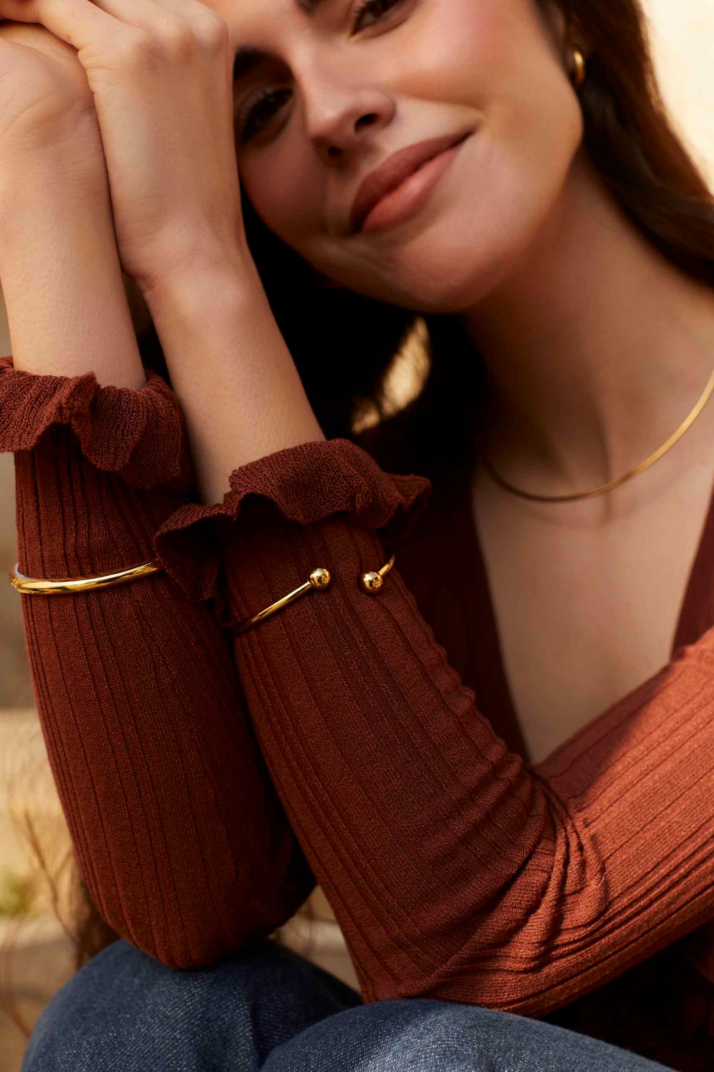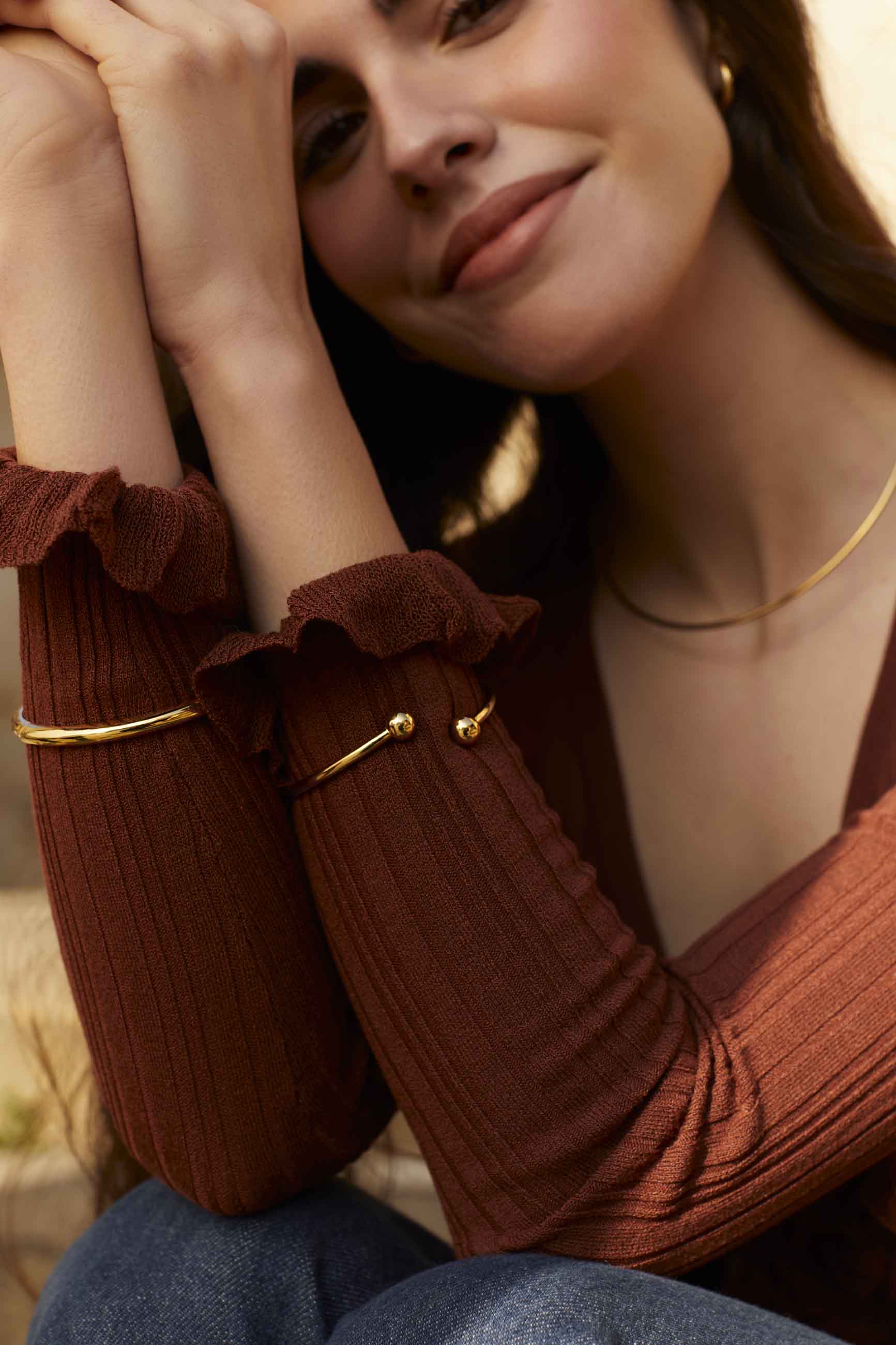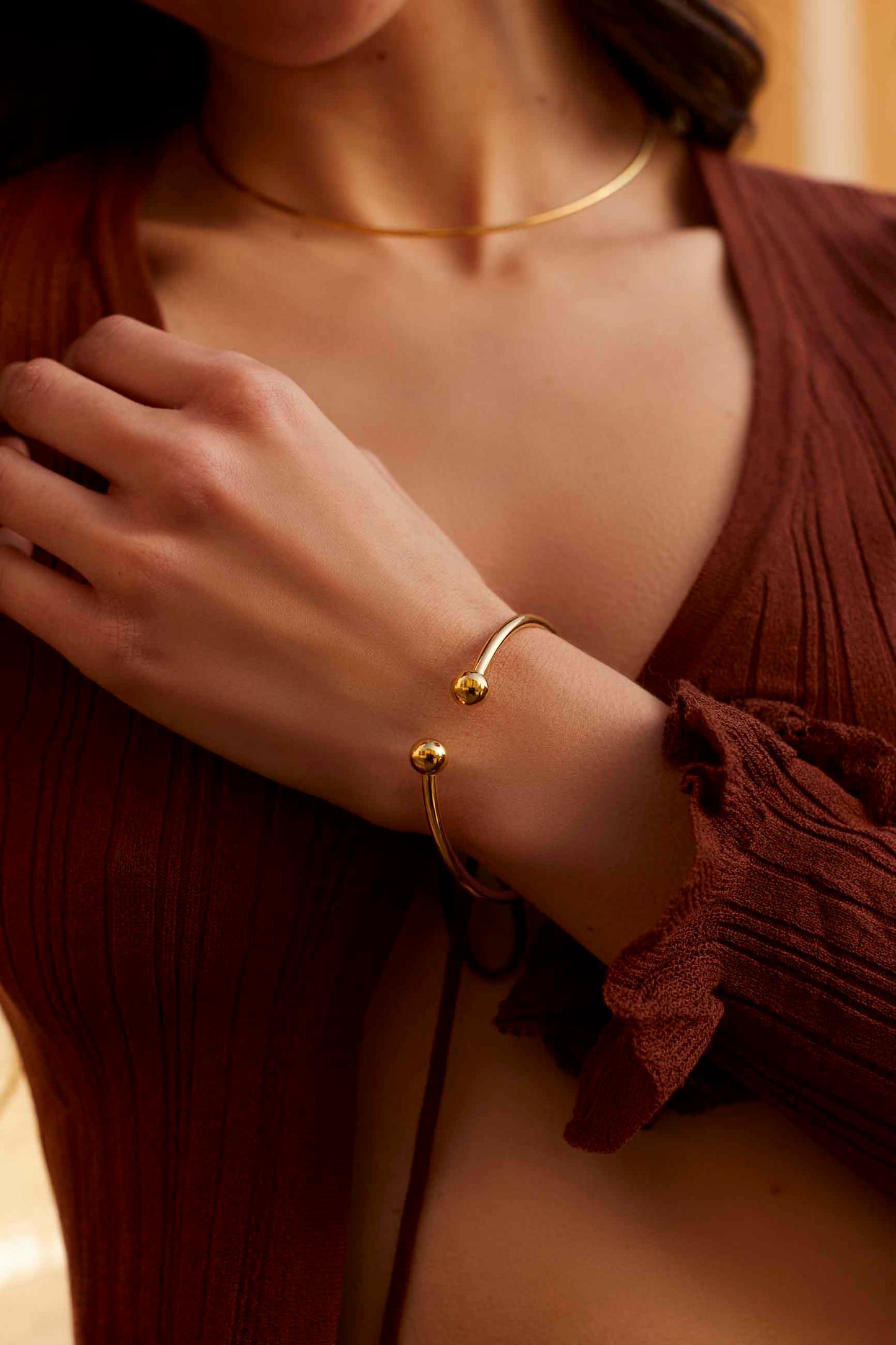 Il bracciale MALTI ORO è uno dei nostri gioielli più semplici. Il suo disegno spicca per le sue palline di grandi dimensioni agli estremi. E non ha alcun rilievo o dettaglio, è totalmente liscia!